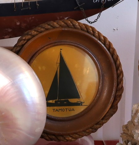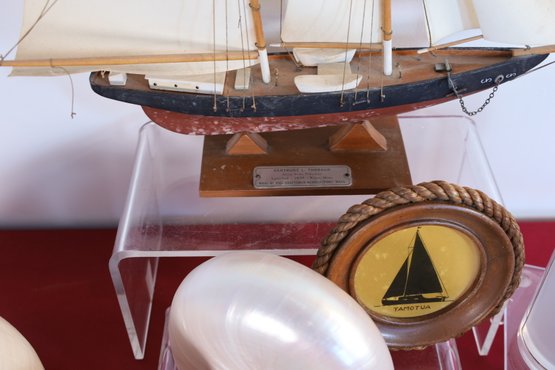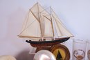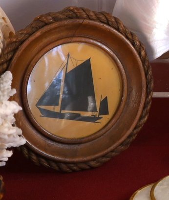 Pair of small round wooden-framed sailboat silhouettes - wear and tear conditions - 5" D