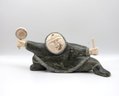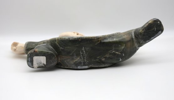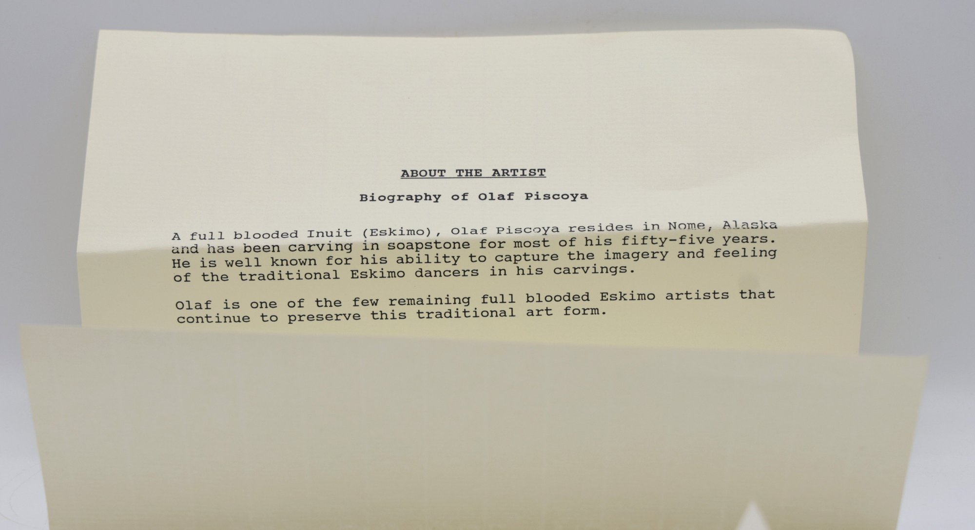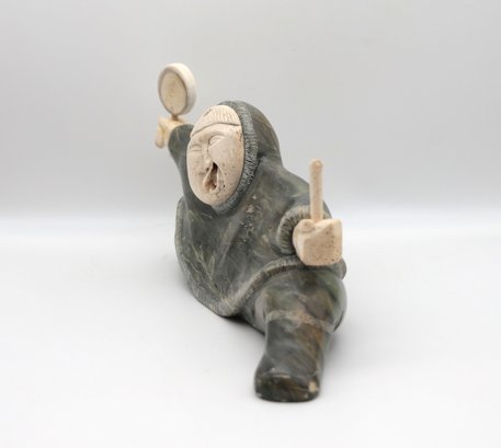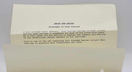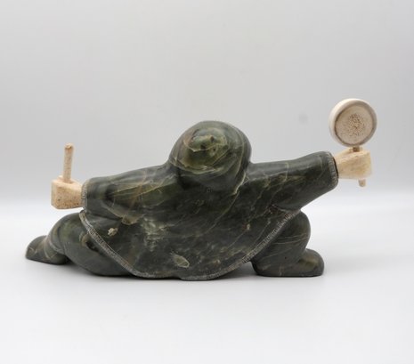 Olaf Pisoya Eskimo Hand Carved Inuit Figure made of bone and green soapstone. . Signed on base and Comes with paperwork.