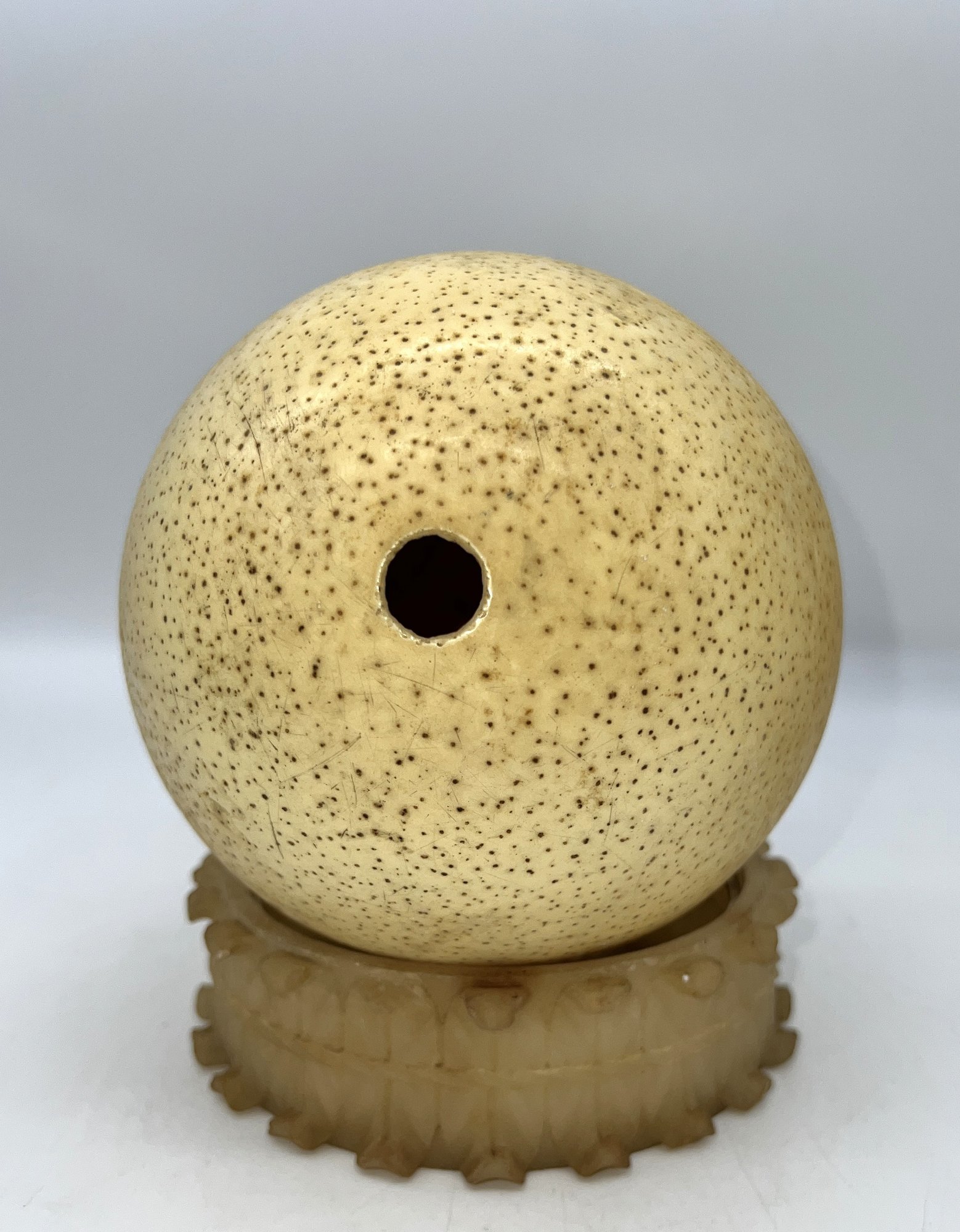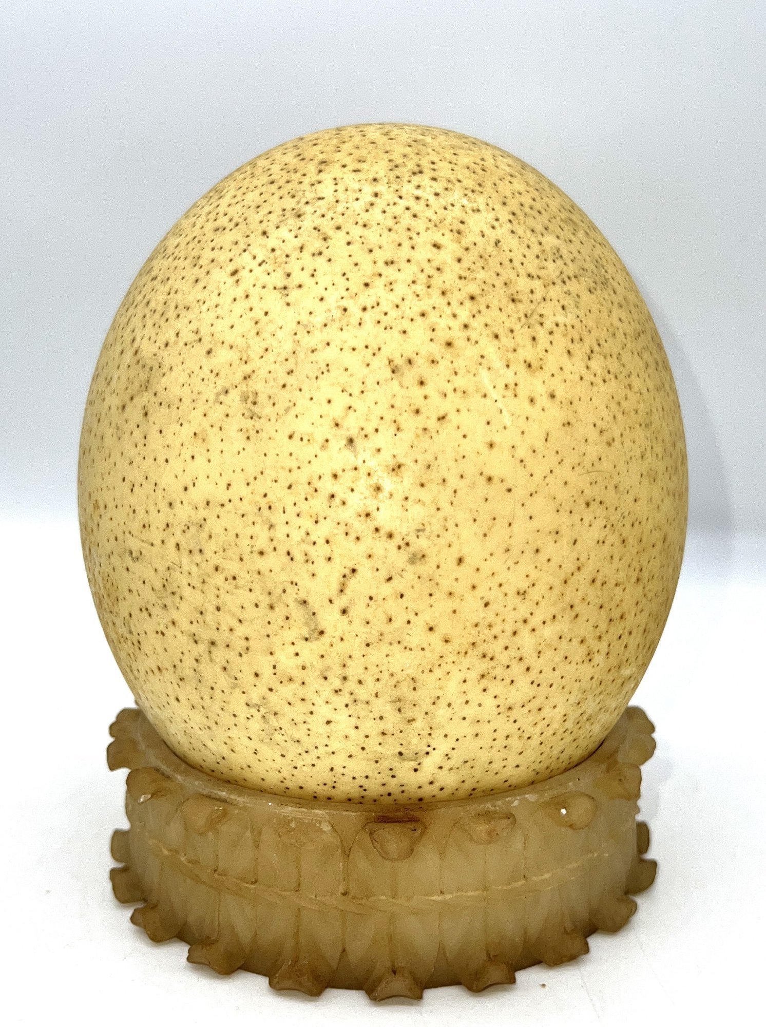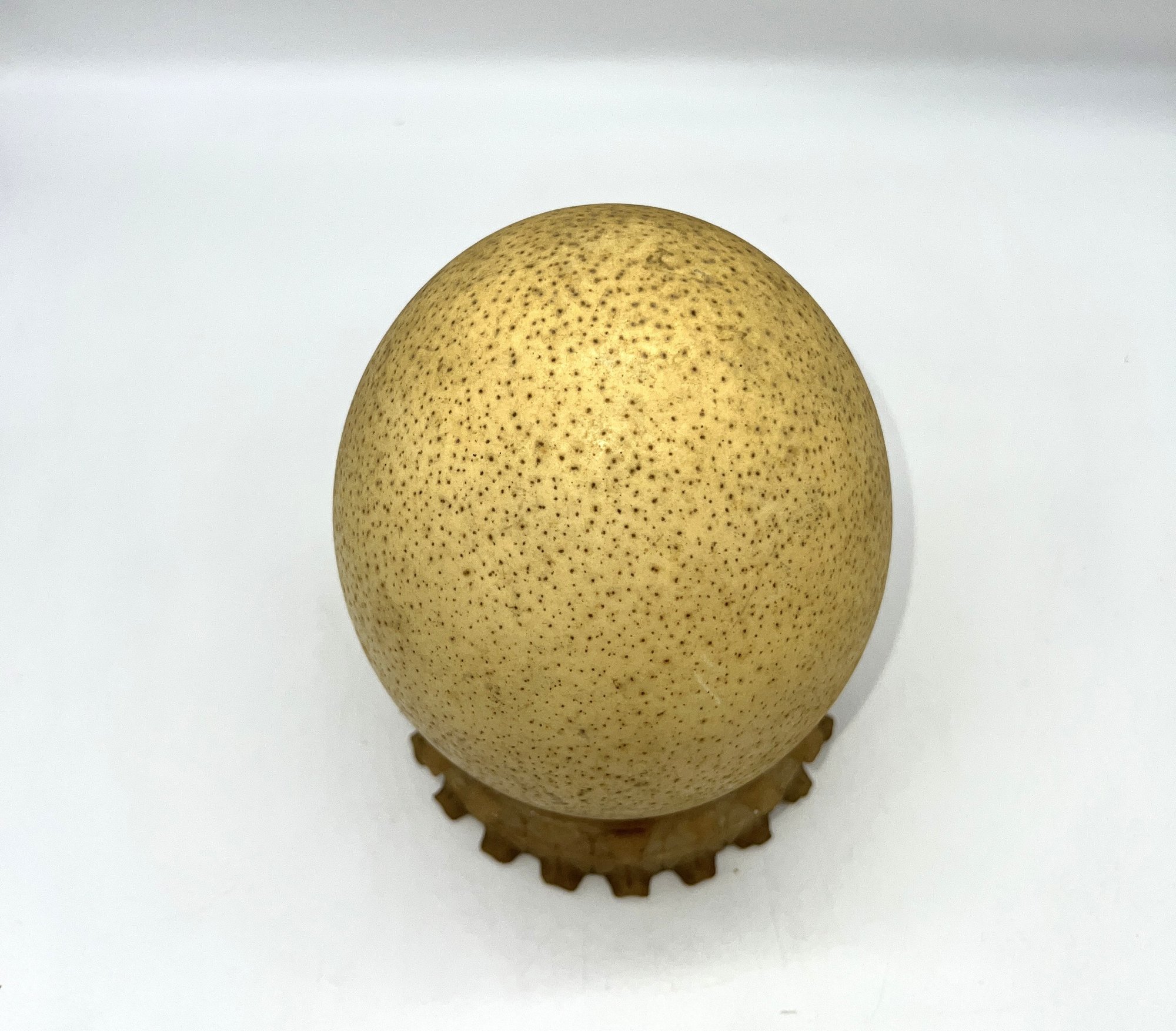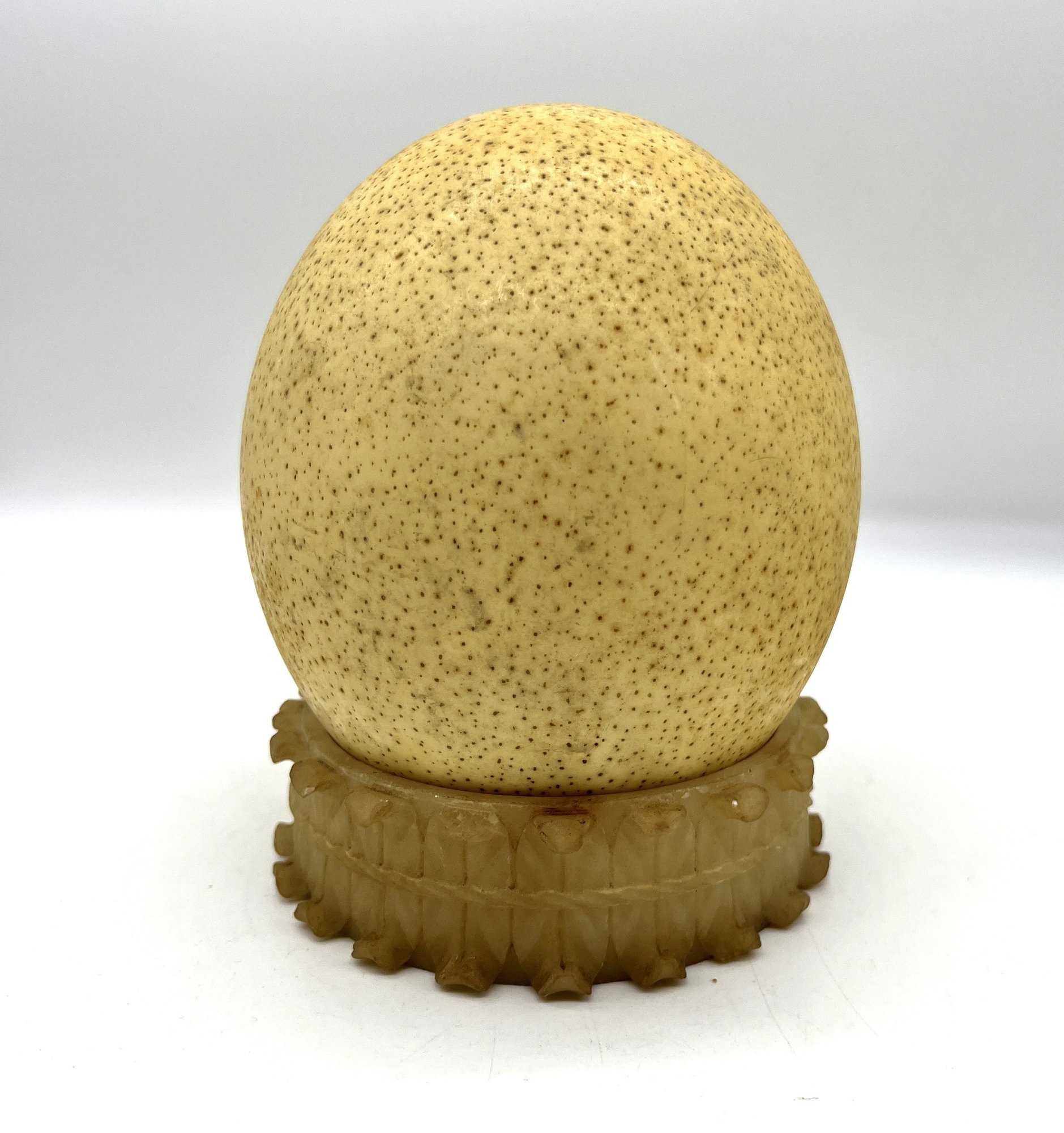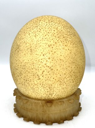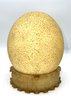 Ostrich egg in nice condition with stand, measuring 6"H x 5.5"D.