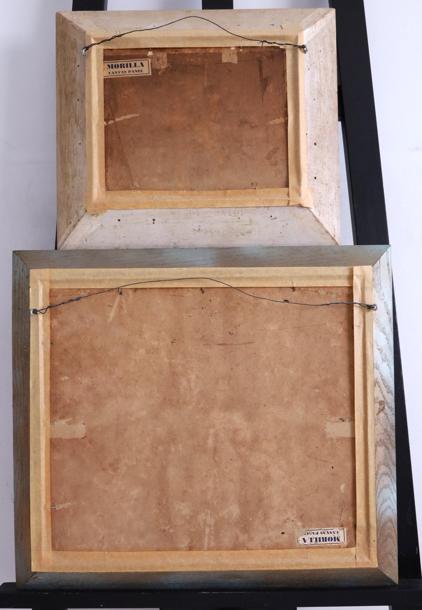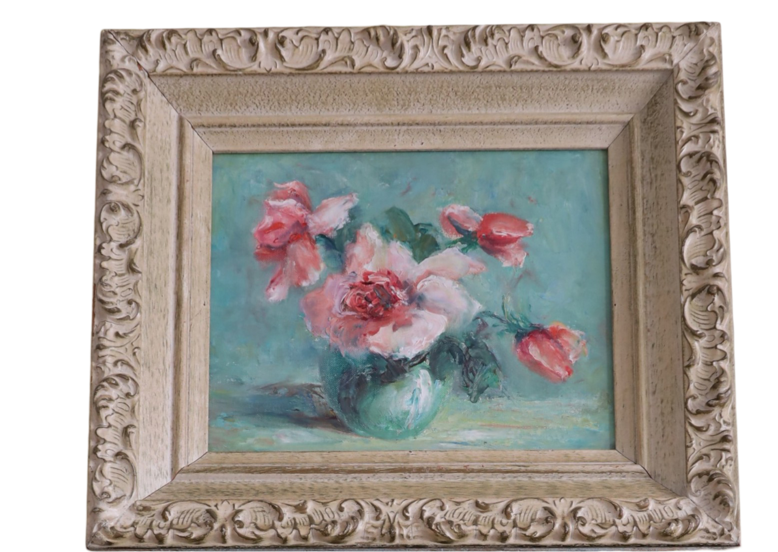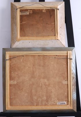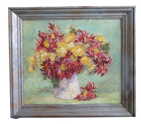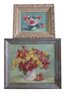 A vintage set of two oil paintings on board featuring flowers, both unsigned. The larger piece measures 19.25" x 17.25" and is framed, while the smaller one is 14.5" x 12.5" and also framed.