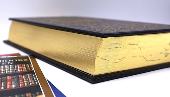 Leather Bound. It is accented in 22kt gold and printed on archival paper with gilded edges. Sewn pages – not just glued like ordinary books.