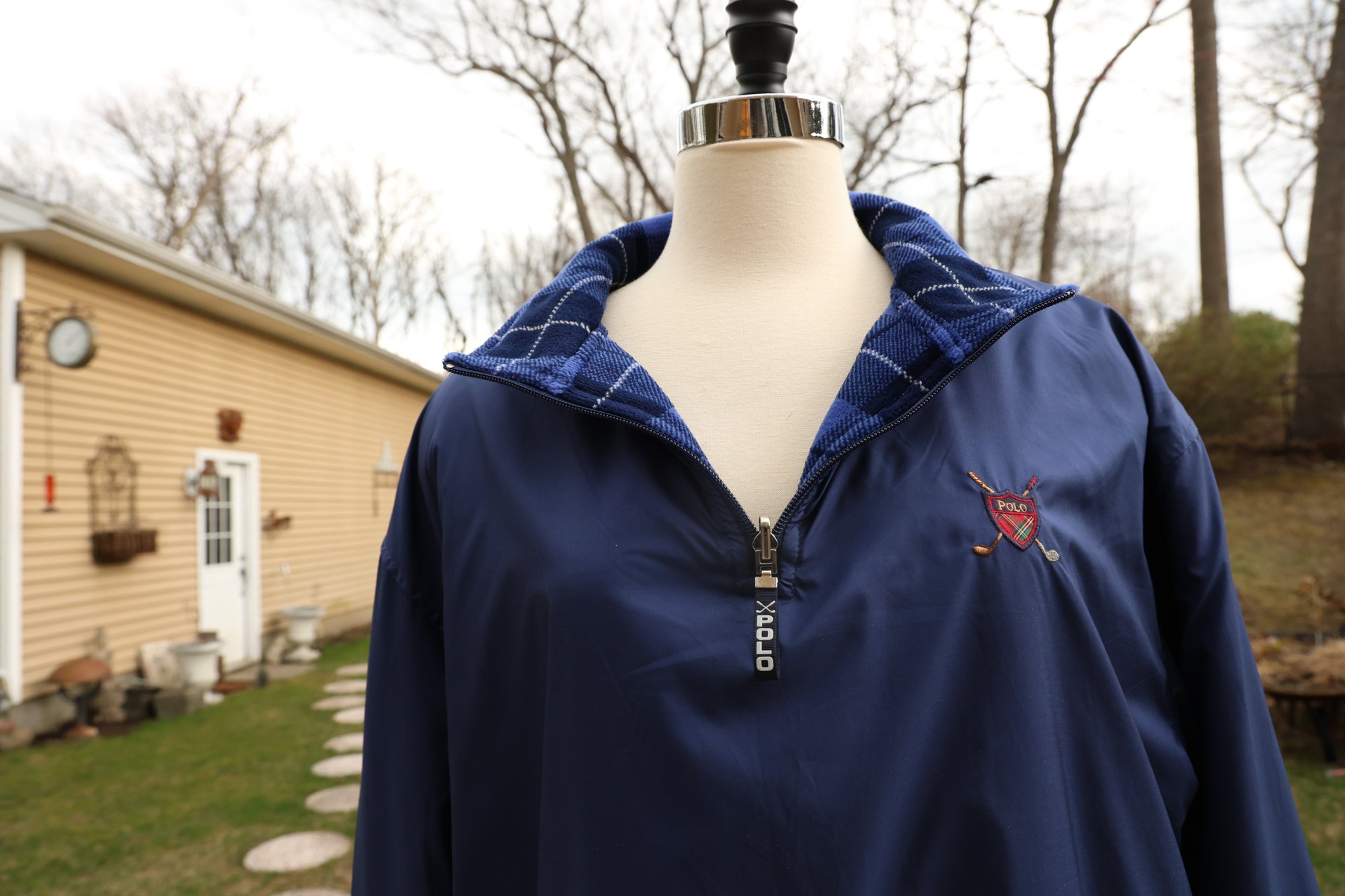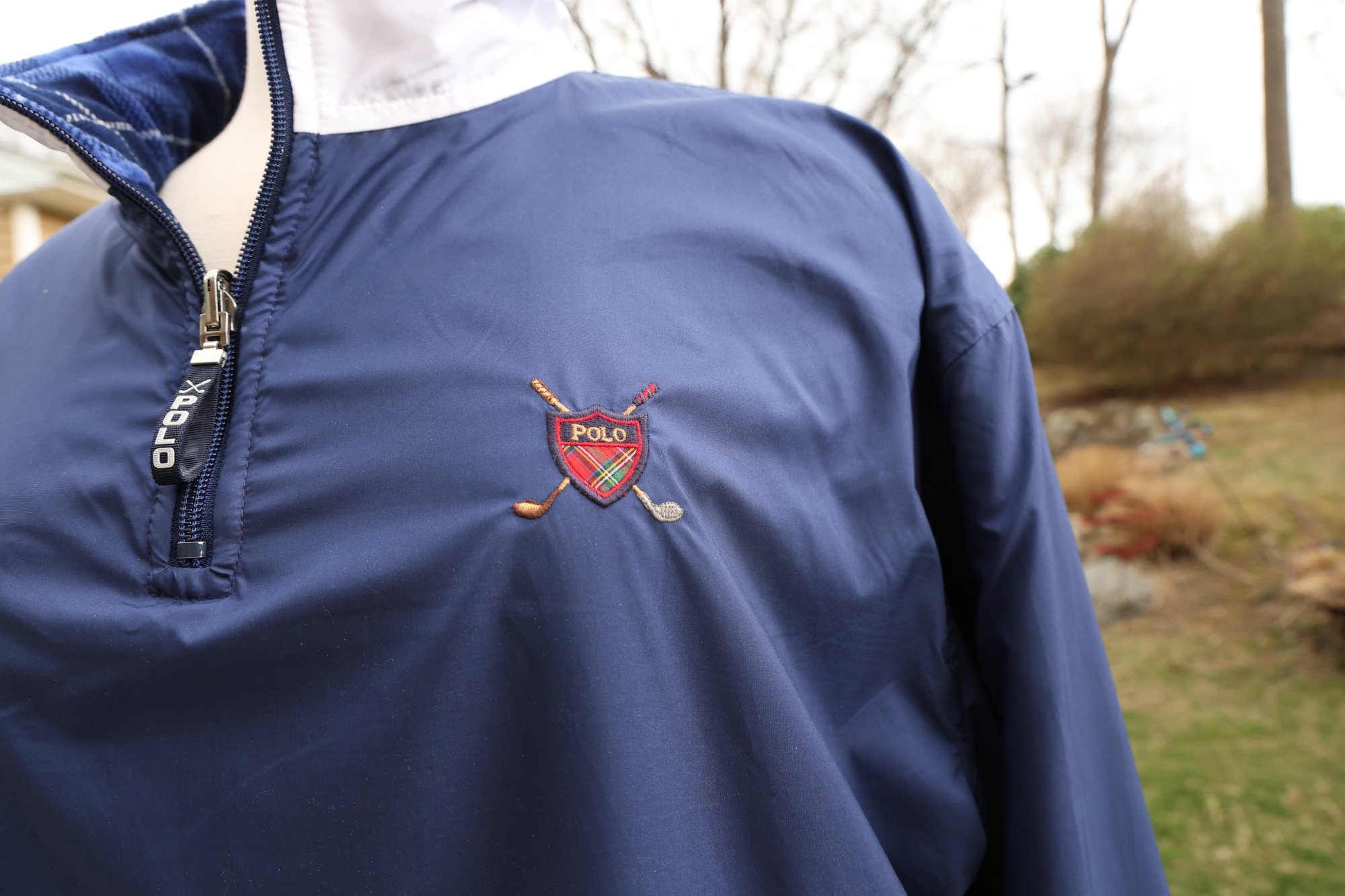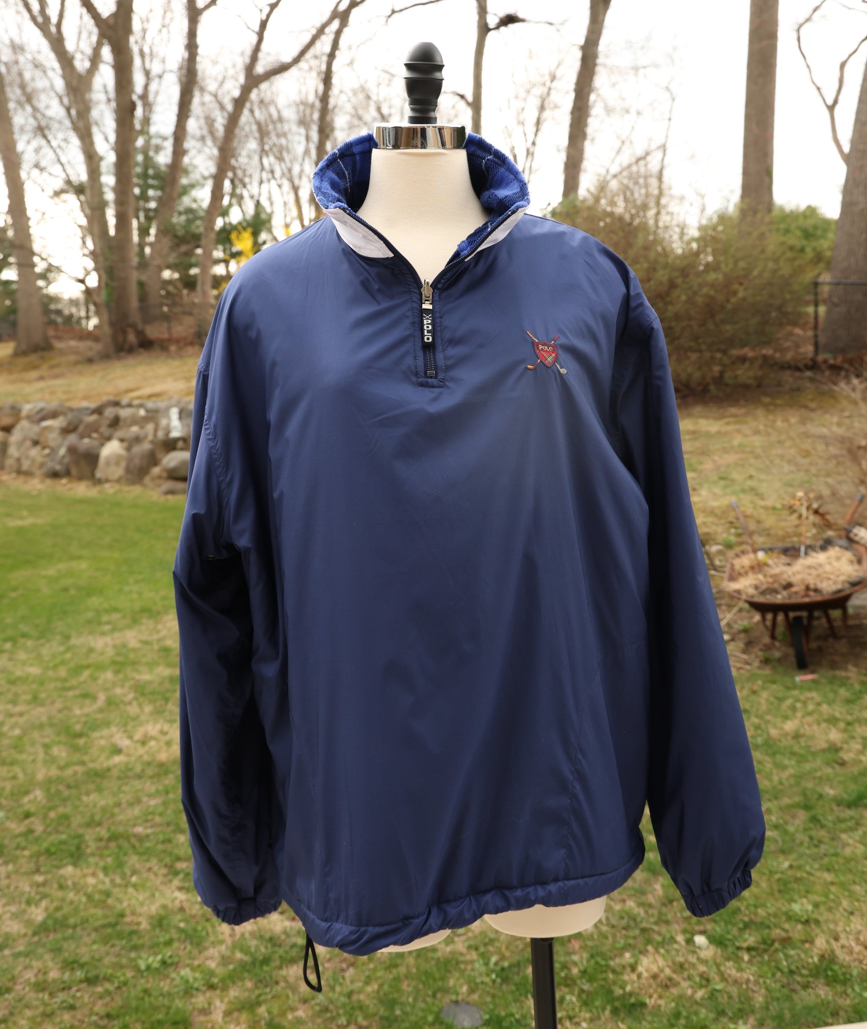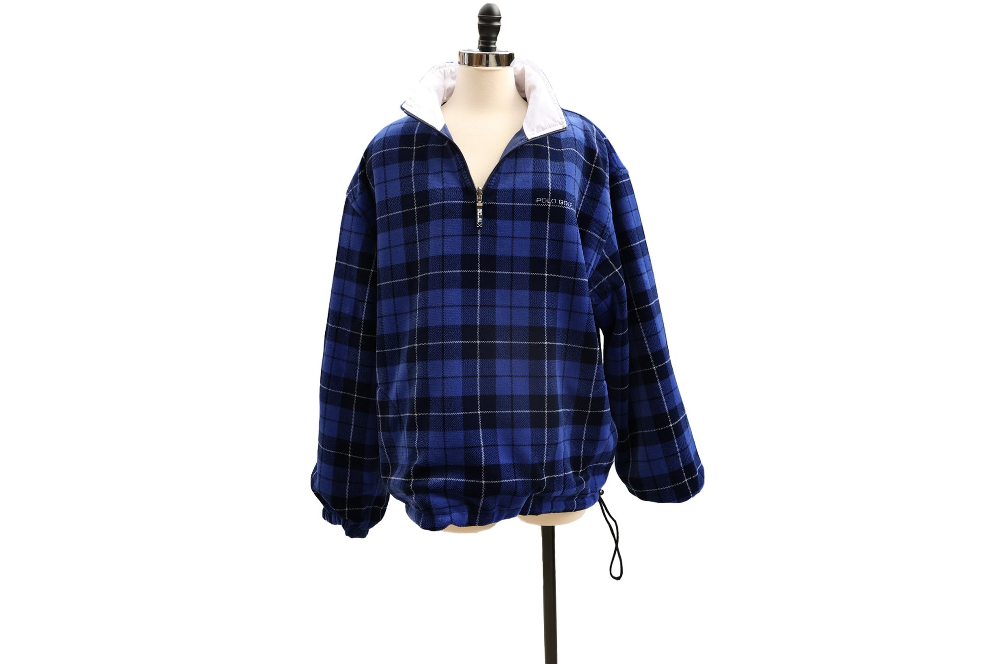 Stylish blue plaid reversible pullover by Polo Golf. Features a half-zip design with drawstring for custom fit.