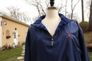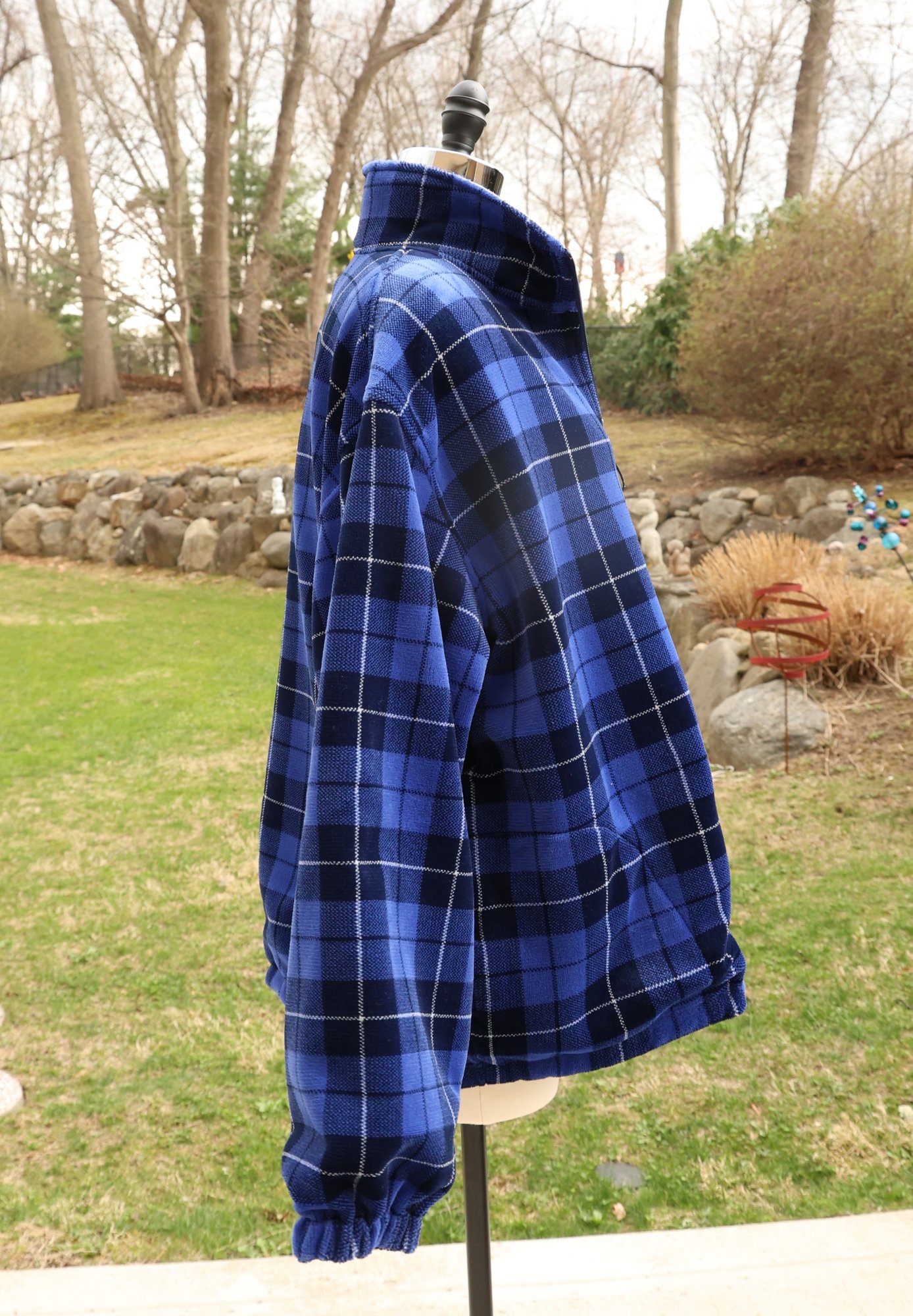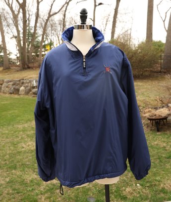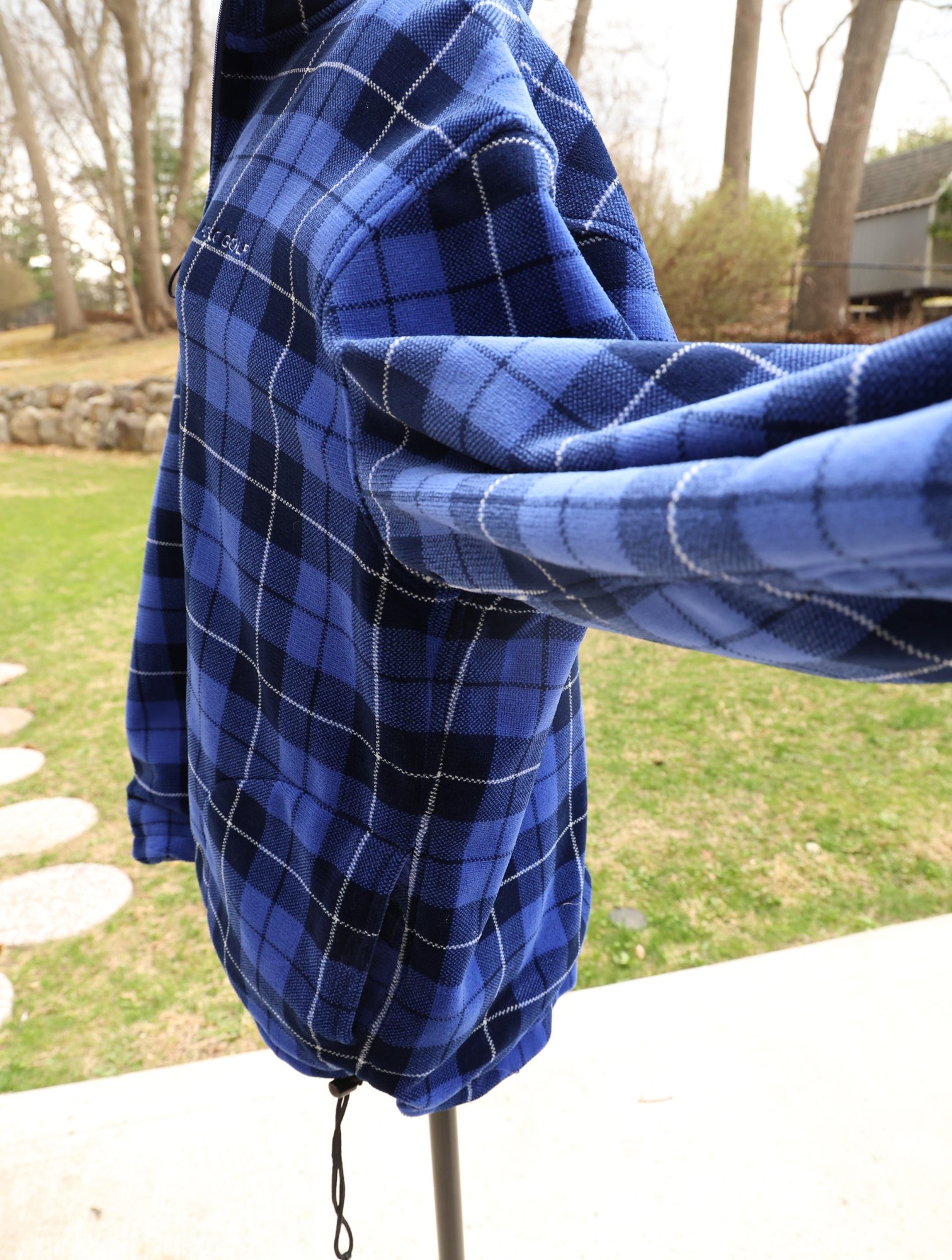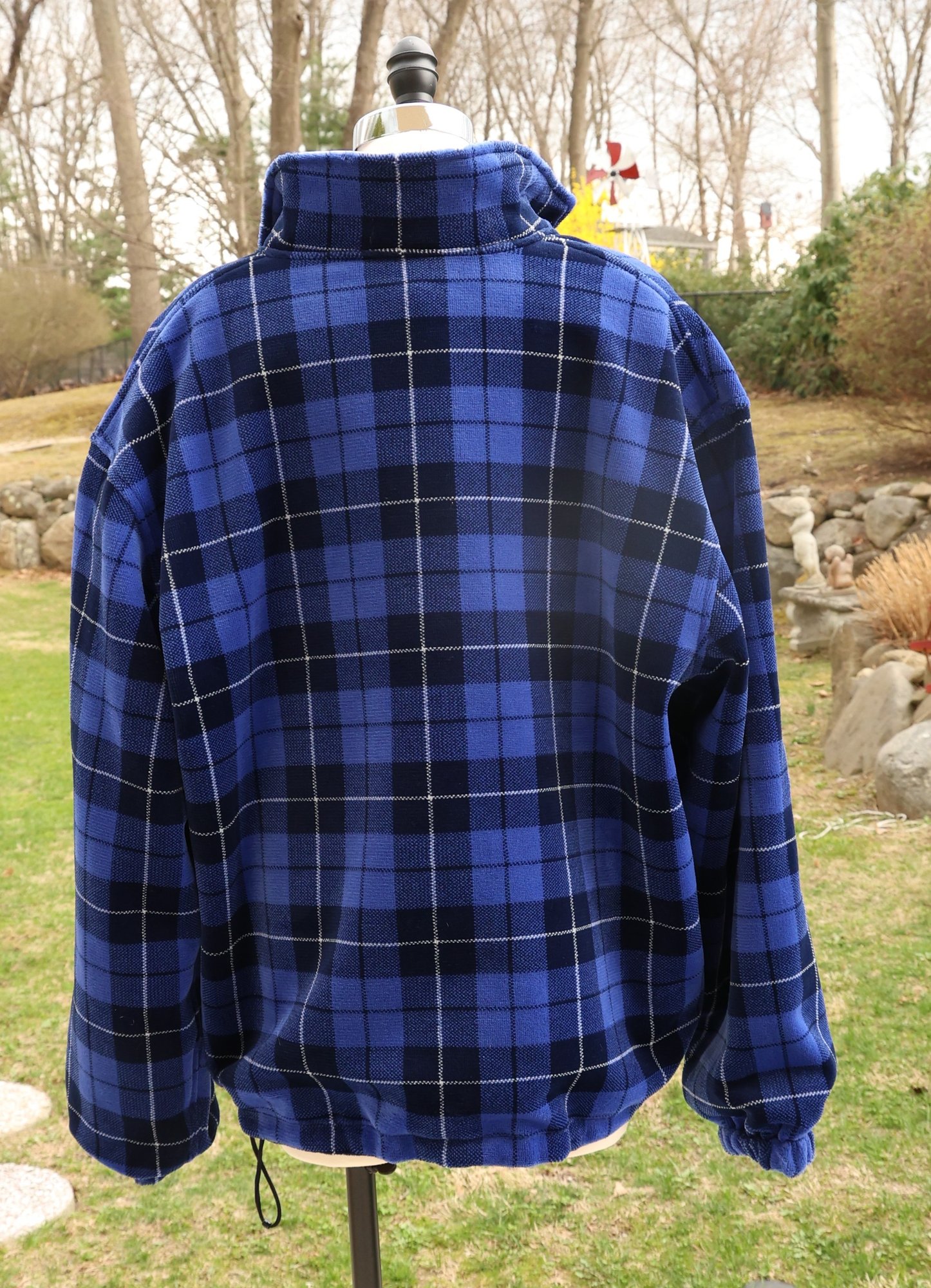 Stylish blue plaid reversible pullover by Polo Golf. Features a half-zip design with drawstring for custom fit.