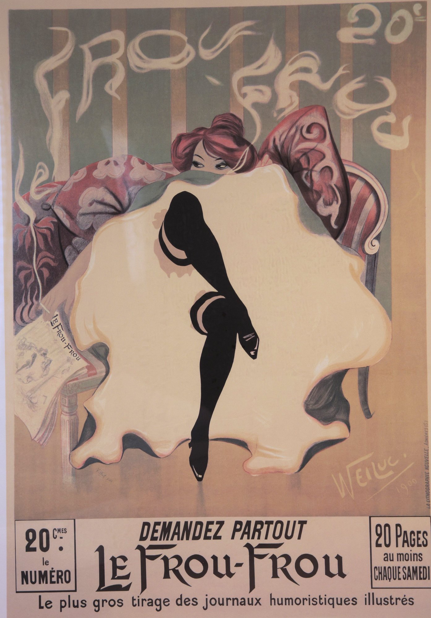 Vintage Poster For French Magazine Le Frou-Frou. Created by Lucien- Henri Weiluc in 1900. The poster depicts a woman smoking, which was considered provocative for a woman at the time.