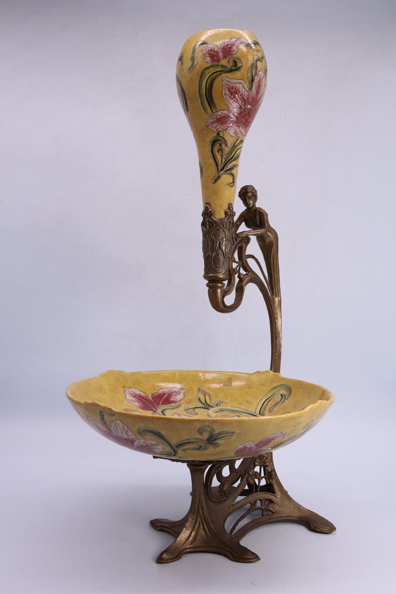 This art nouveau style epergne combines decorative ceramic and brass, featuring a lady figure. The ceramic part showcases an enameled floral design on a yellow background.
