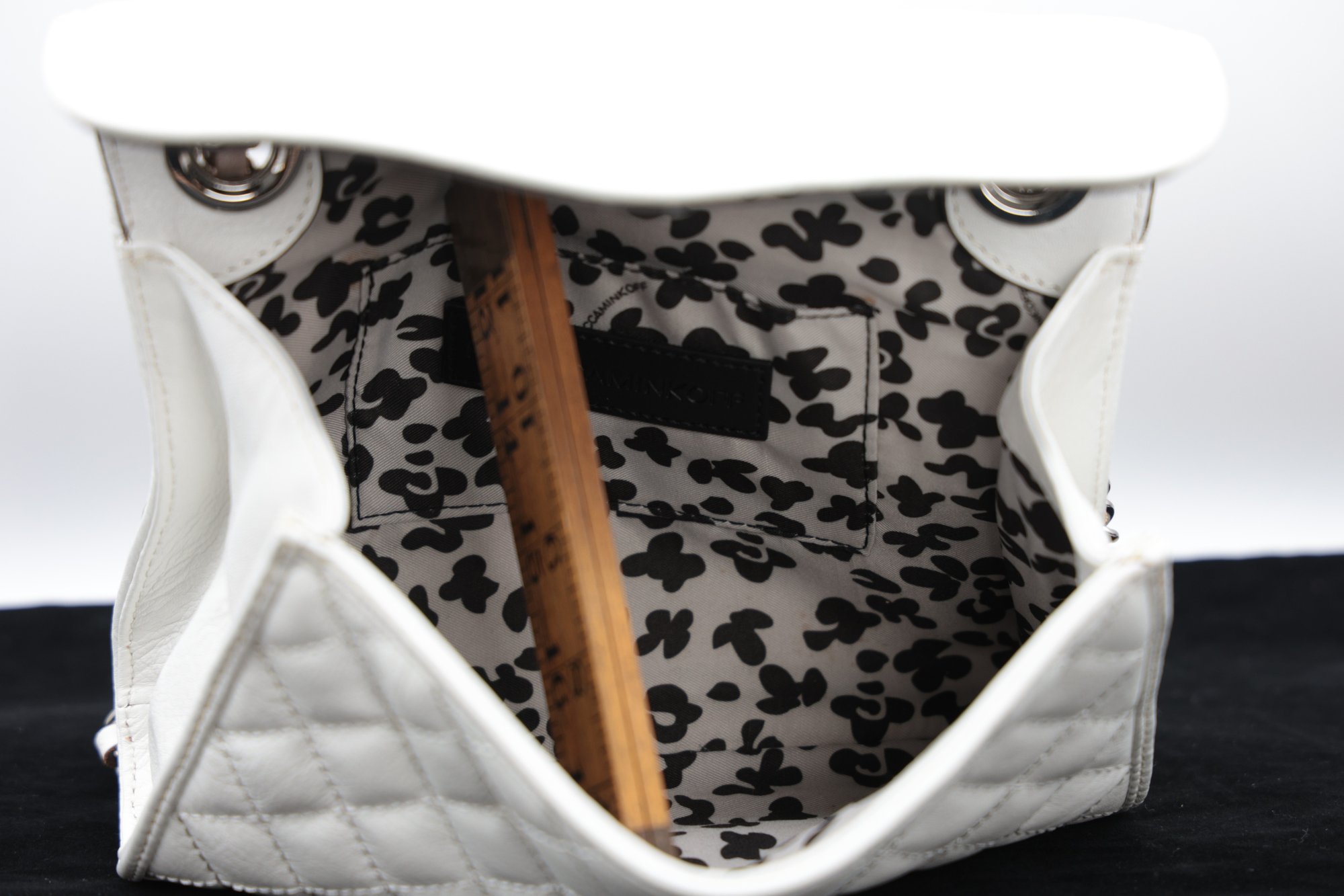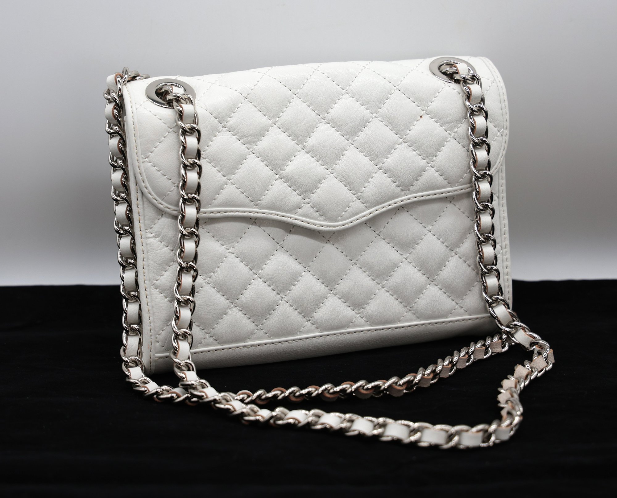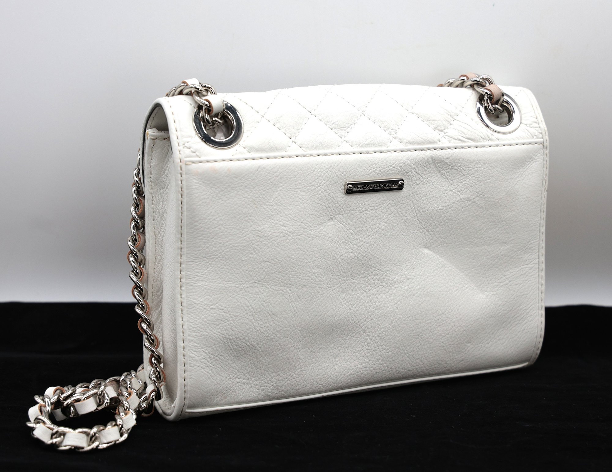 Vintage Rebecca Minkoff Small quilted handbag, white leather, with a chain strap. Black and white inside fabric with pocket.