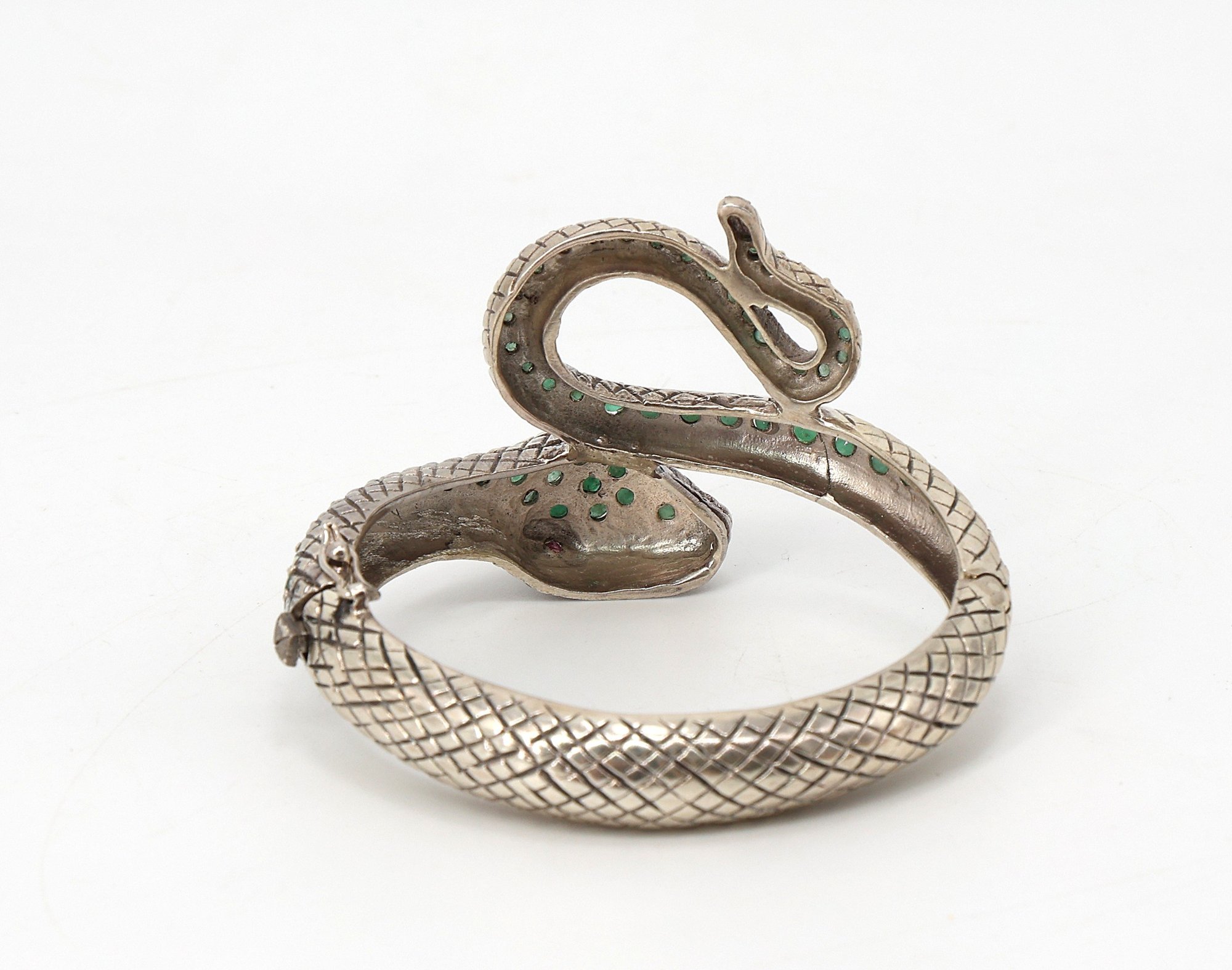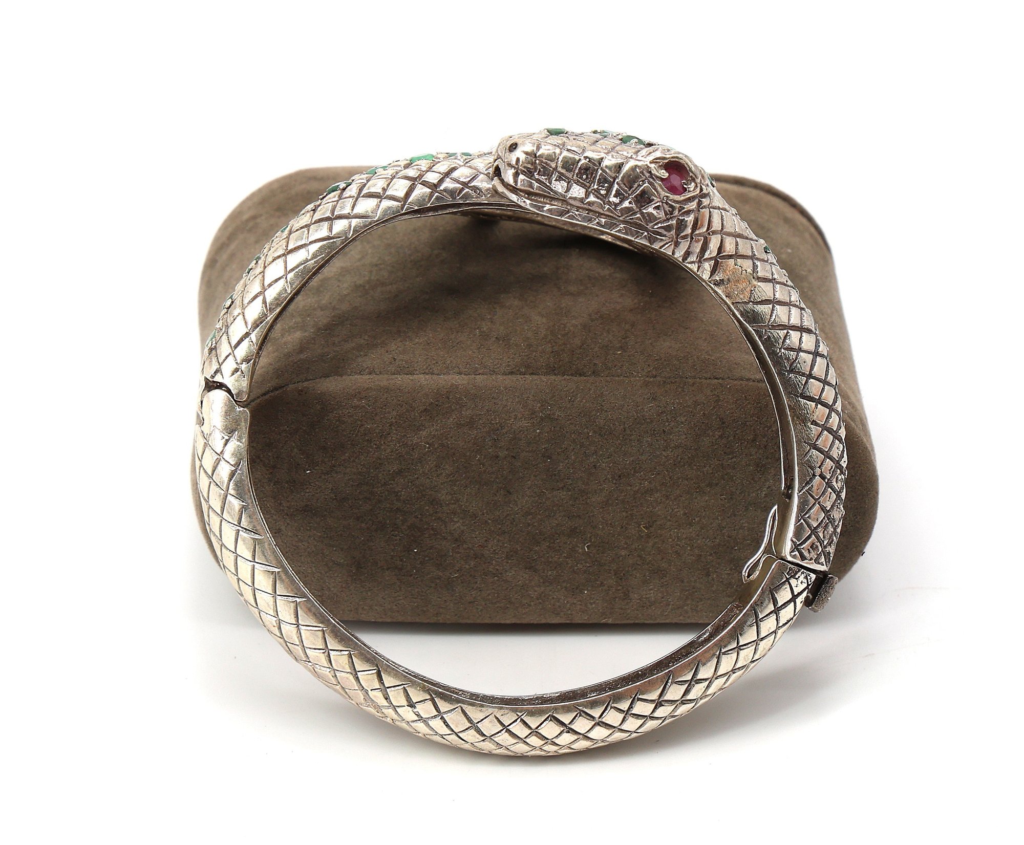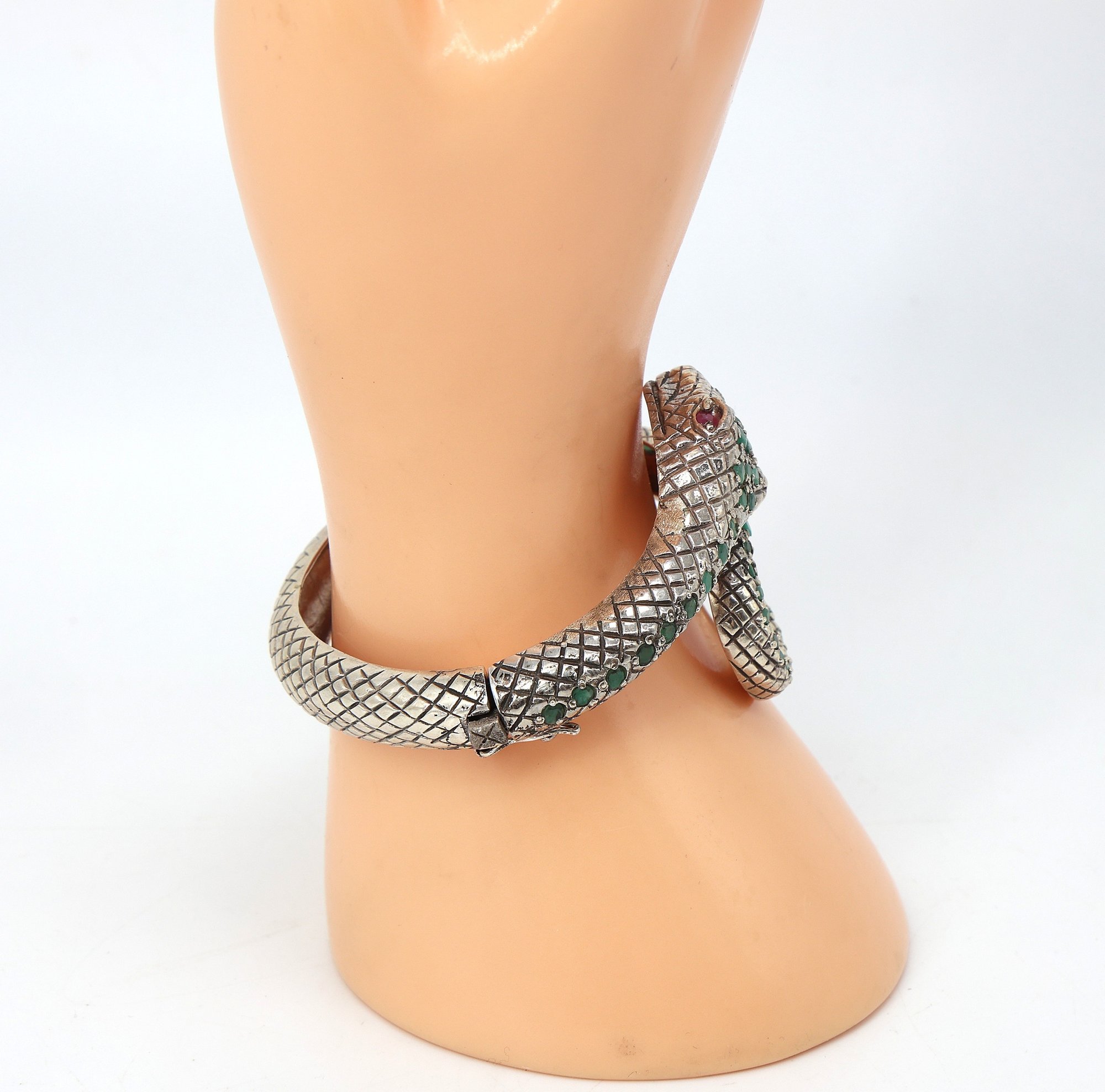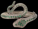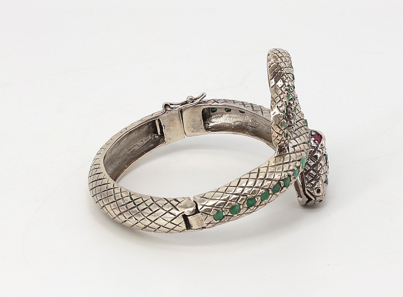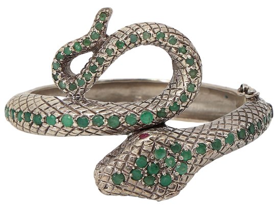 Sterling Silver snake bangle bracelet set with green emeralds and a ruby eyes.