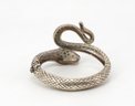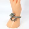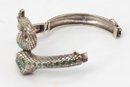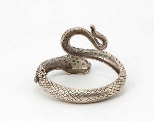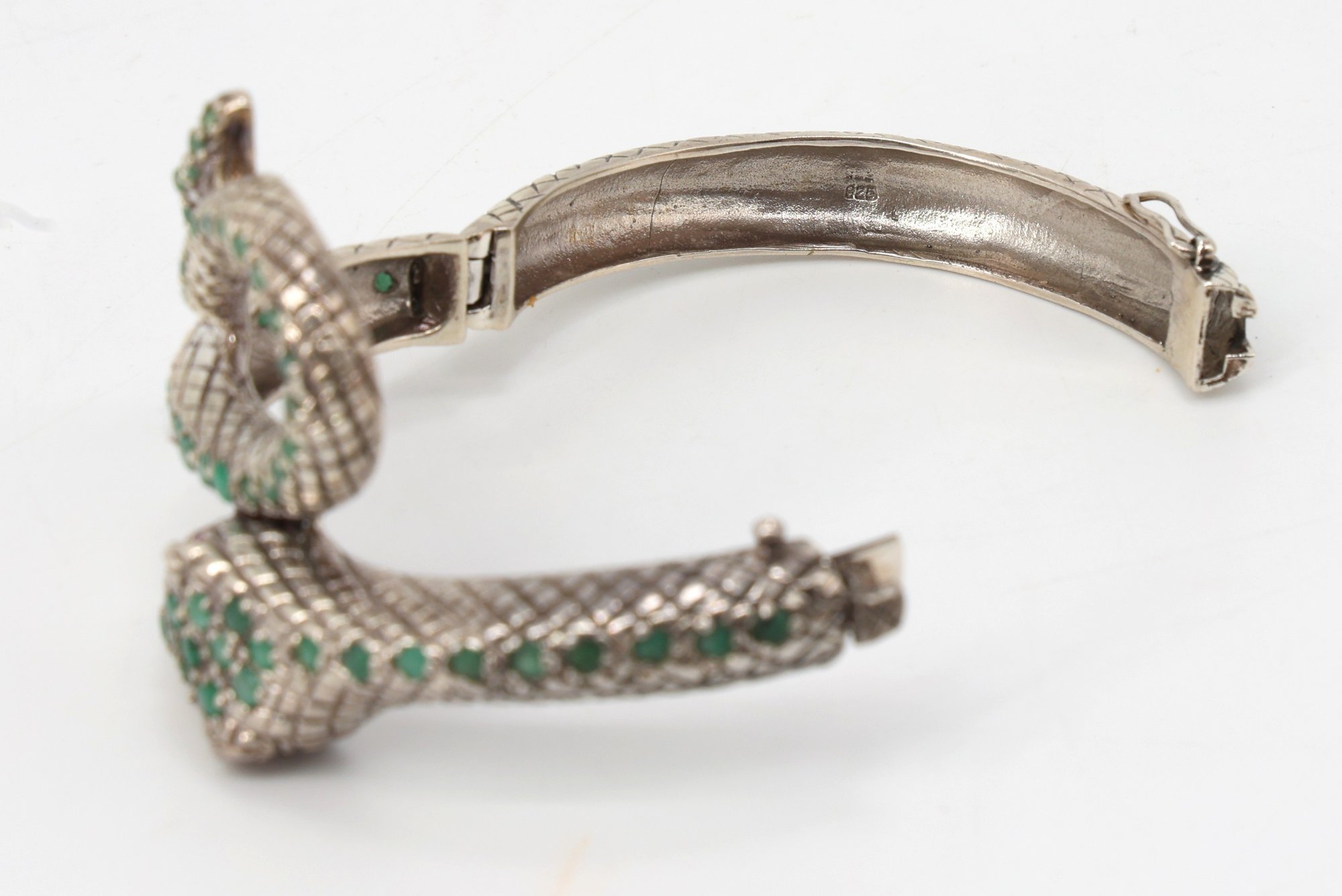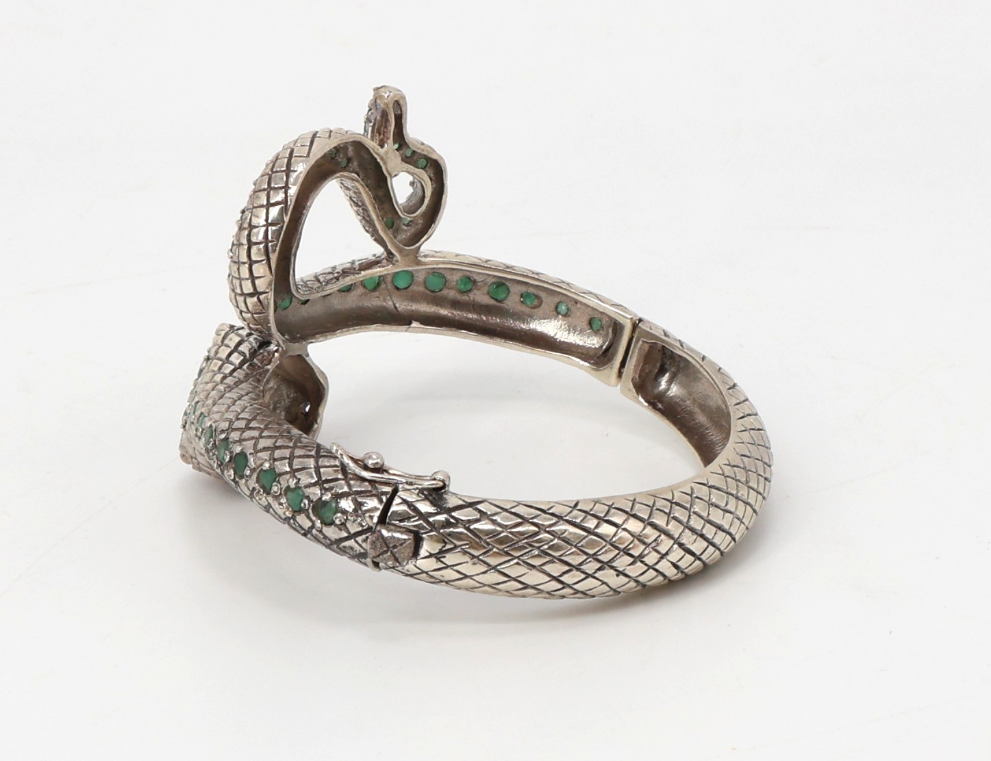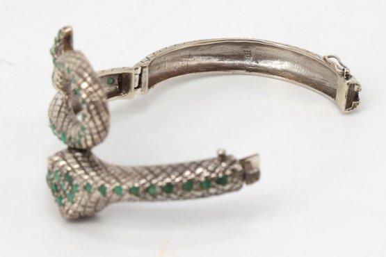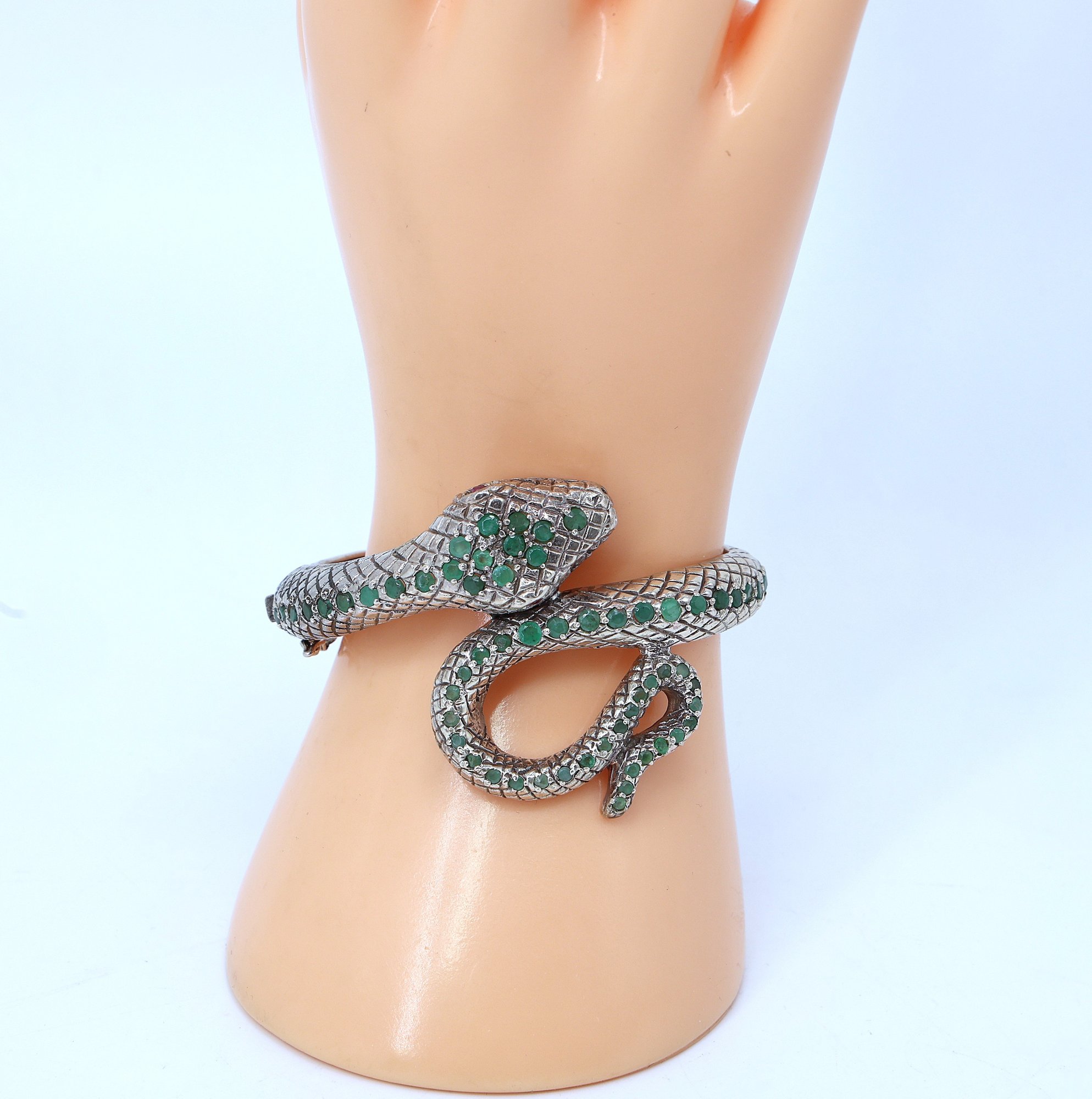 Sterling Silver snake bangle bracelet set with green emeralds and a ruby eyes.