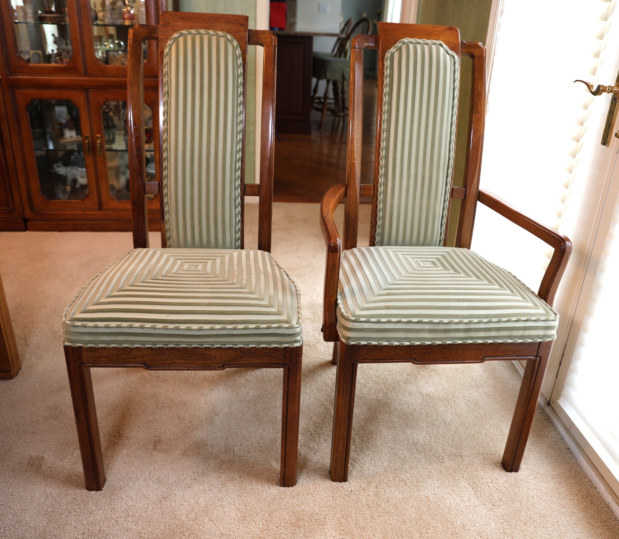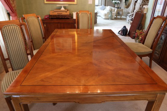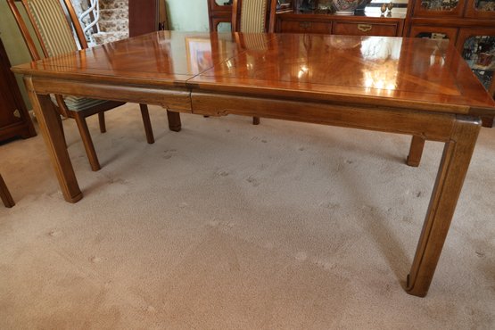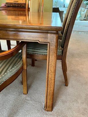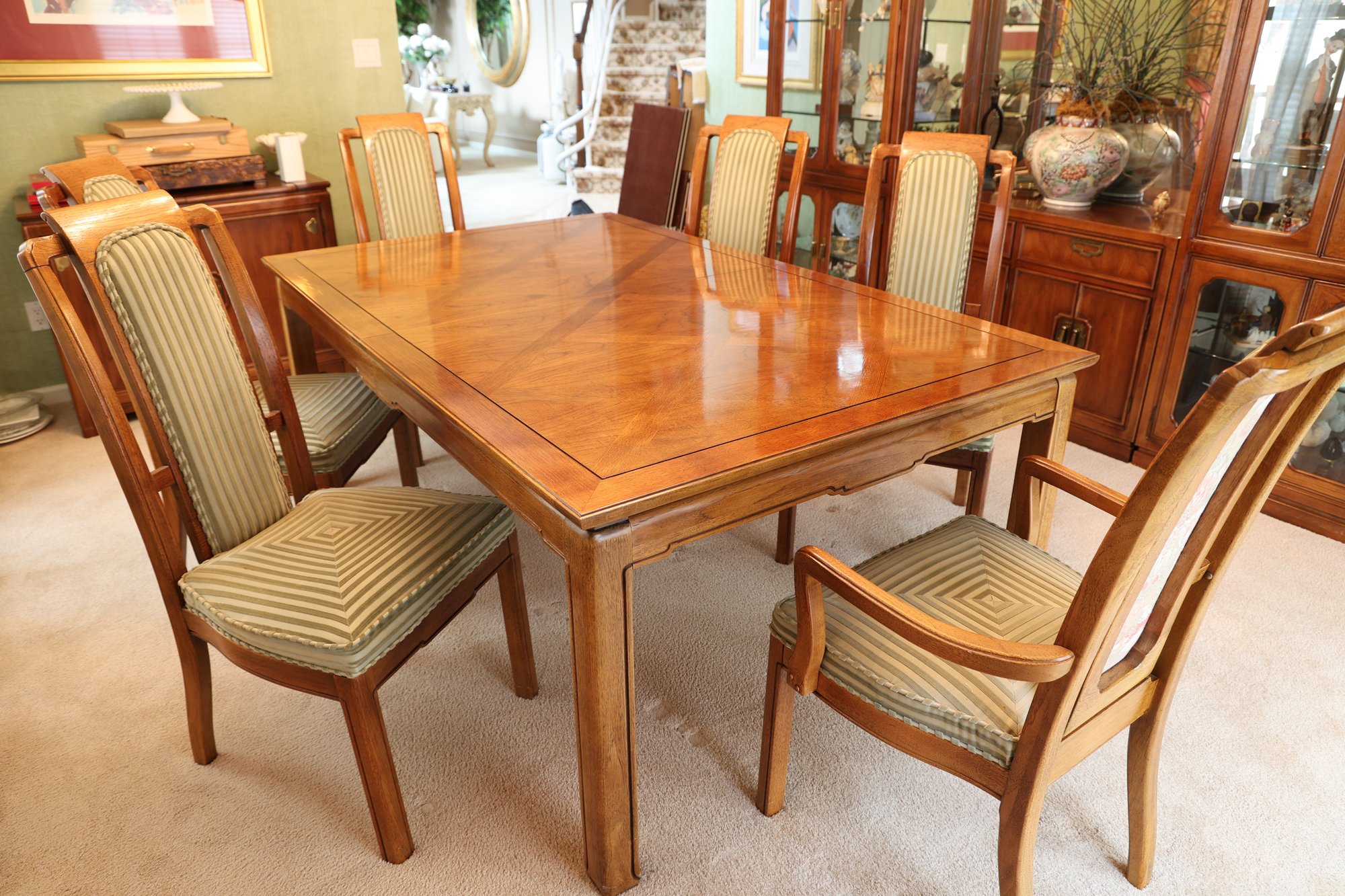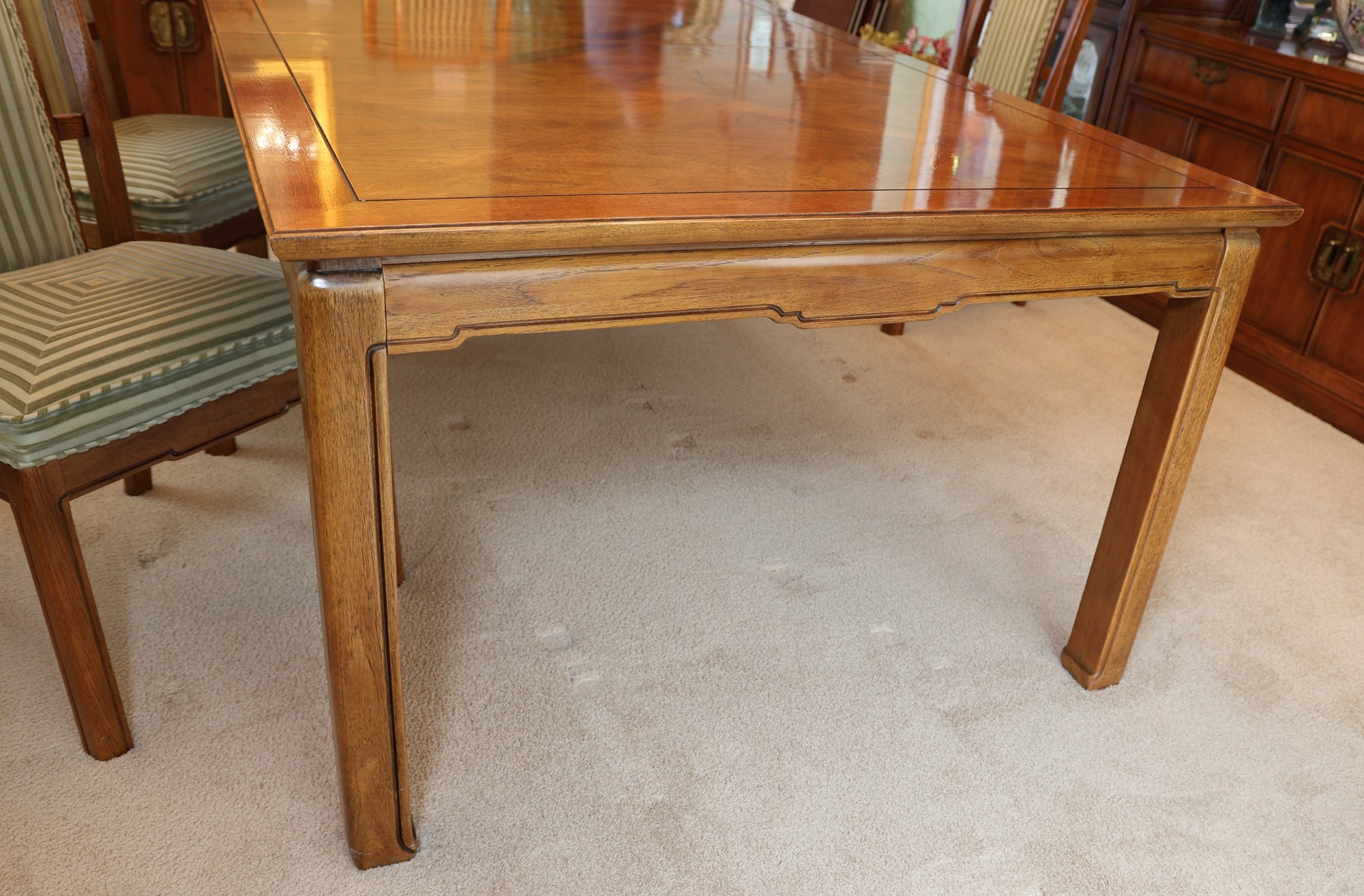 Vintage Thomasville Mystique dining set in an Asian style. Nice clean straight legs. Table is in nice condition with 2 extensions and pads. The chairs are nice and sturdy!! 2 arm and 4 armless, couple minor stains, see photos.