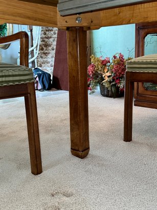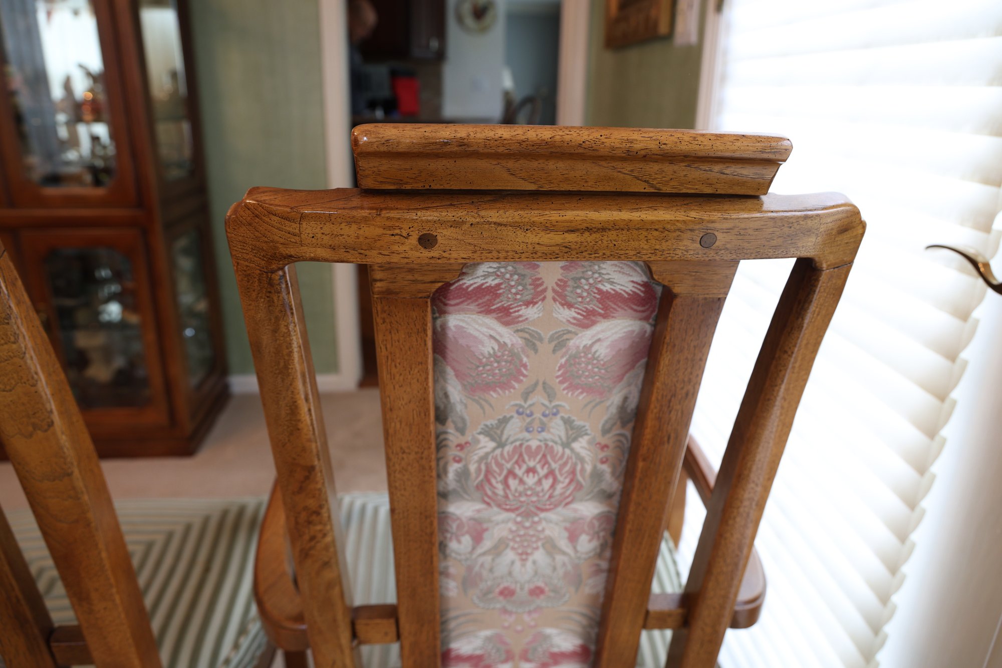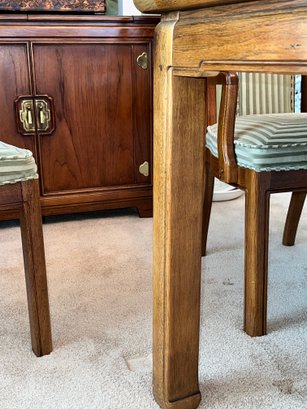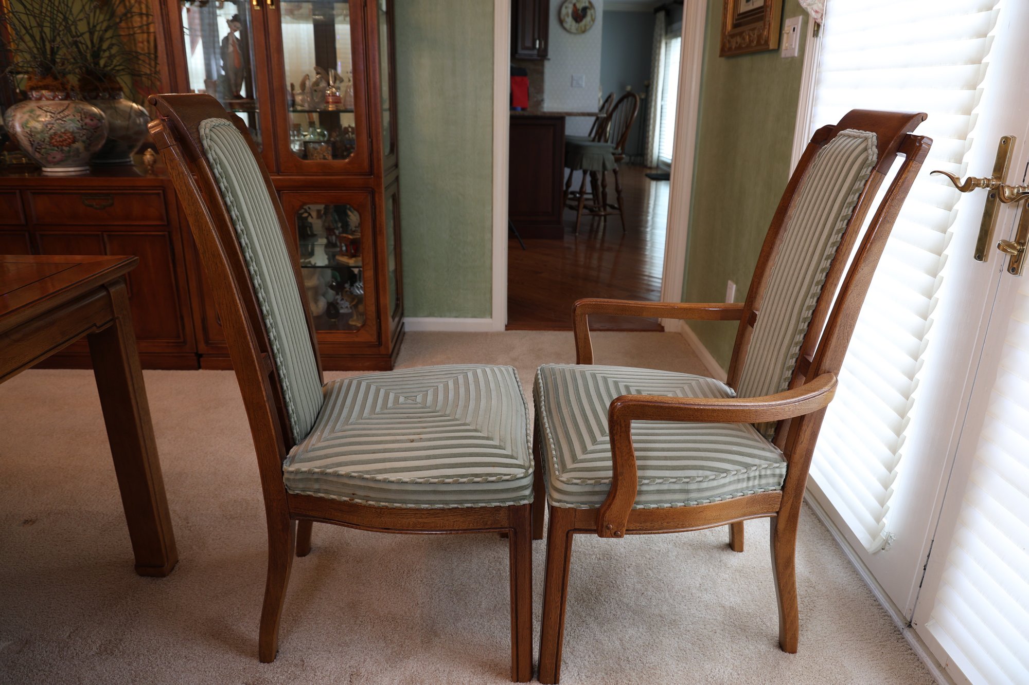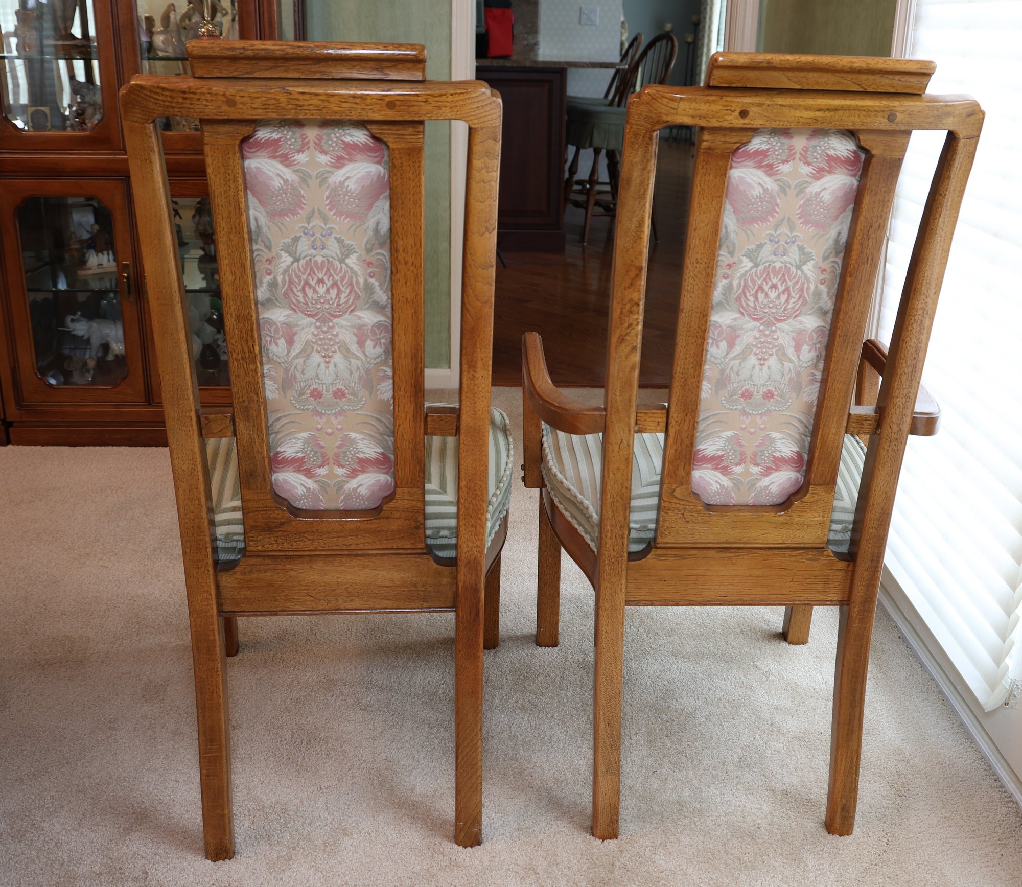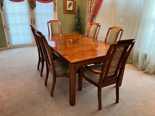Vintage Thomasville Mystique dining set in an Asian style. Nice clean straight legs. Table is in nice condition with 2 extensions and pads. The chairs are nice and sturdy!! 2 arm and 4 armless, couple minor stains, see photos.
