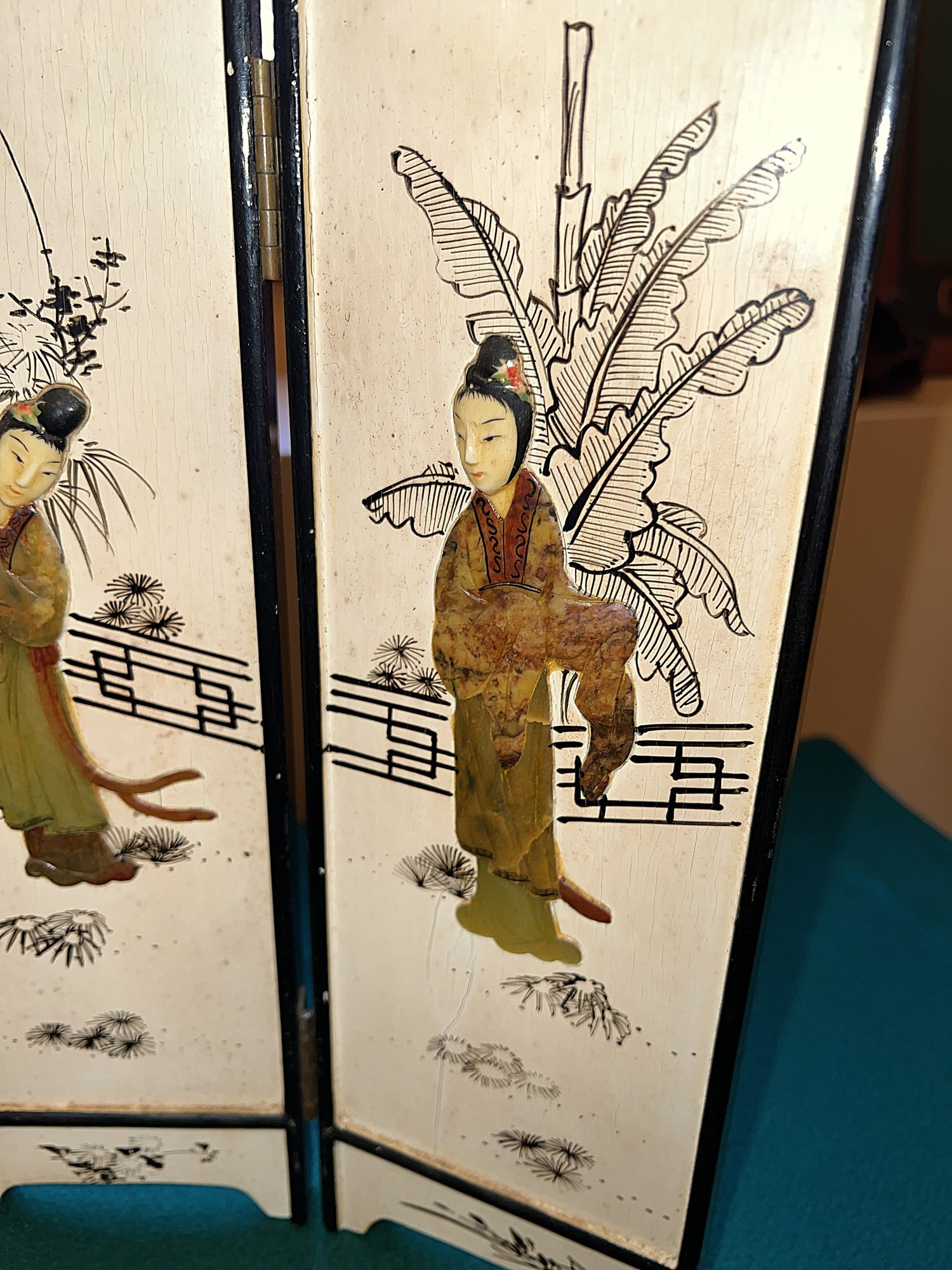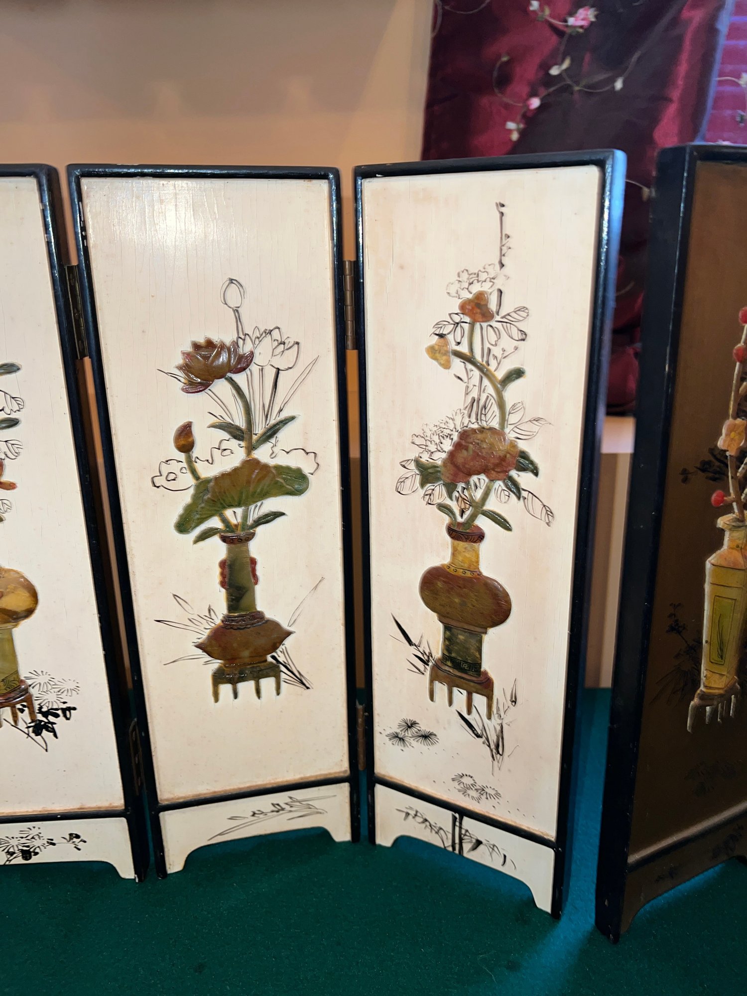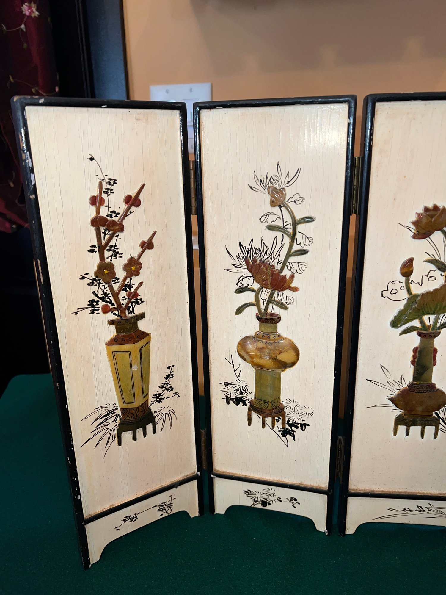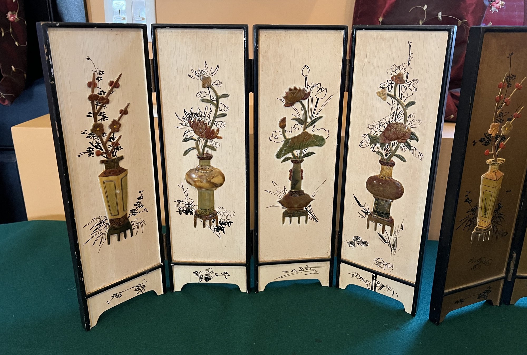 Vintage Chinese table screens, 3 in total, with 1 featuring jade figures and 2 featuring florals and pots. Markings on the back
