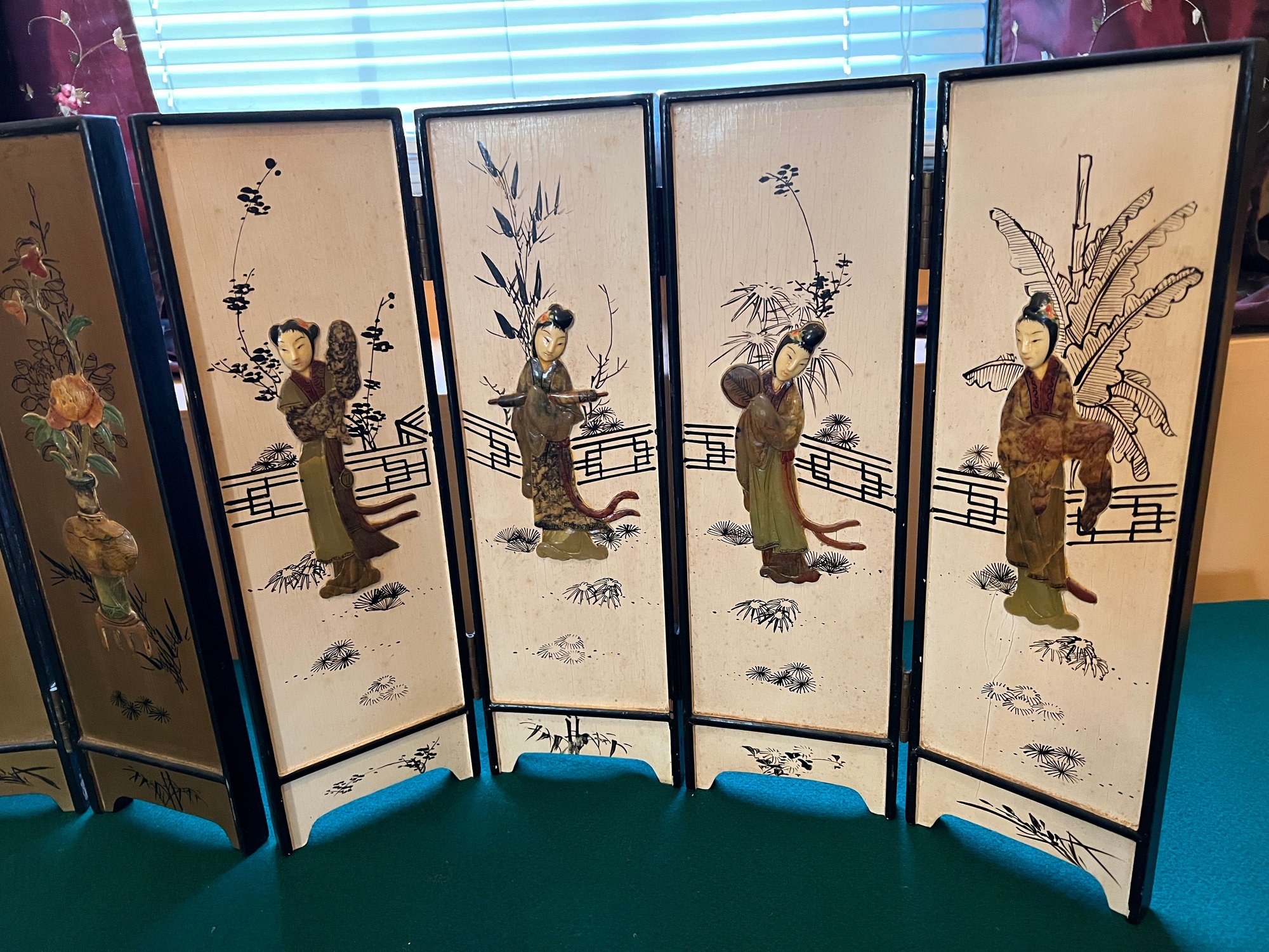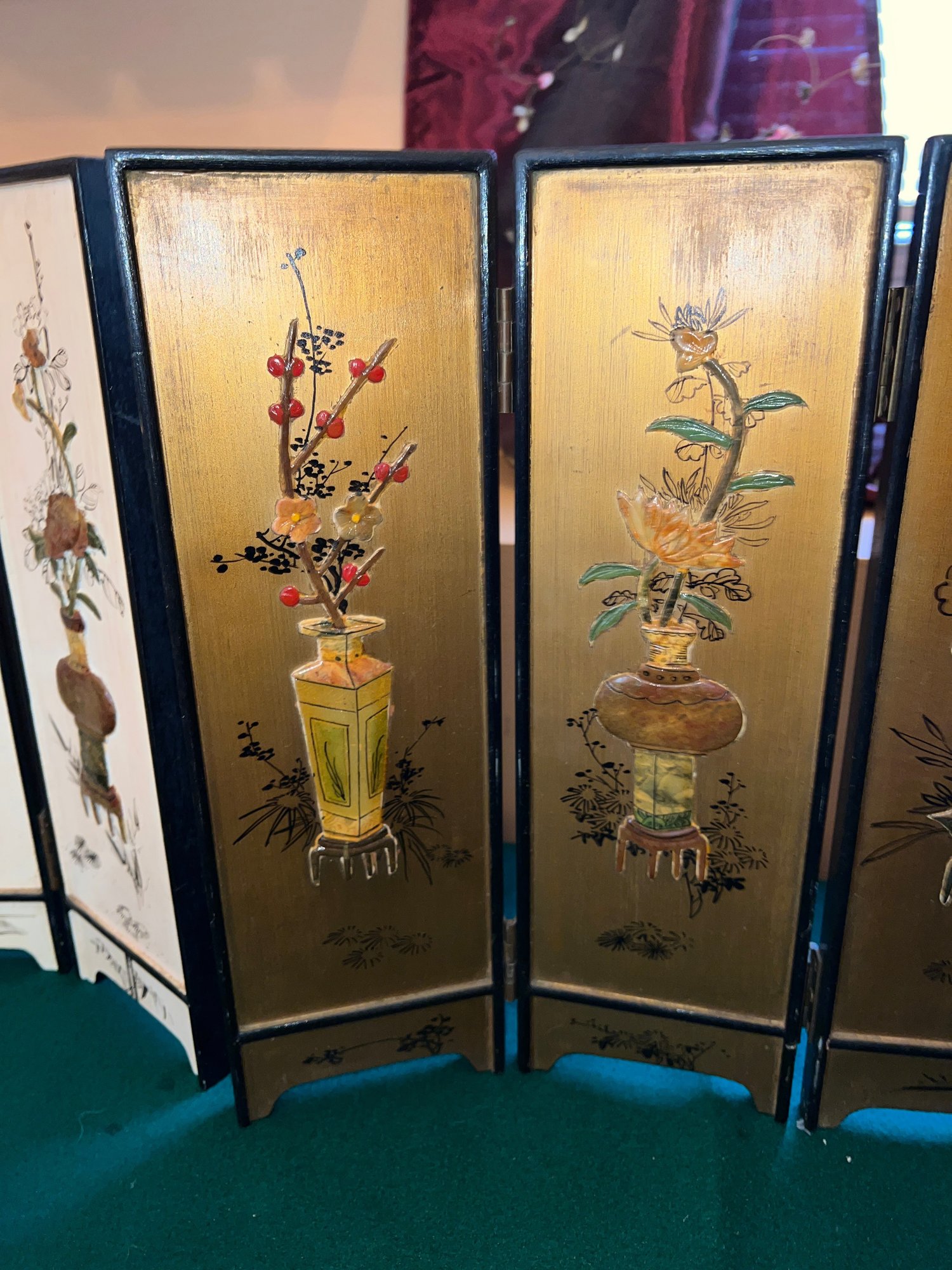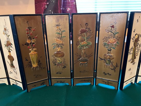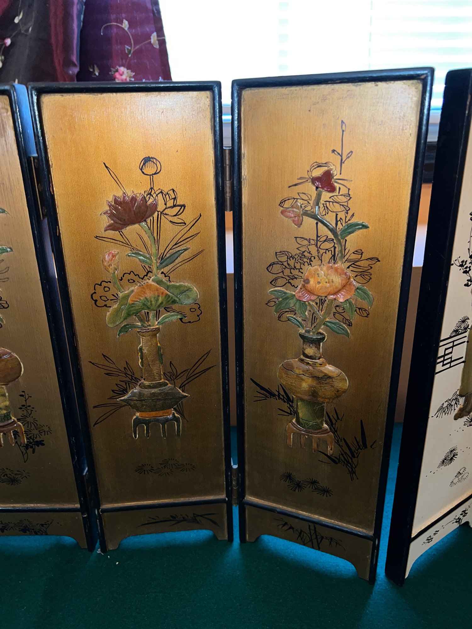 Vintage Chinese table screens, 3 in total, with 1 featuring jade figures and 2 featuring florals and pots. Markings on the back