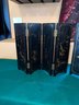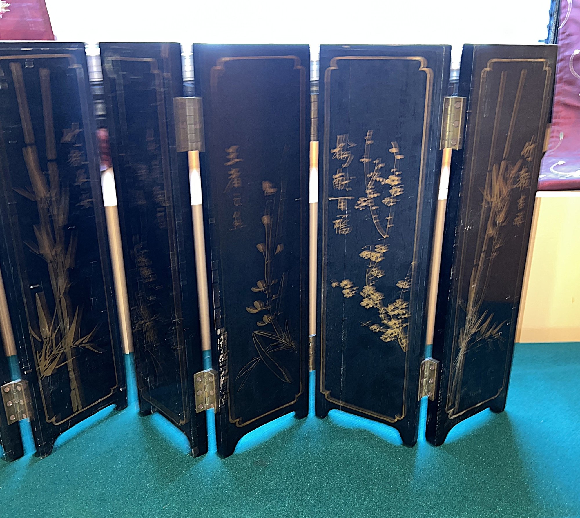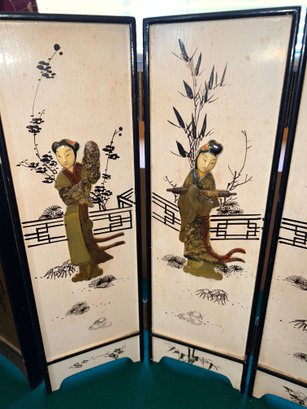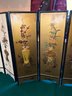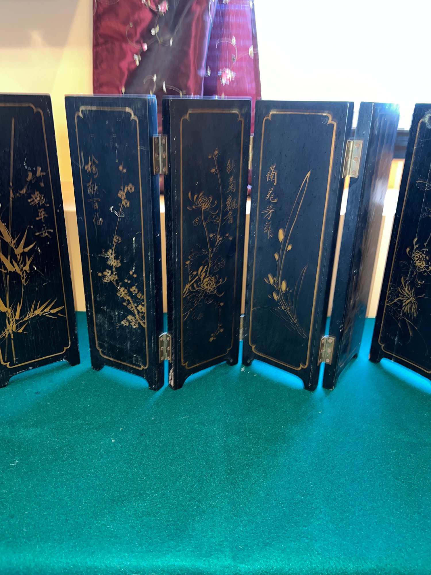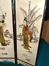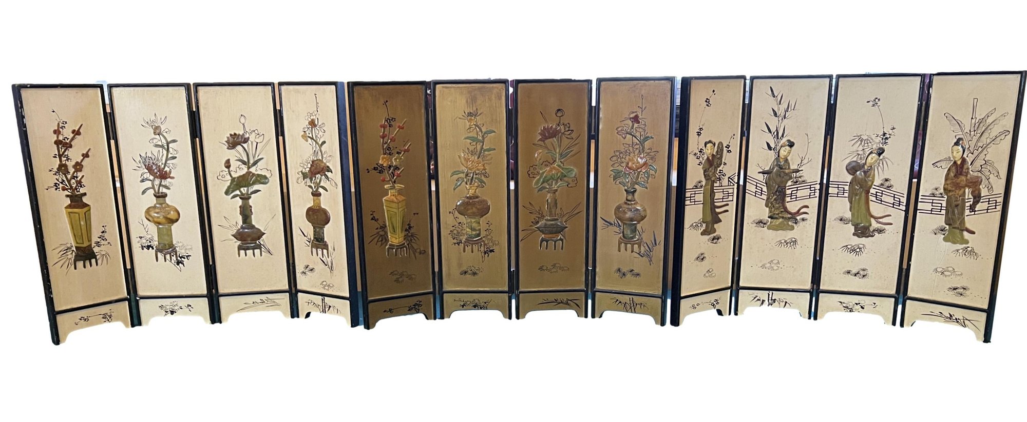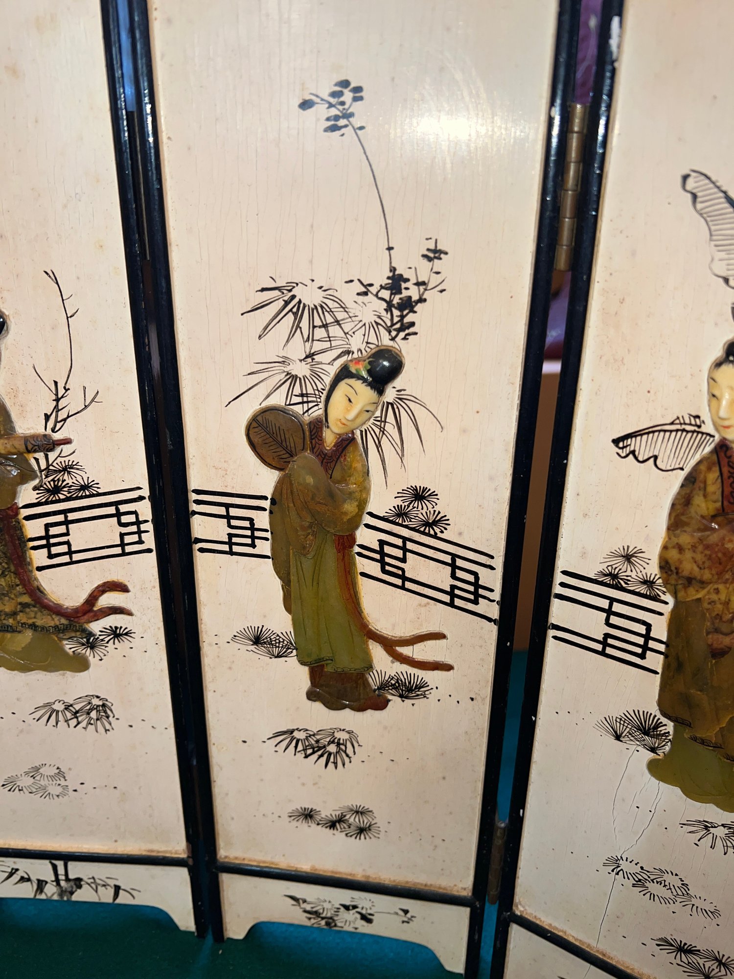 Vintage Chinese table screens, 3 in total, with 1 featuring jade figures and 2 featuring florals and pots. Markings on the back