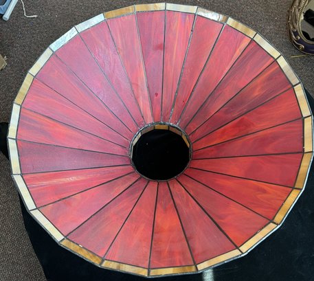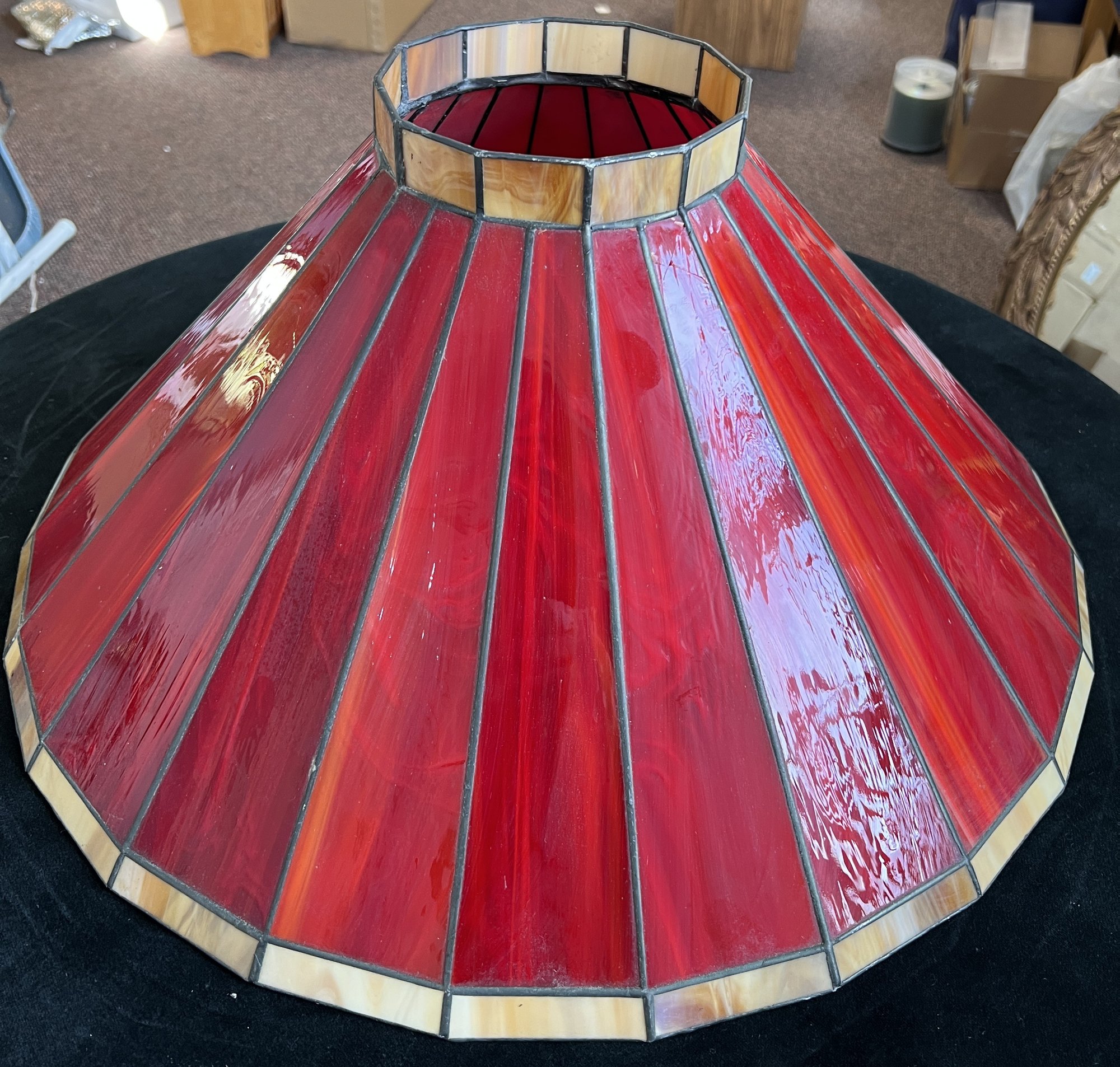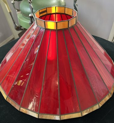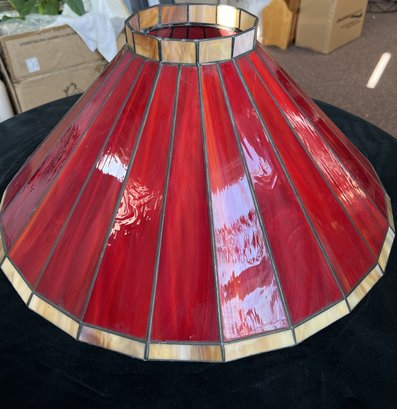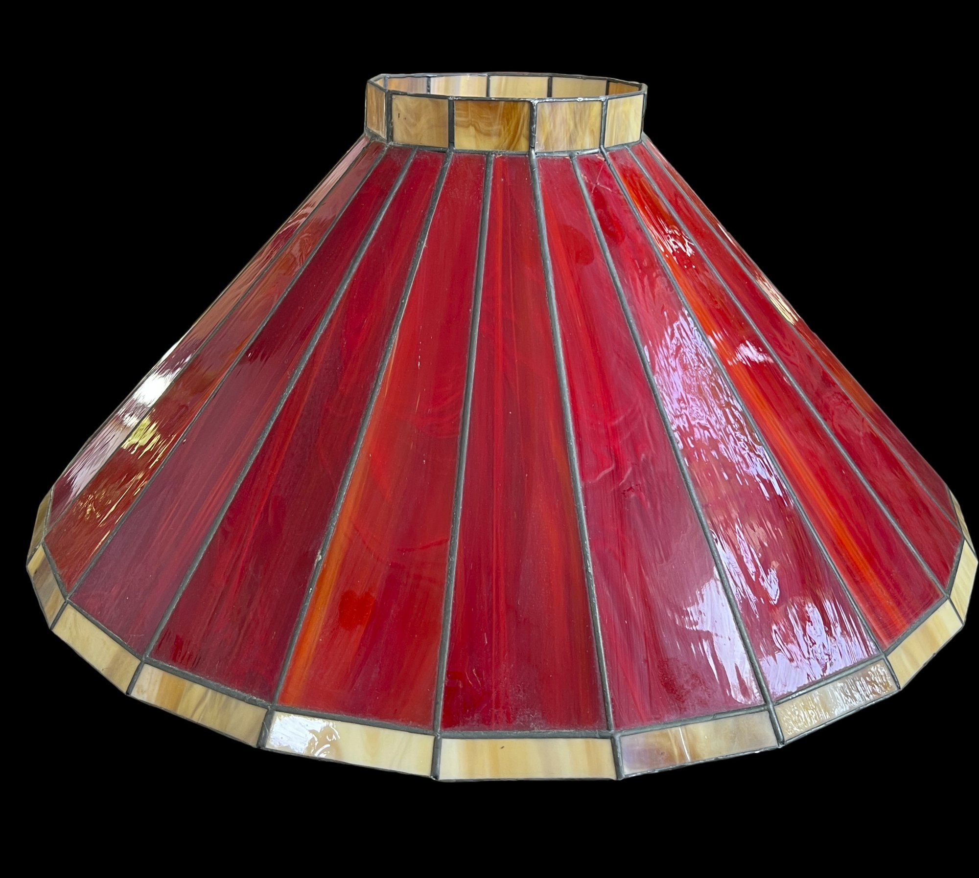 Vintage Tiffany-style stained-glass hanging lamp shade featuring a vibrant red glass body with a beige-and-white geometric border.