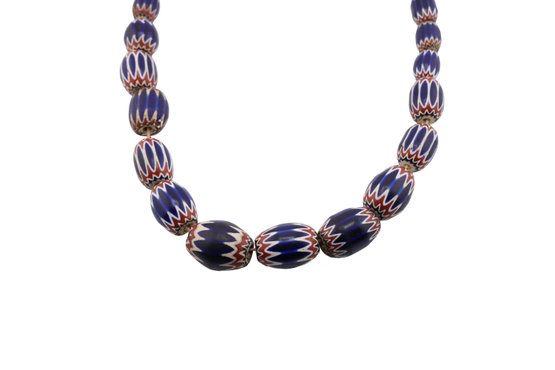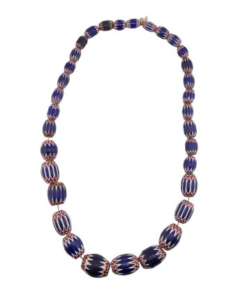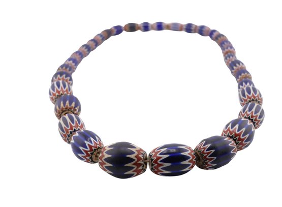 stunning vintage necklace accented with red and white layers with bold blue . Inspired by traditional African trade beads. Handmade