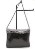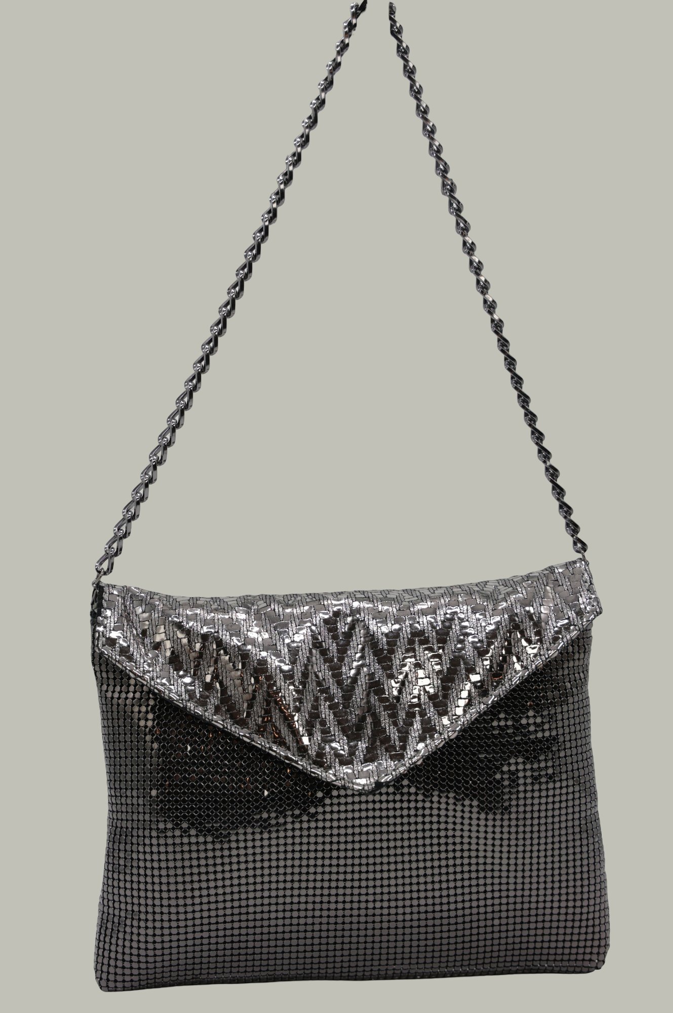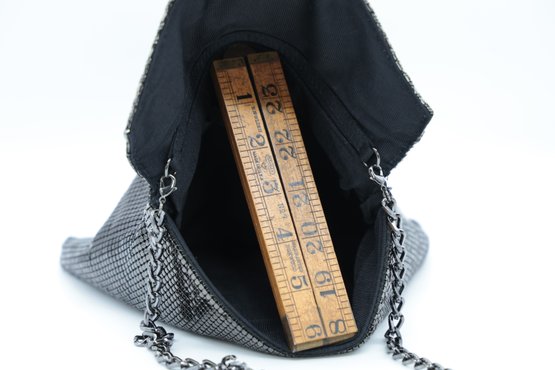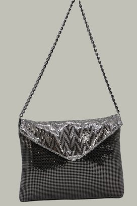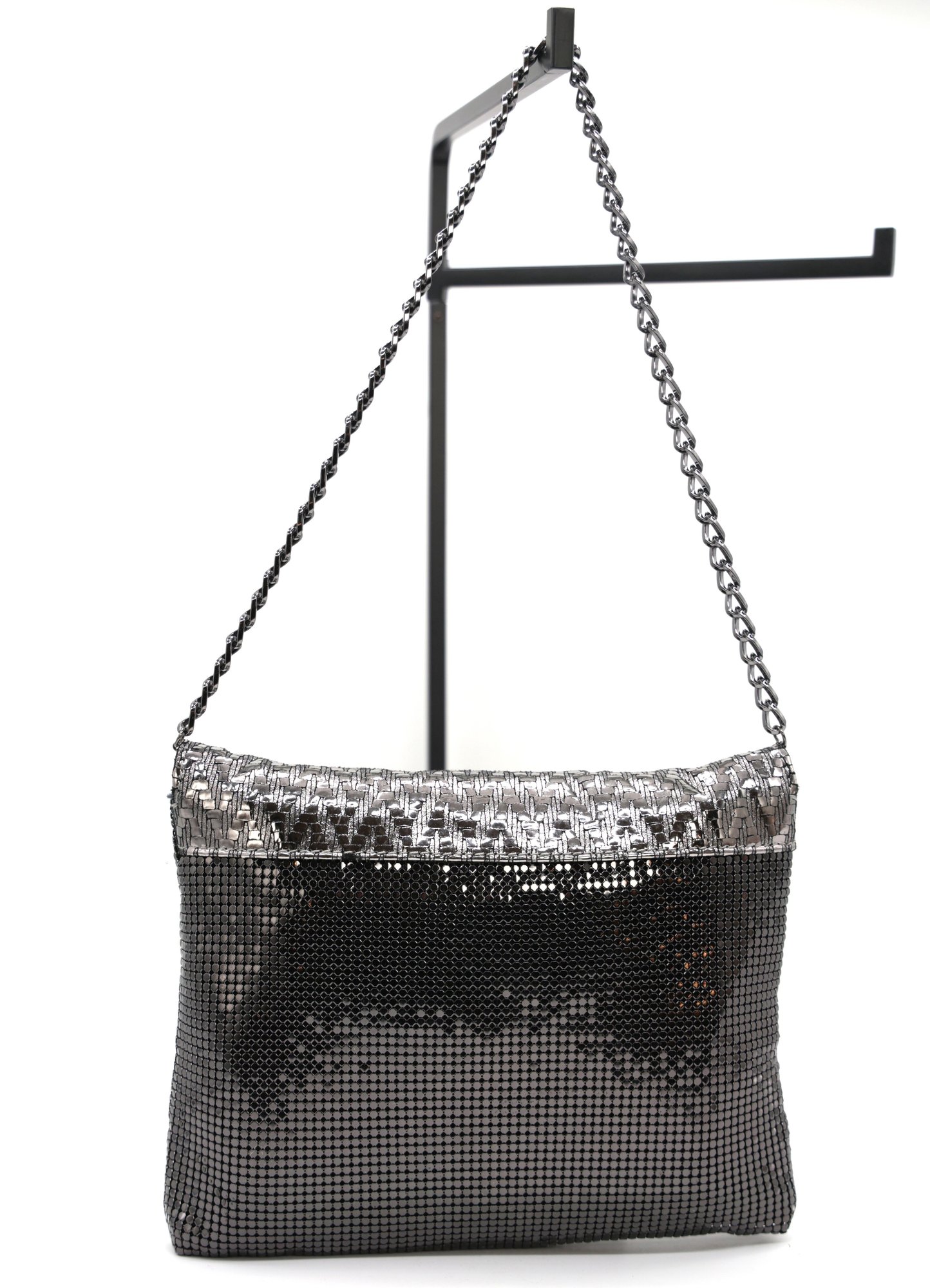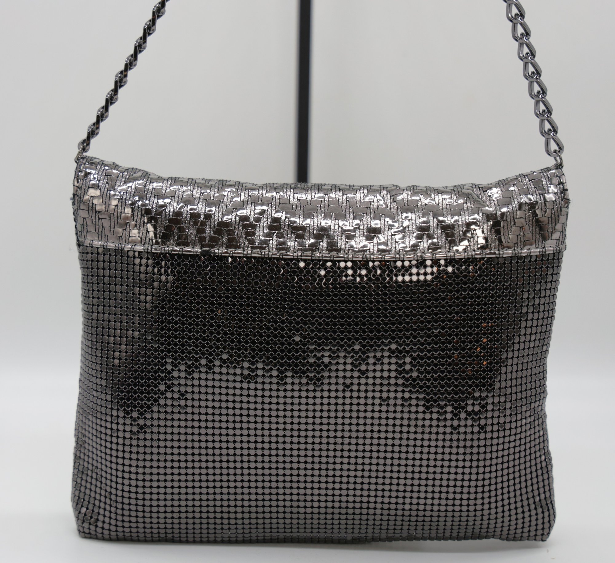 Whiting and Davis metallic black mesh, silver, with a metal chain strap and magnetic closure. 7" x 9' with 16" Drop.