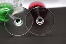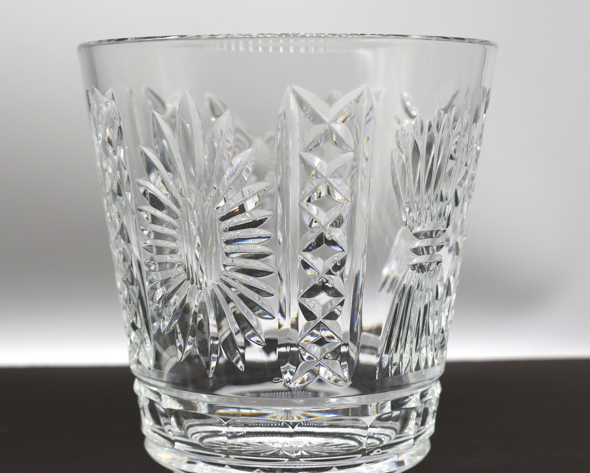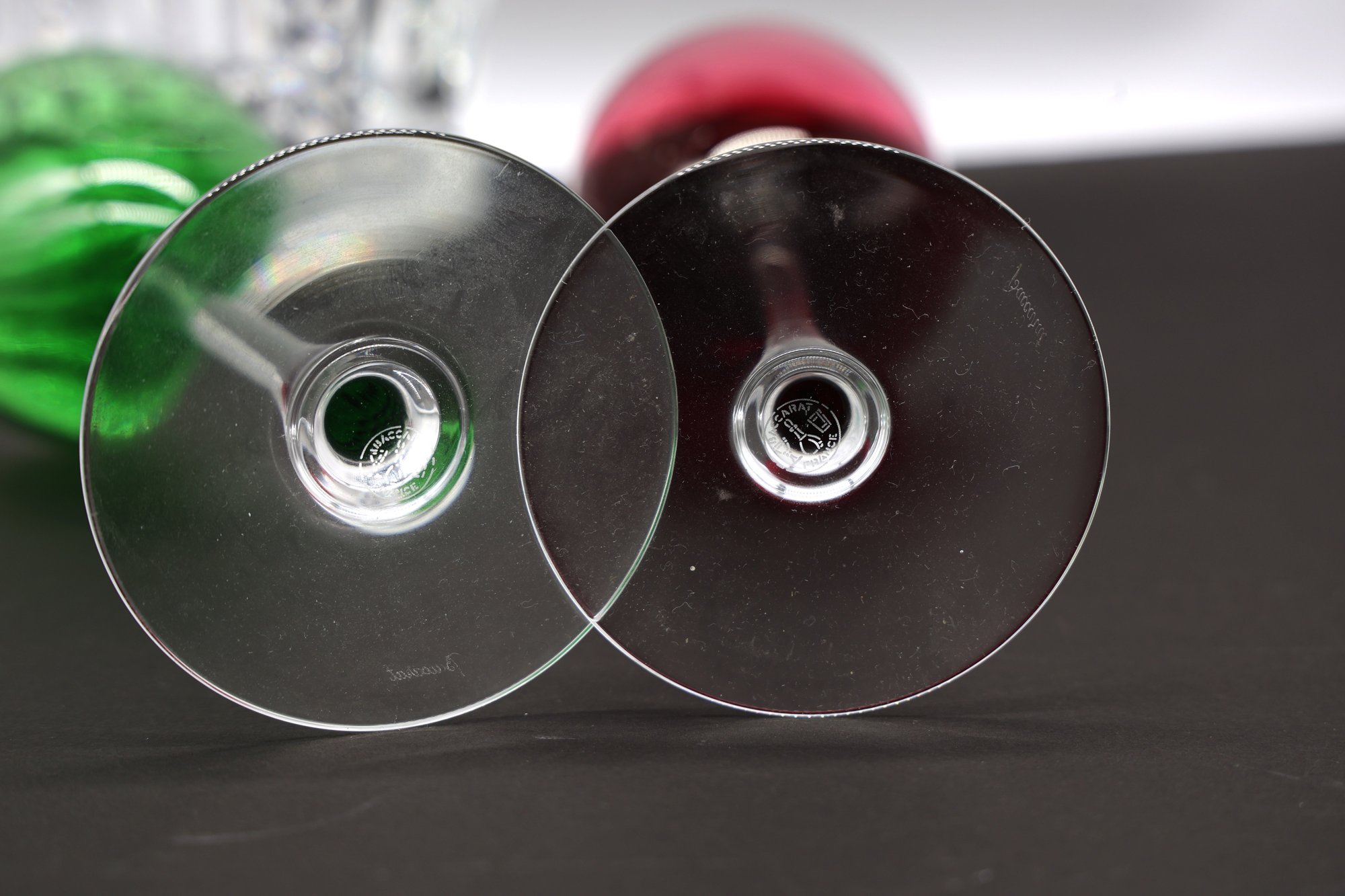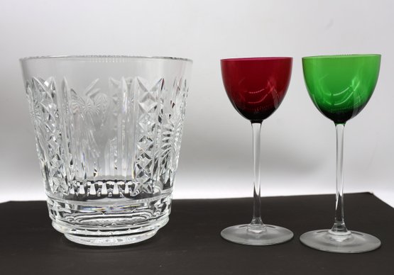 WATERFORD ice bucket and two BACCARAT red & green wine glasses