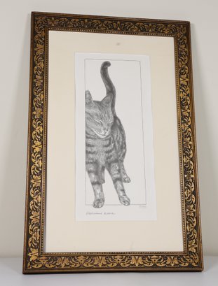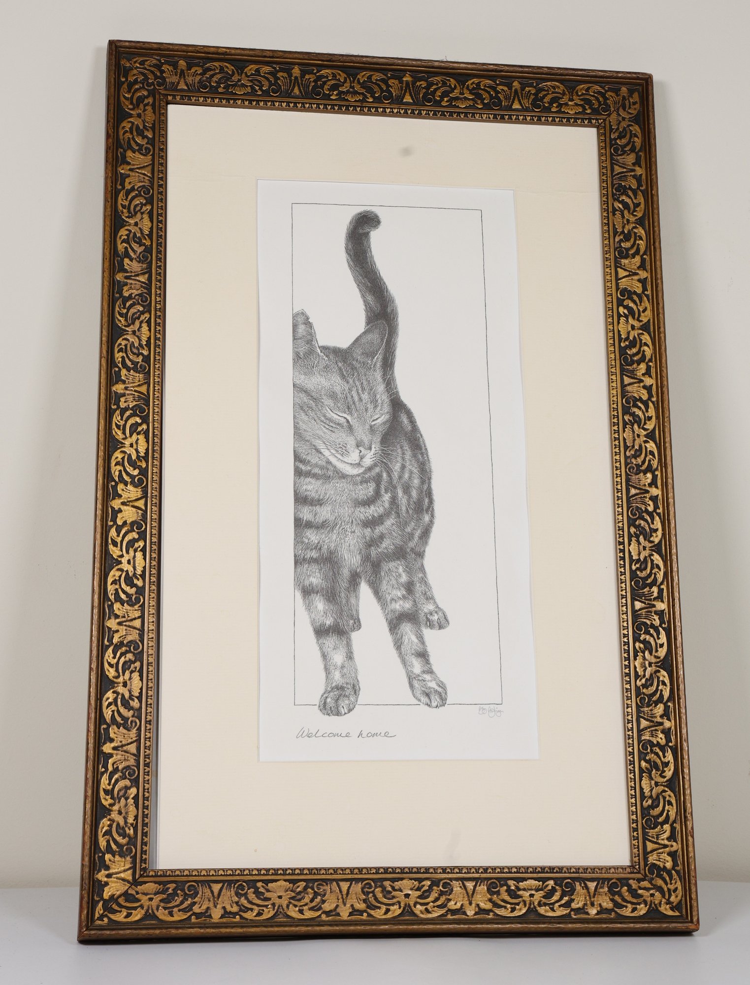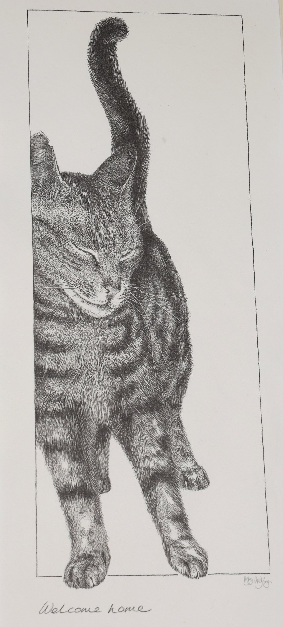 Tabby cat titled "Welcome Home" black and white drawing/print with the original signature of Bob Bowdige and embossed with a paw print.