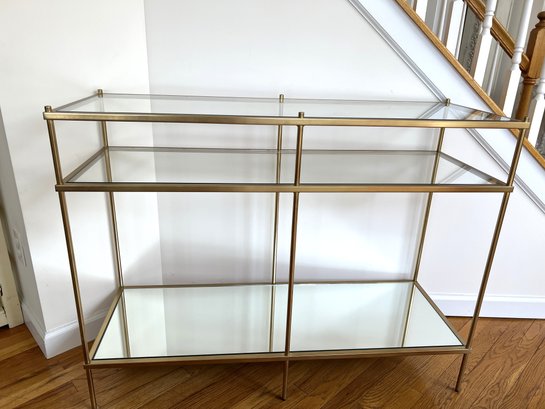 Elegant lines reflect mid-century design. The mirrored base gives a light, airy look. It's perfect for holding mail, keys, and other items. Crafted from brushed gold metal and glass. Dimensions: 31.5"H x 42"W x 15"D.
