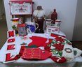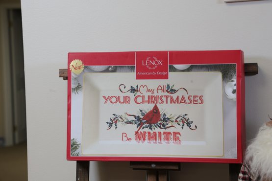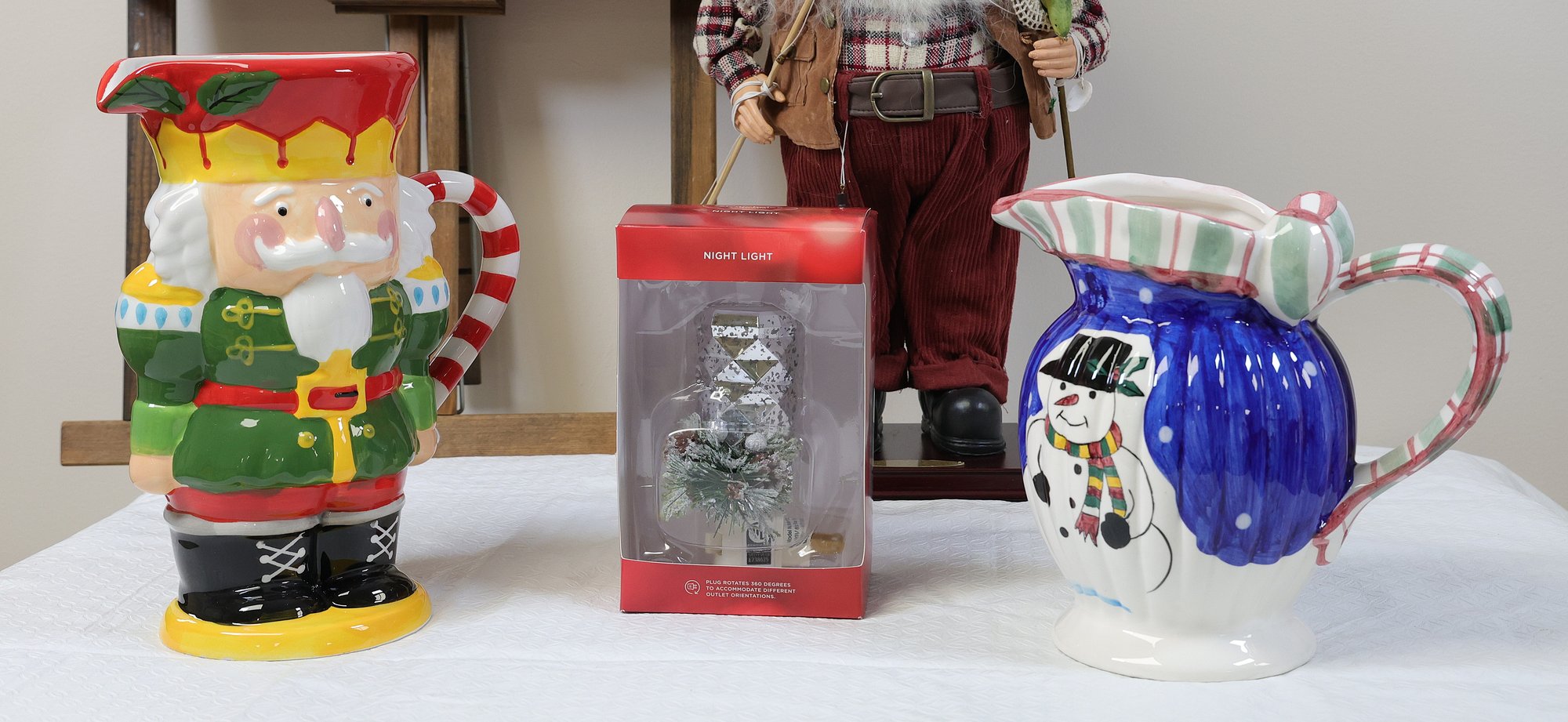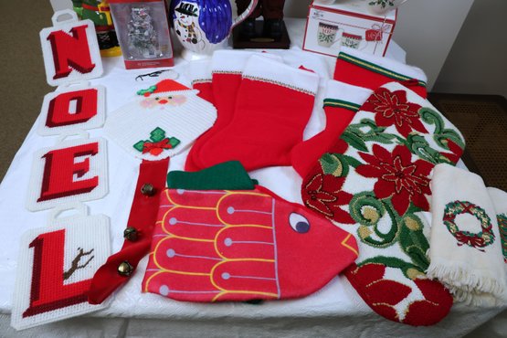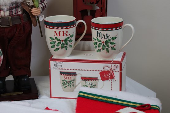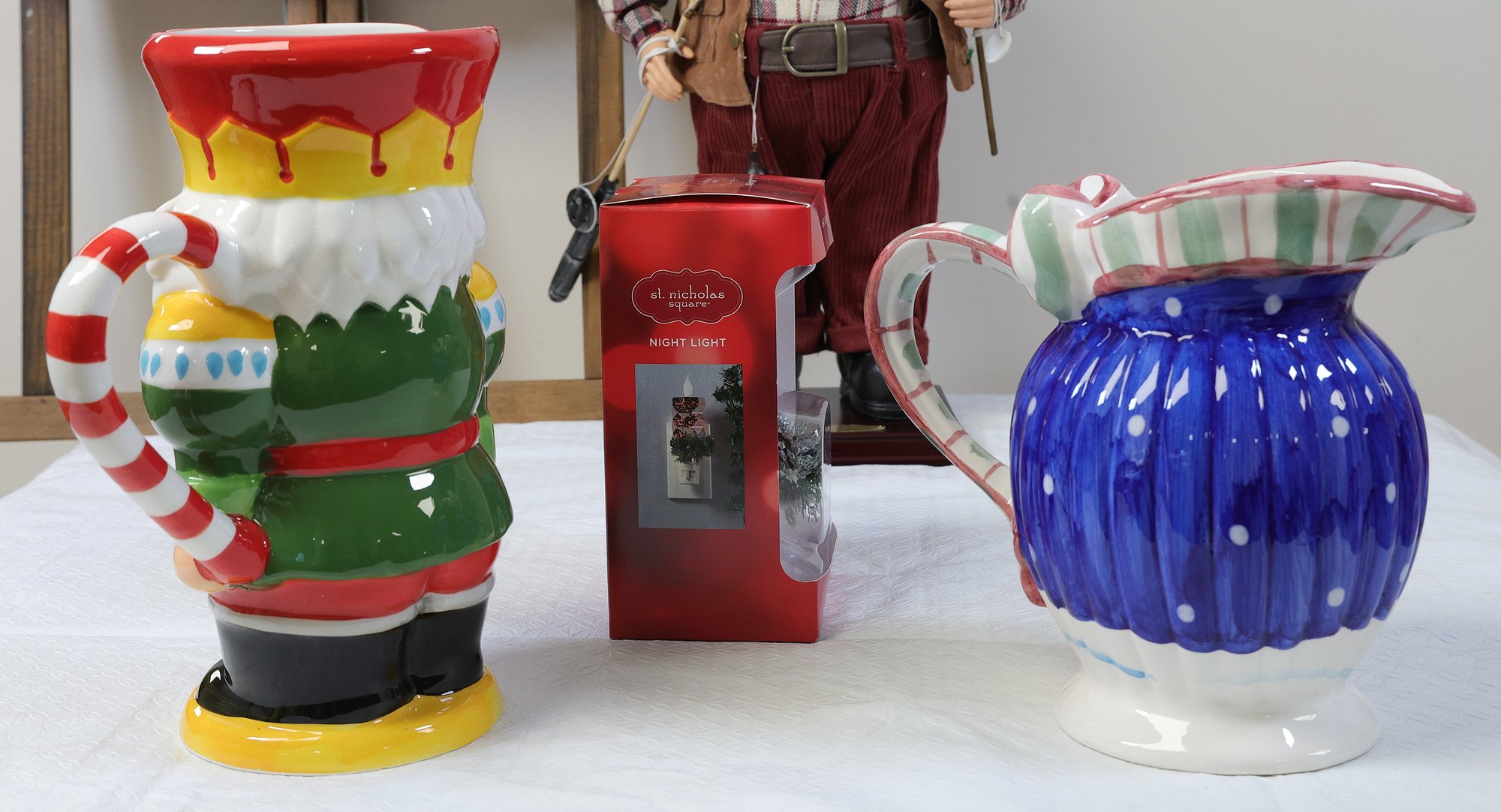 Christmas platter 15" x9" , snowman pitcher 8"H, Toy soldiers Pier1 11"H, 2004 Old world Santa collection 18.5"H, St. Nicholas night light in box, Candle Holder 5" x 5" x 10.5"H, 1- Lenox Mr. Mrs Mugs, 2 hand towels, 7 stockings, 2 knit decorations