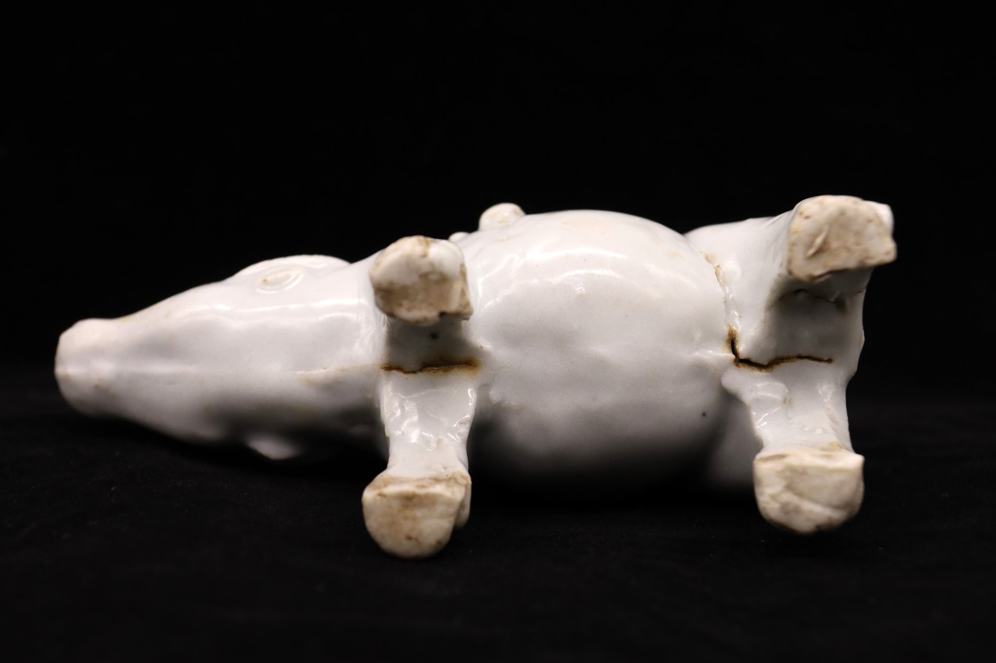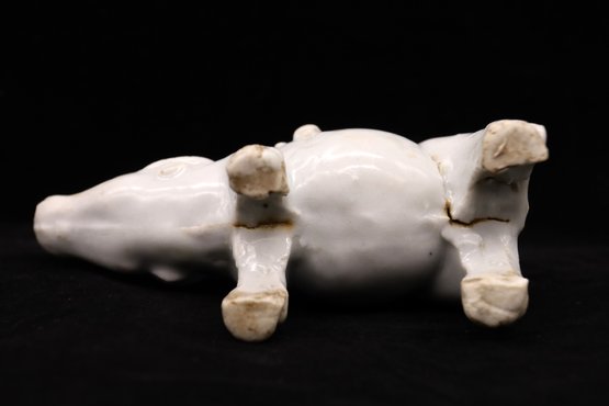 Grayish/blue creamy glazed color, Has a firing hole between the back legs. Iron oxidation on the bottom.