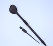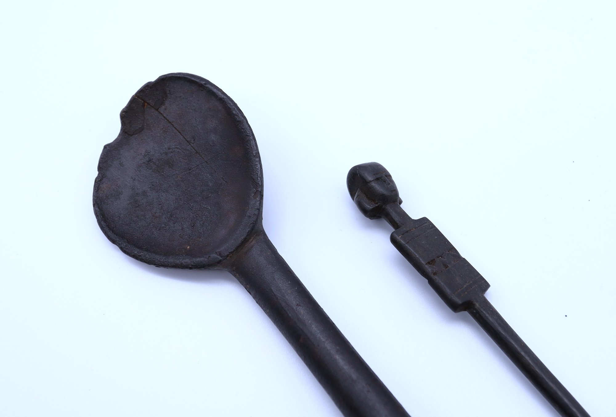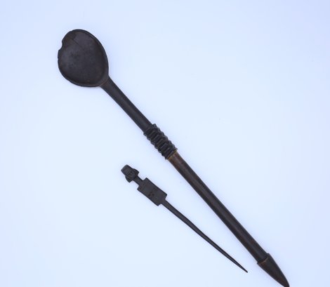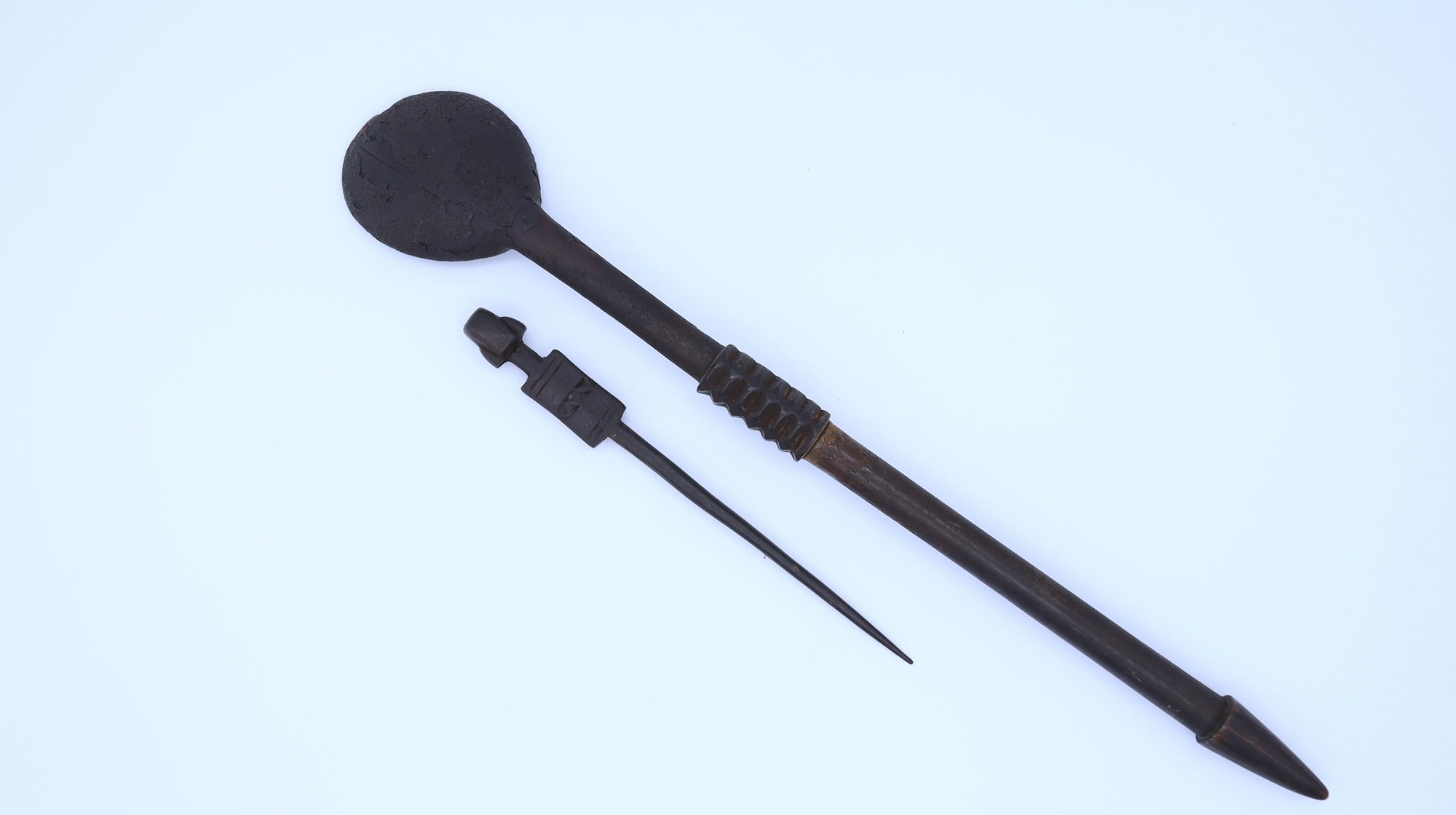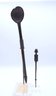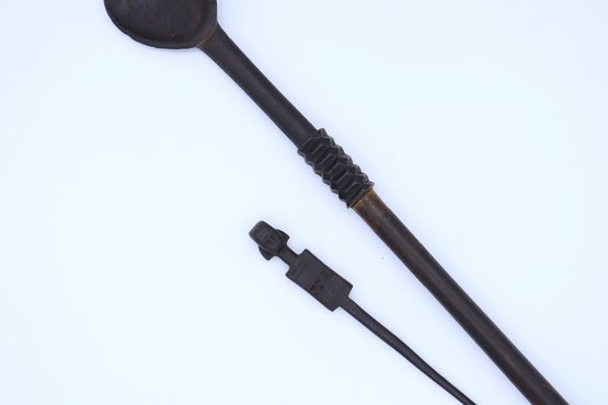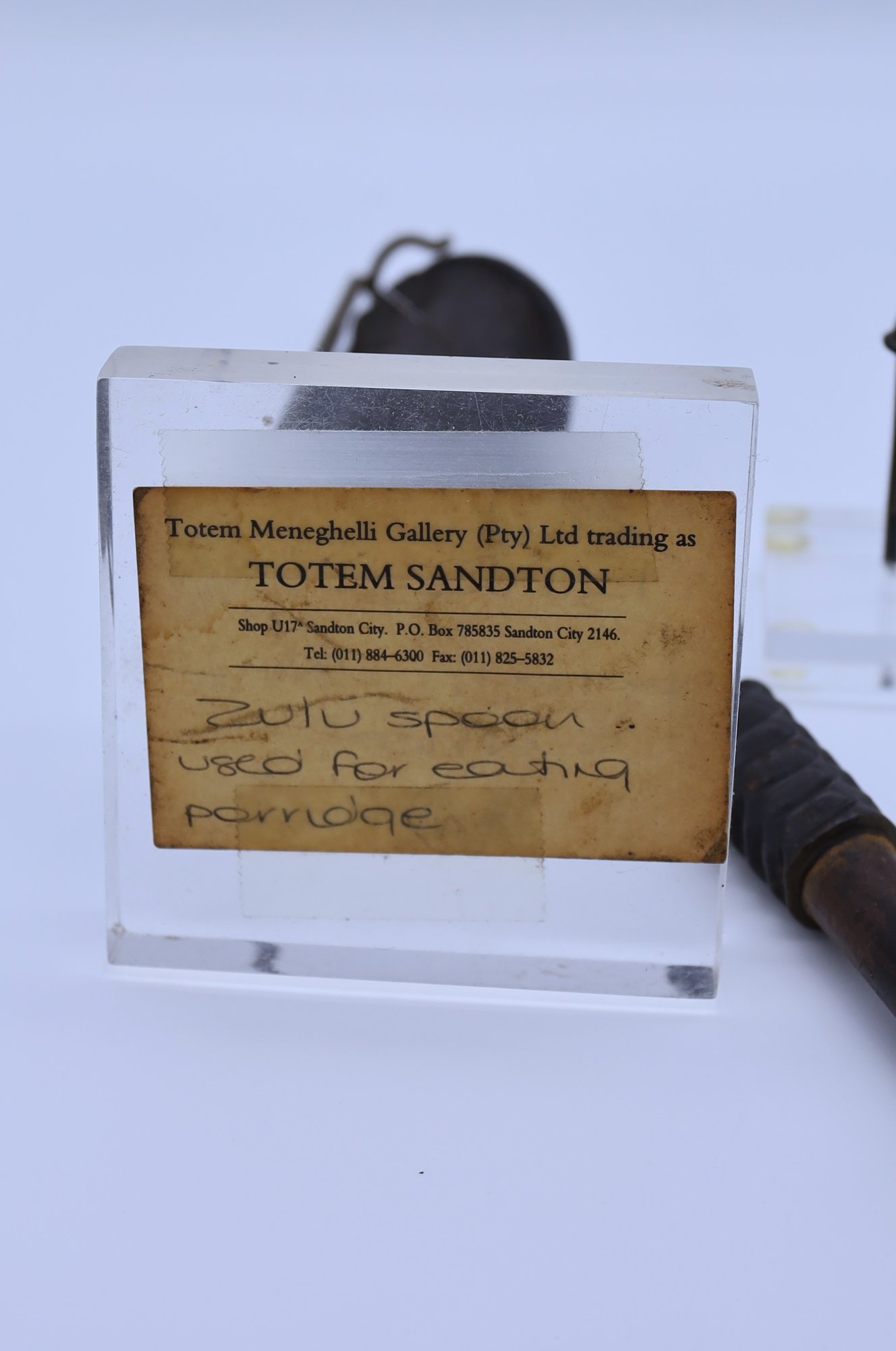 Antique Zulu wooden spoon used for eating porridge, displayed on a lucite stand. 15" H with stand.