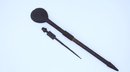 African wood wand with carvings and a point at the bottom. Displayed on a lucite base - 8"H