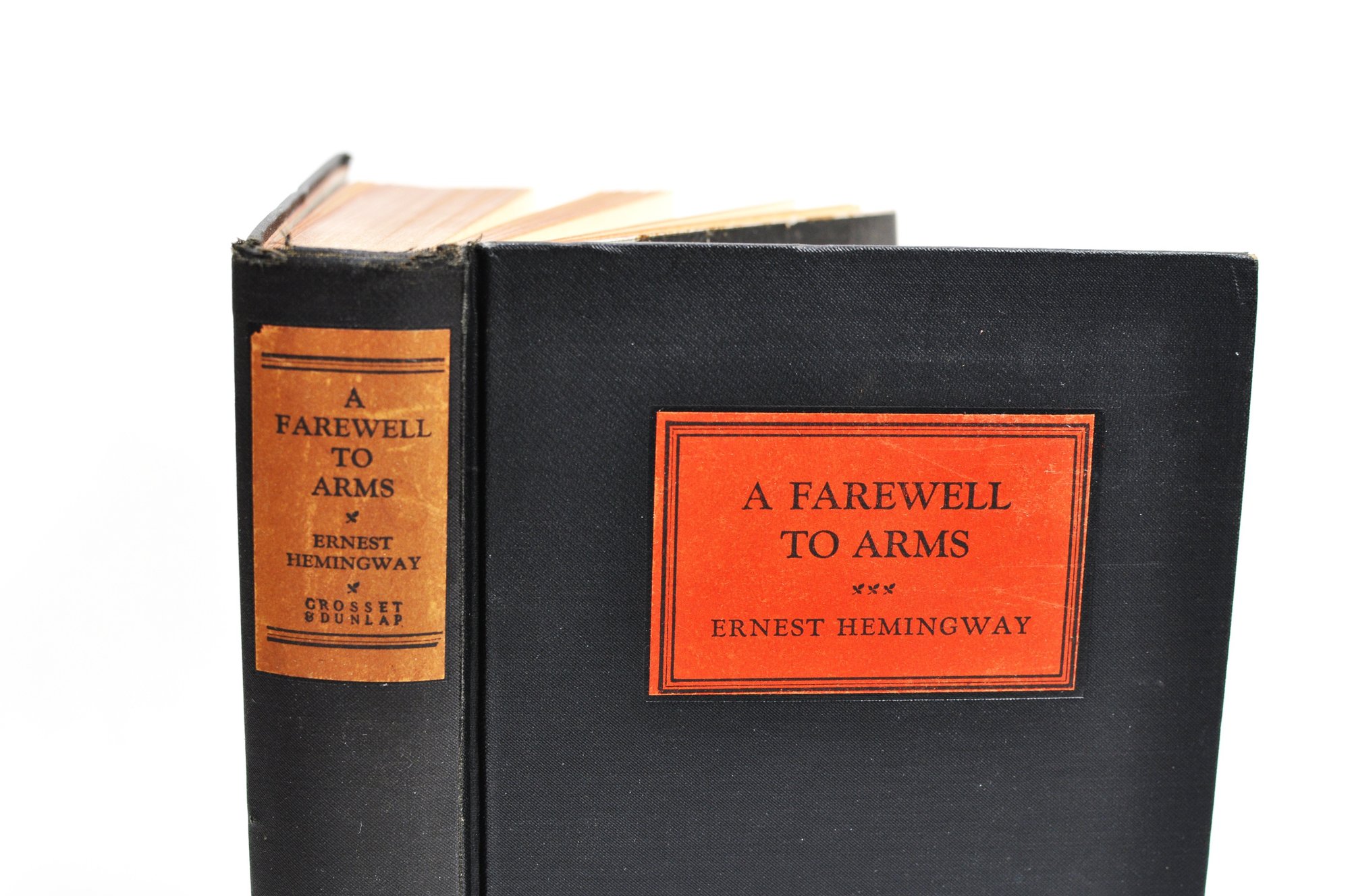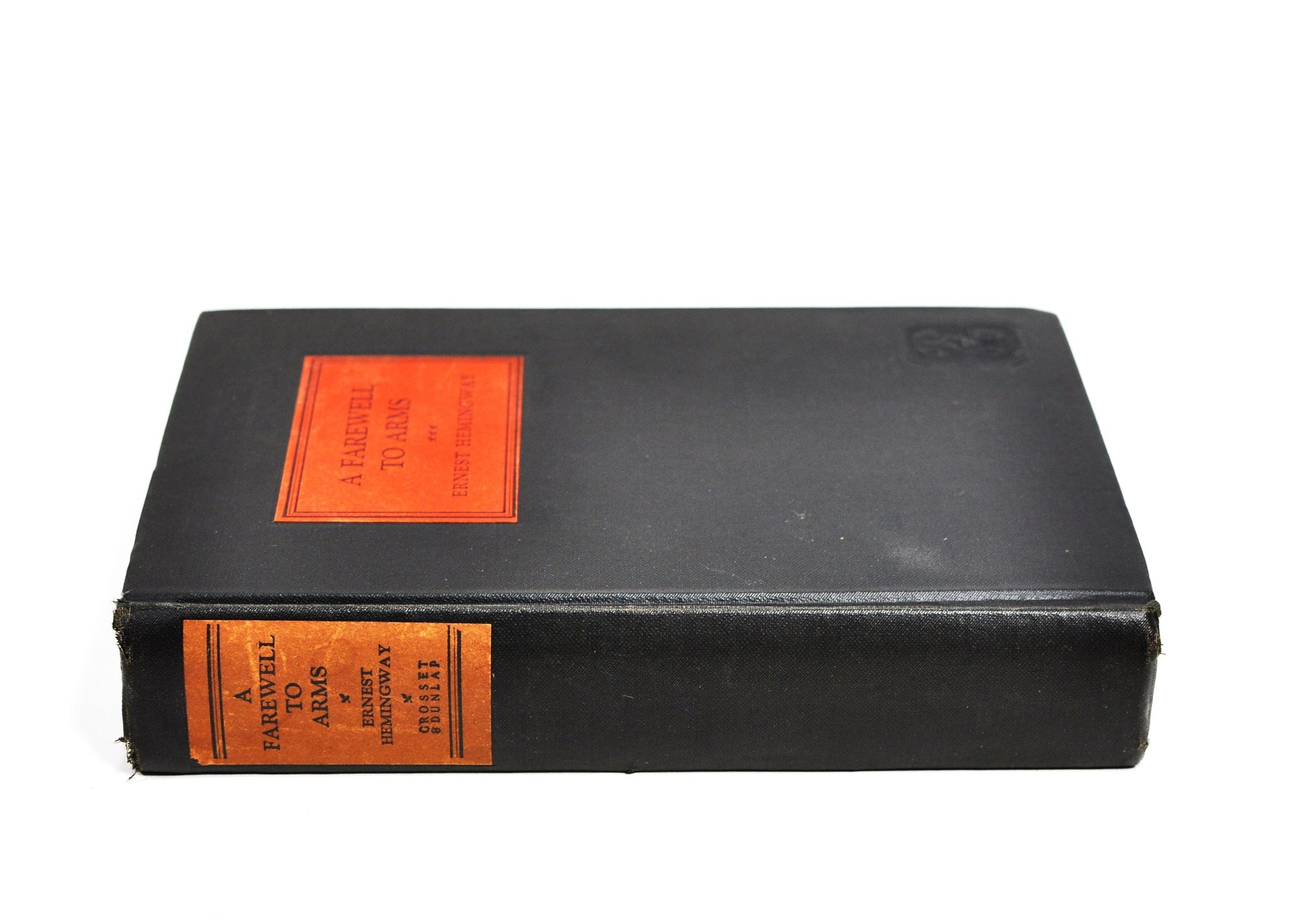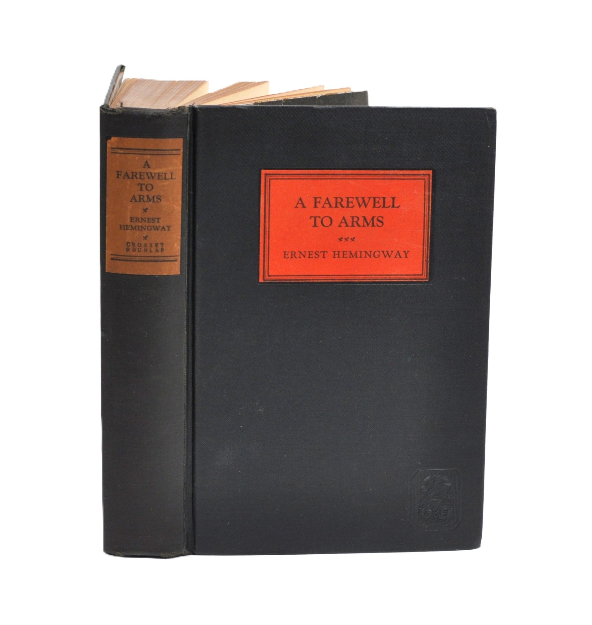 Desirable early printing of "A Farewell to Arms" by Ernest Hemingway, published by Grosset & Dunlap by arrangement with Charles Scribner’s Sons (1929). Bound in black cloth with red title label to front and spine, and publisher’s emblem stamped to lower cover.