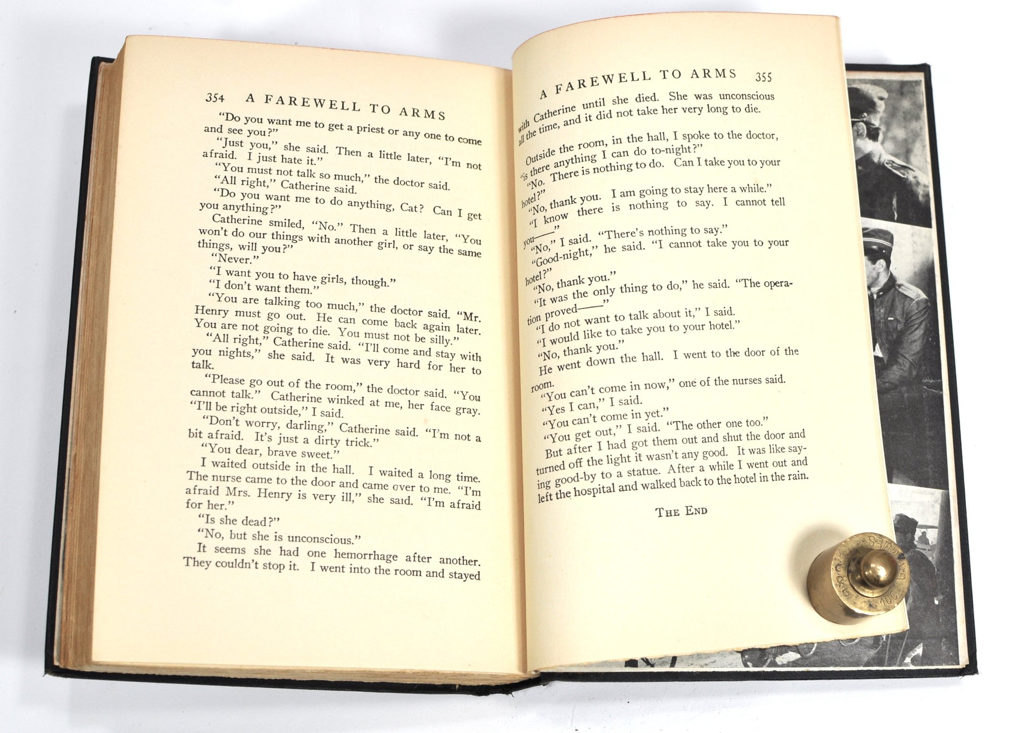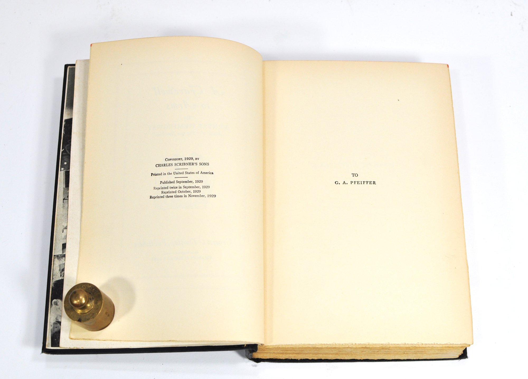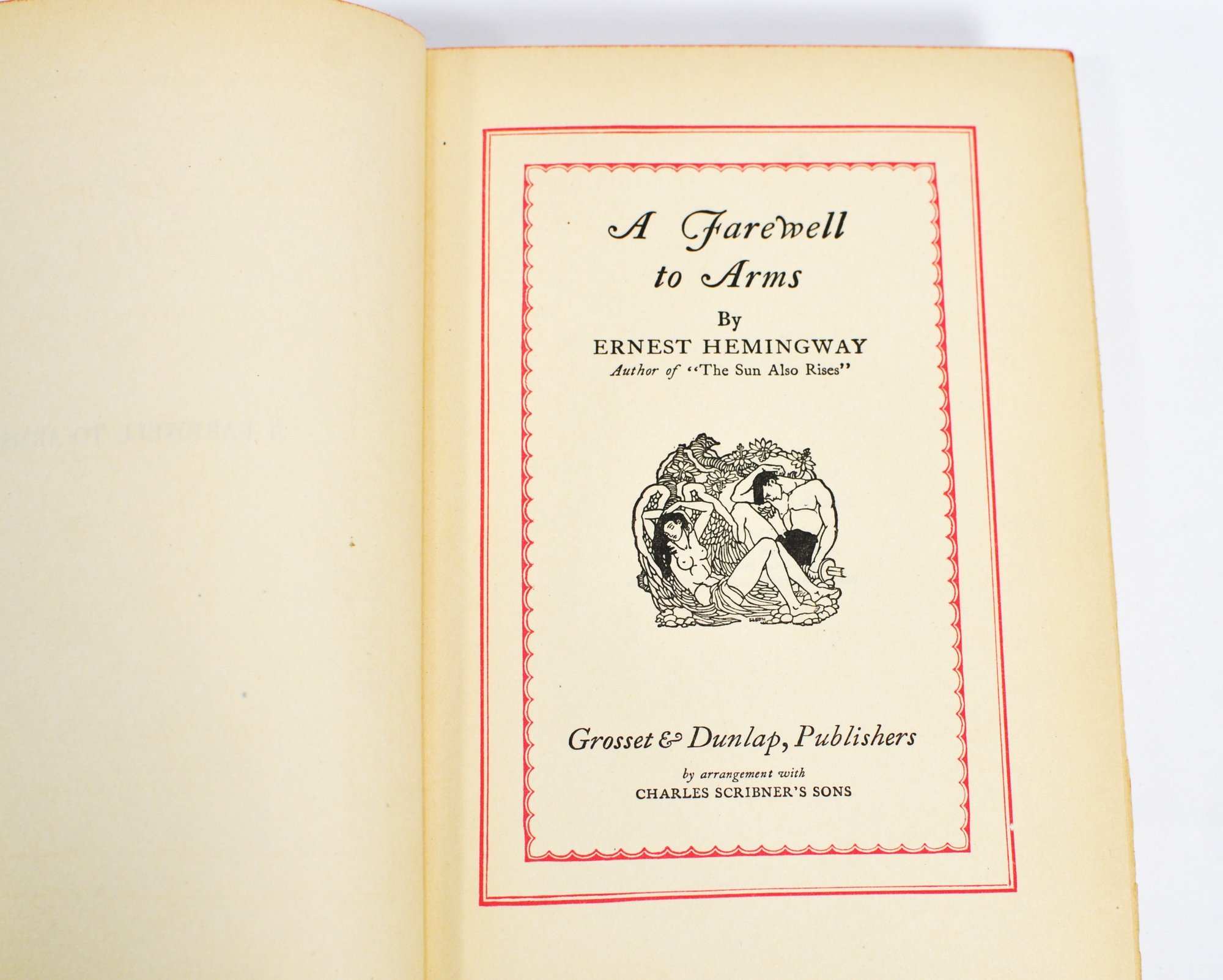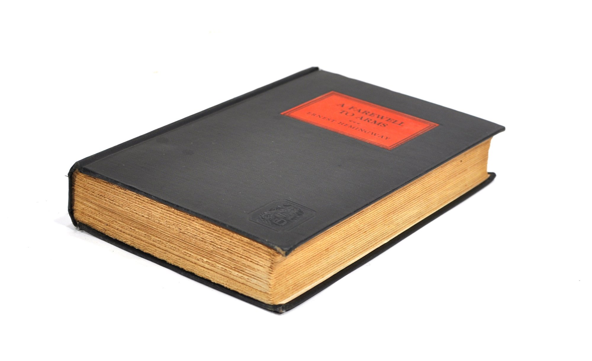 Desirable early printing of "A Farewell to Arms" by Ernest Hemingway, published by Grosset & Dunlap by arrangement with Charles Scribner’s Sons (1929). Bound in black cloth with red title label to front and spine, and publisher’s emblem stamped to lower cover.