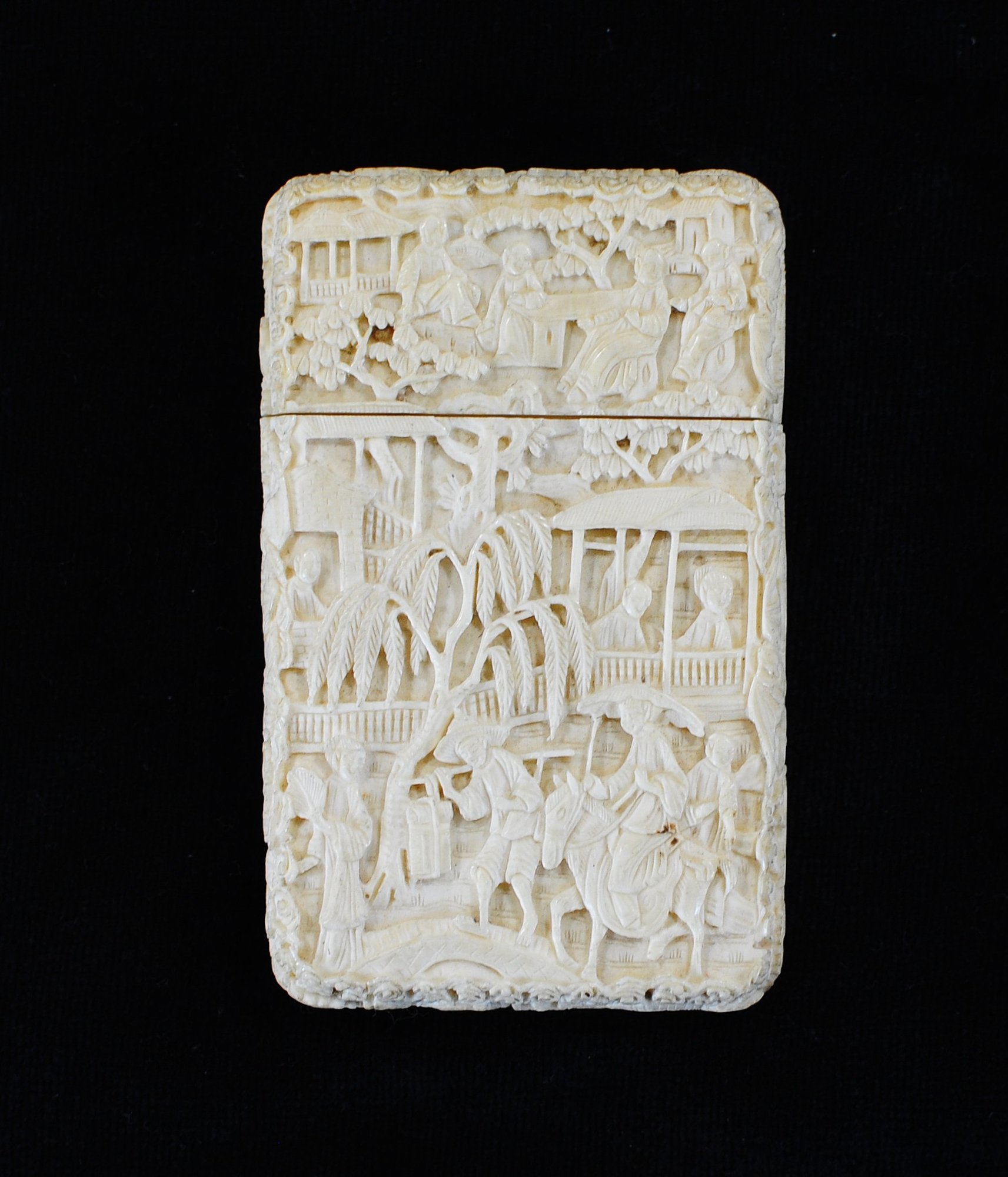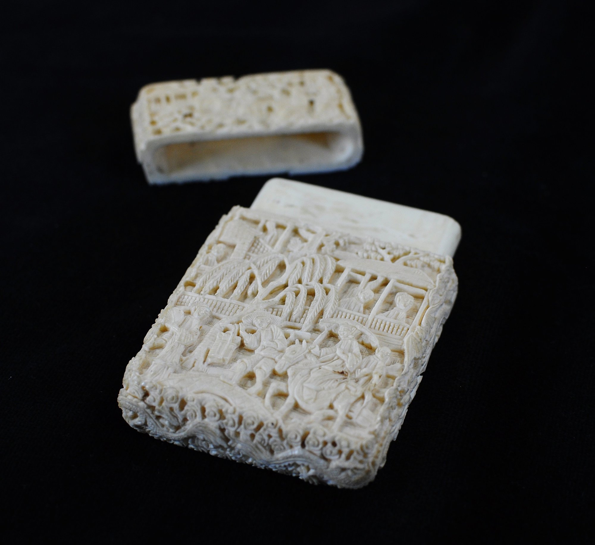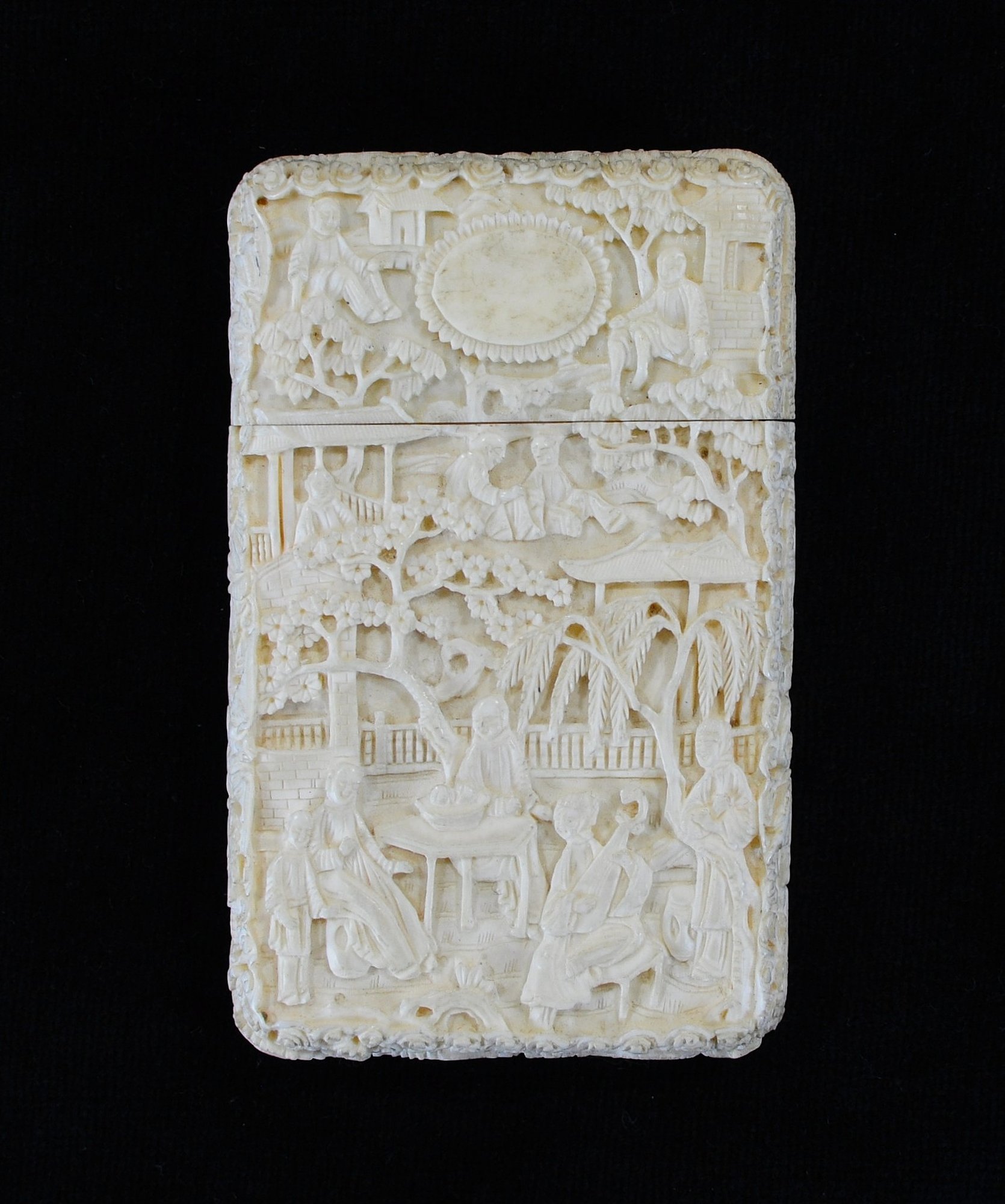 Intricately hand-carved figural snuff box depicting detailed Chinese garden and courtyard scenes populated with scholars, attendants, pavilions, bridges, trees, and flowing robes. Both front and reverse are deeply carved in relief, showing multiple narrative vignettes with architectural and landscape elements framed by a decorative border.