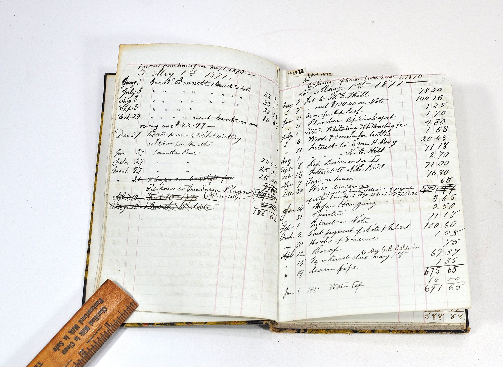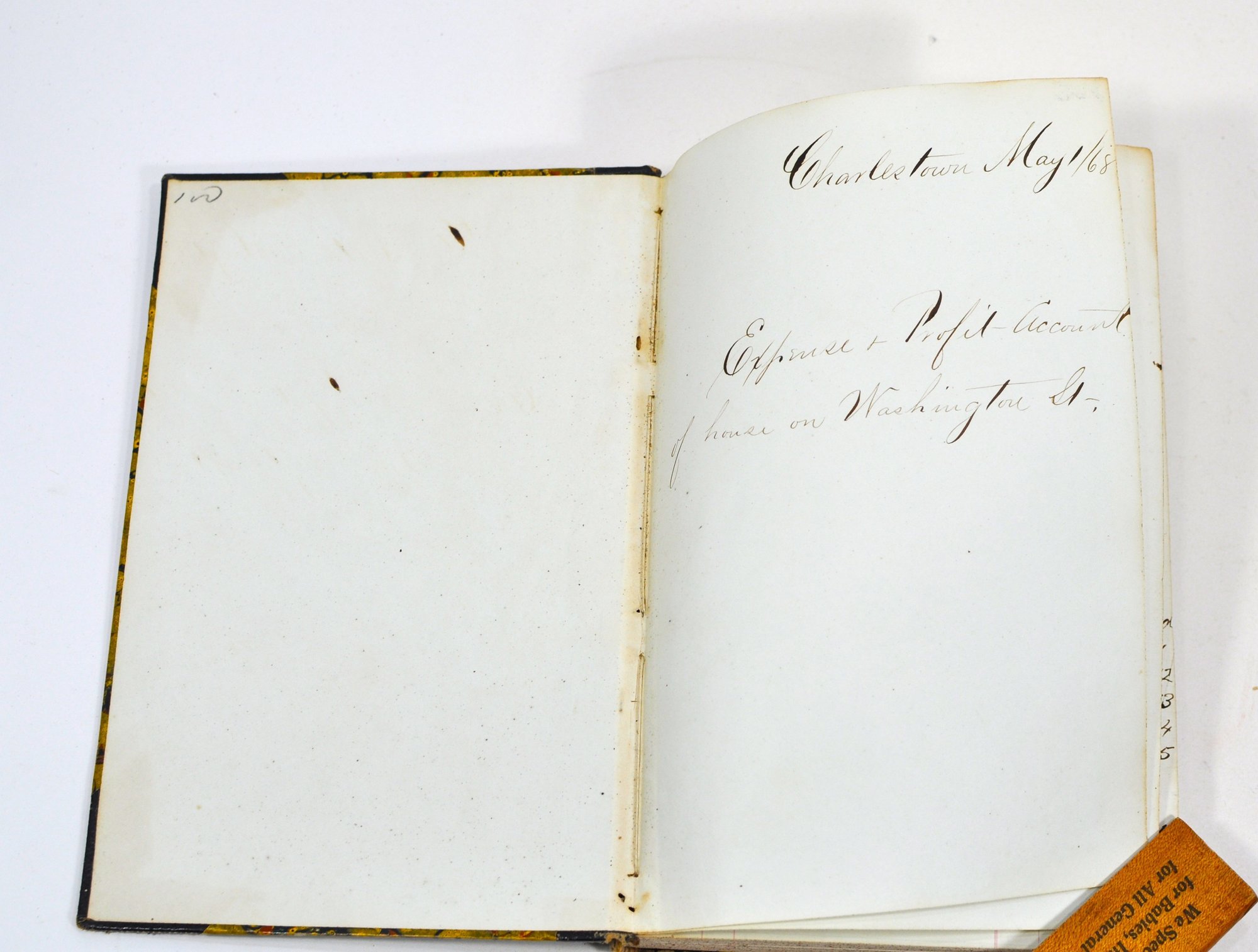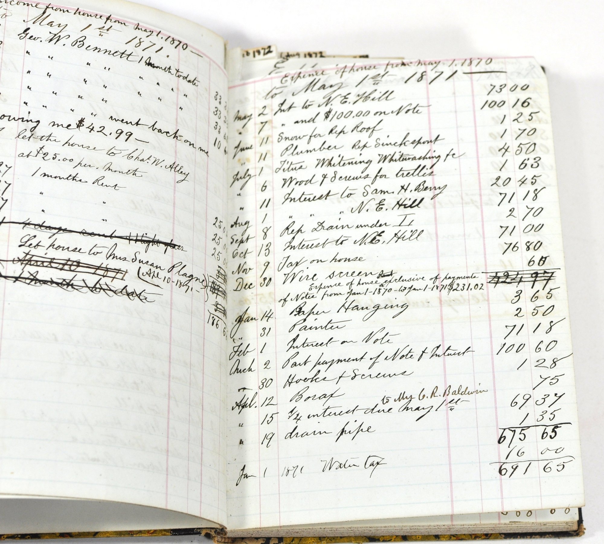 Antique ledger/journal with marbled covers and black spine, filled with handwritten entries dated 1868–1870s. Includes detailed accounts, notes, and an early ink signature.