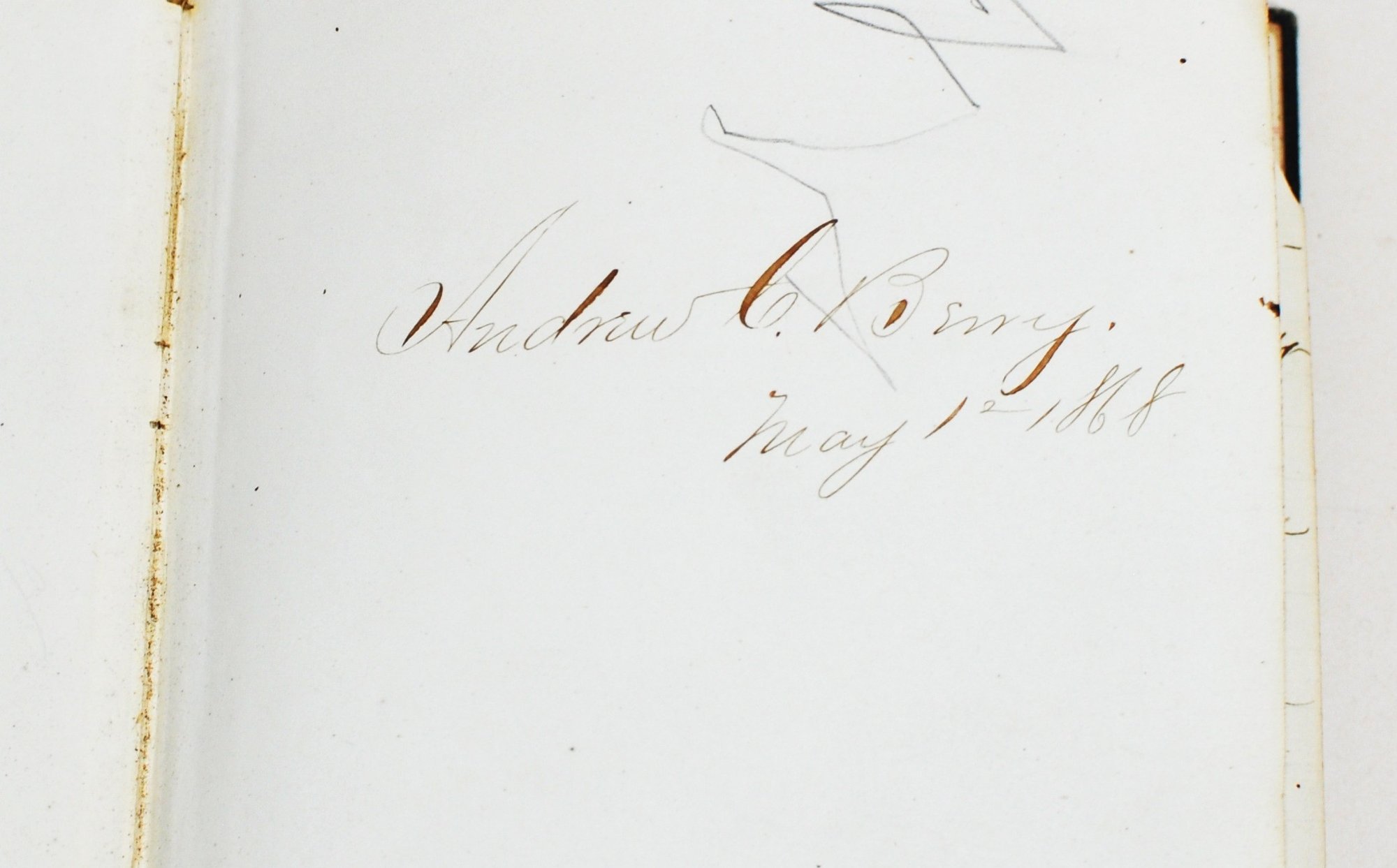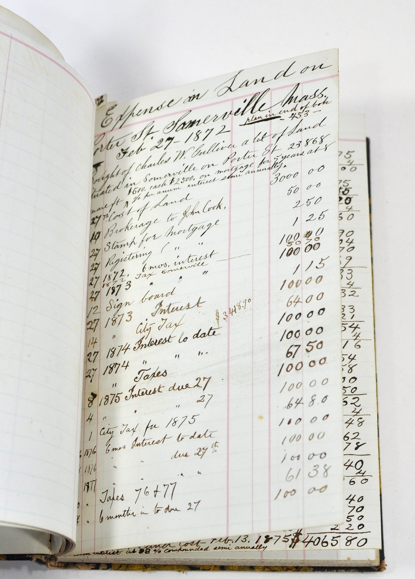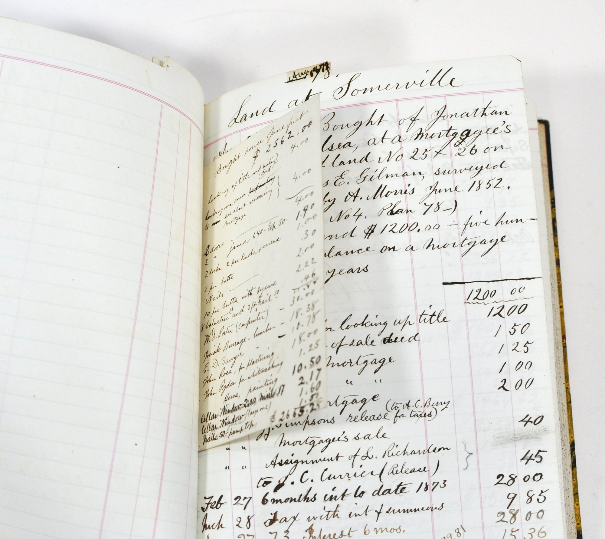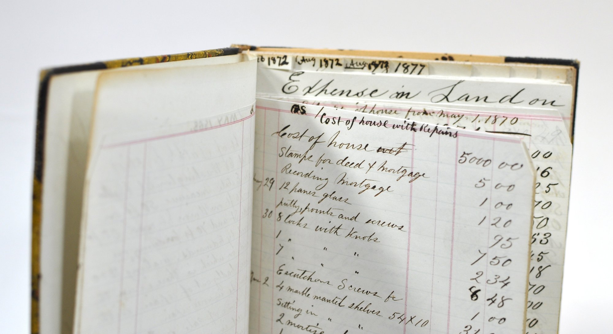 Antique ledger/journal with marbled covers and black spine, filled with handwritten entries dated 1868–1870s. Includes detailed accounts, notes, and an early ink signature.
