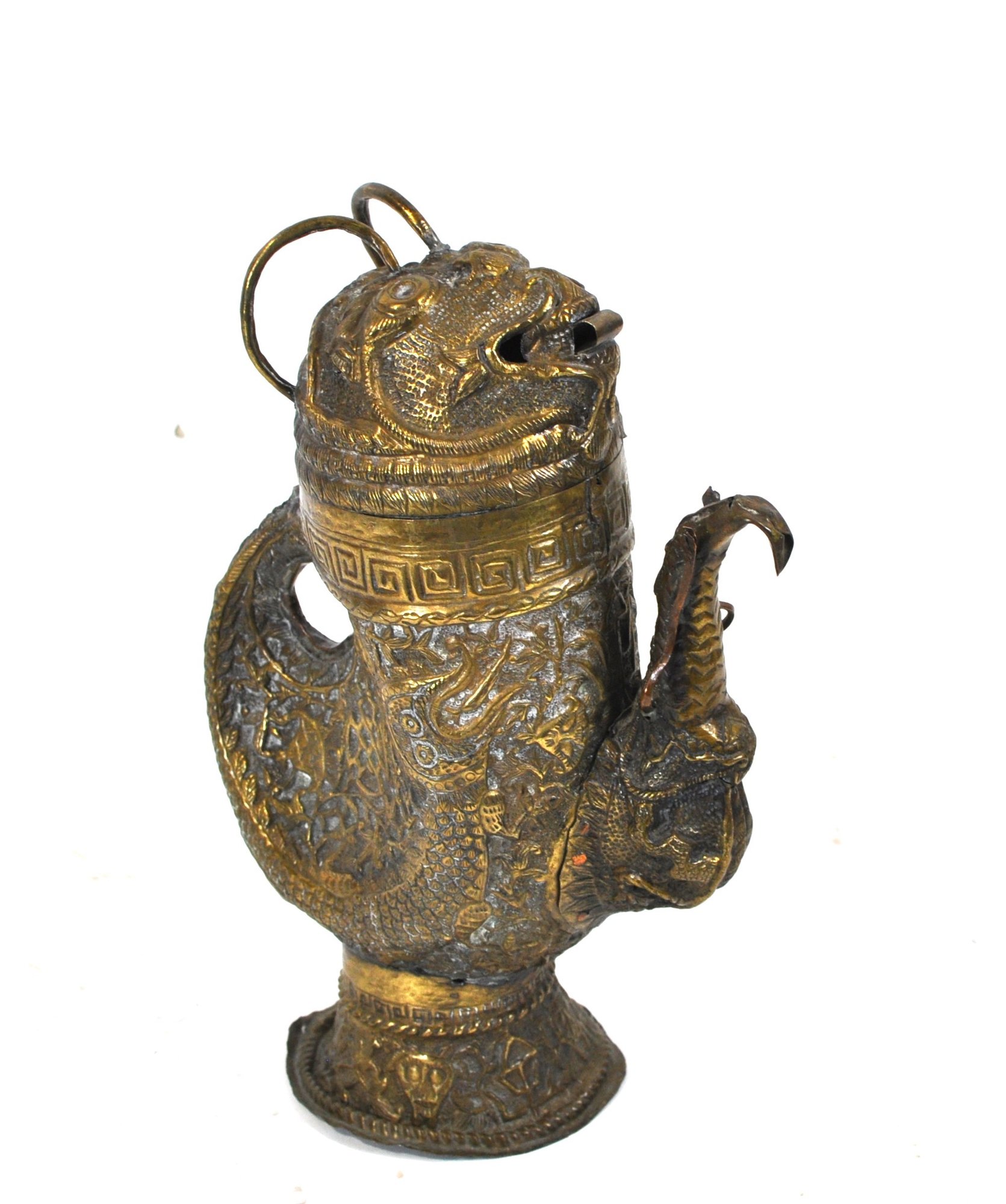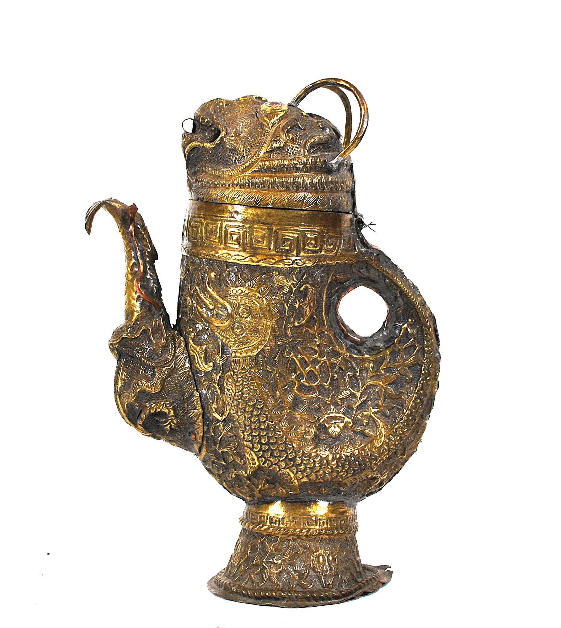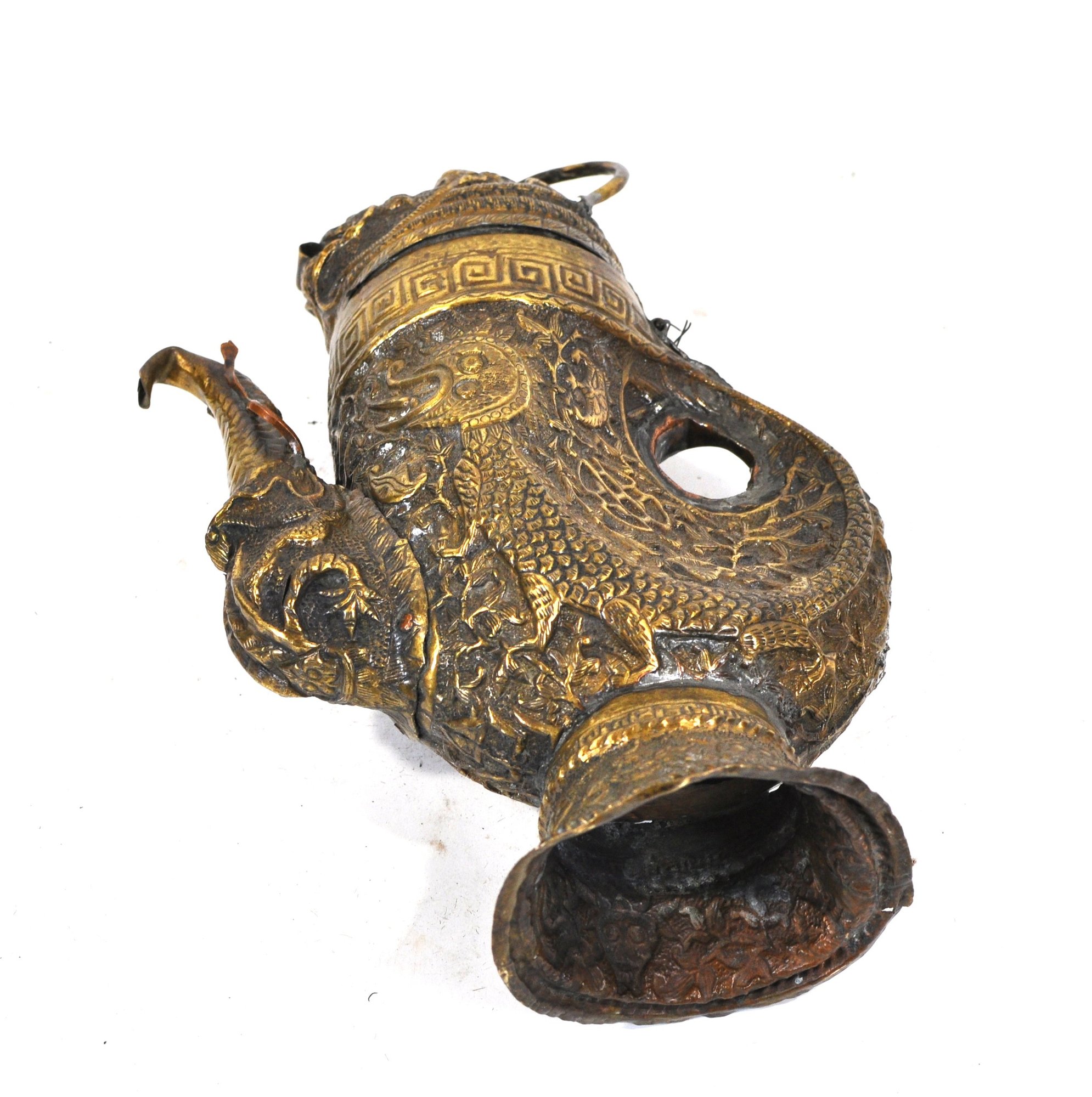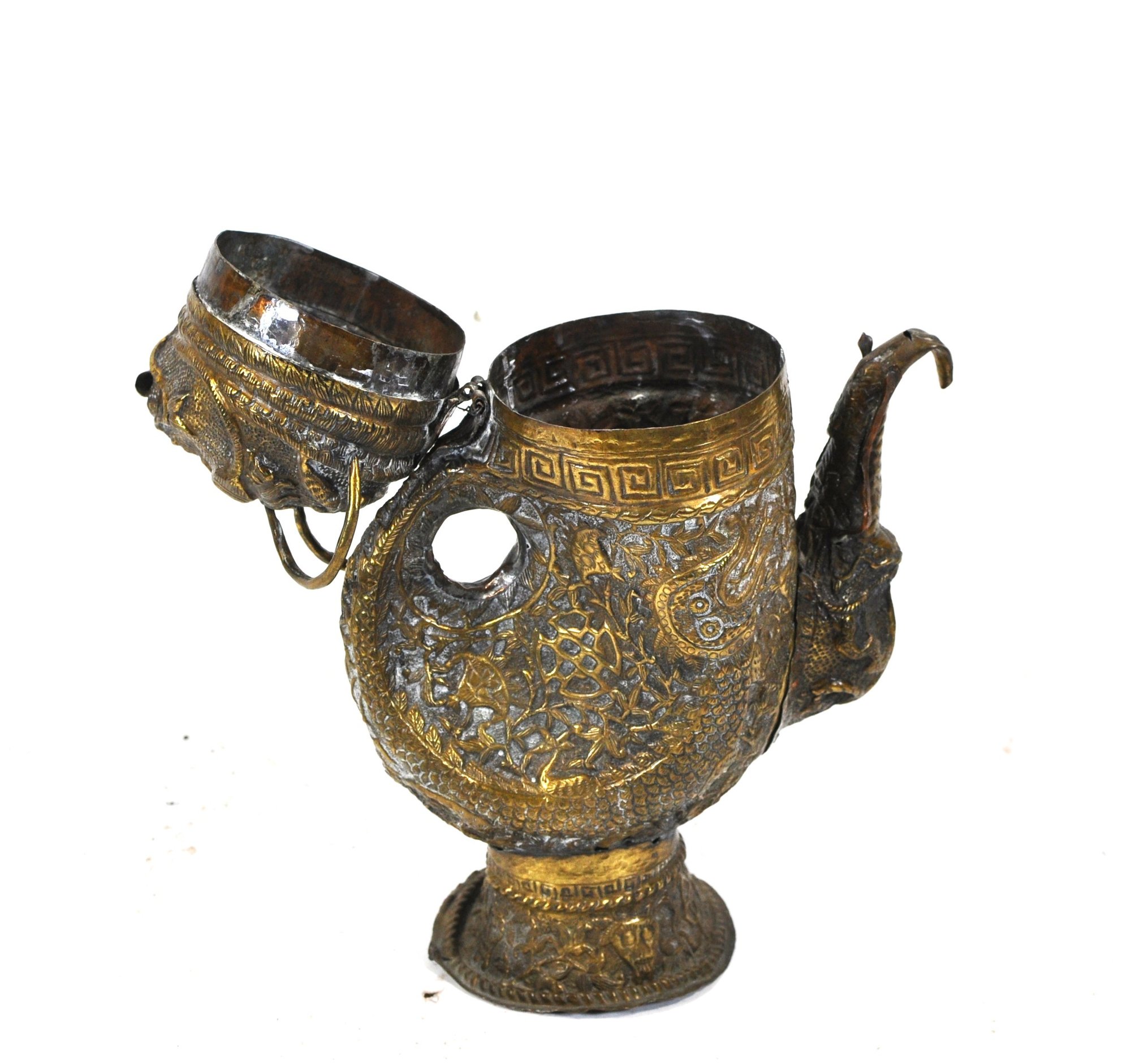 Tibetan copper alloy ewer dating to the 19th century, finely modeled in the form of a stylized bird. The vessel is richly decorated in repoussé with mythical beasts, scrolling foliage, and traditional geometric borders. The curved spout takes the shape of a bird’s head, while the hinged lid is surmounted by a mask-like creature with ring handles rising from the top.