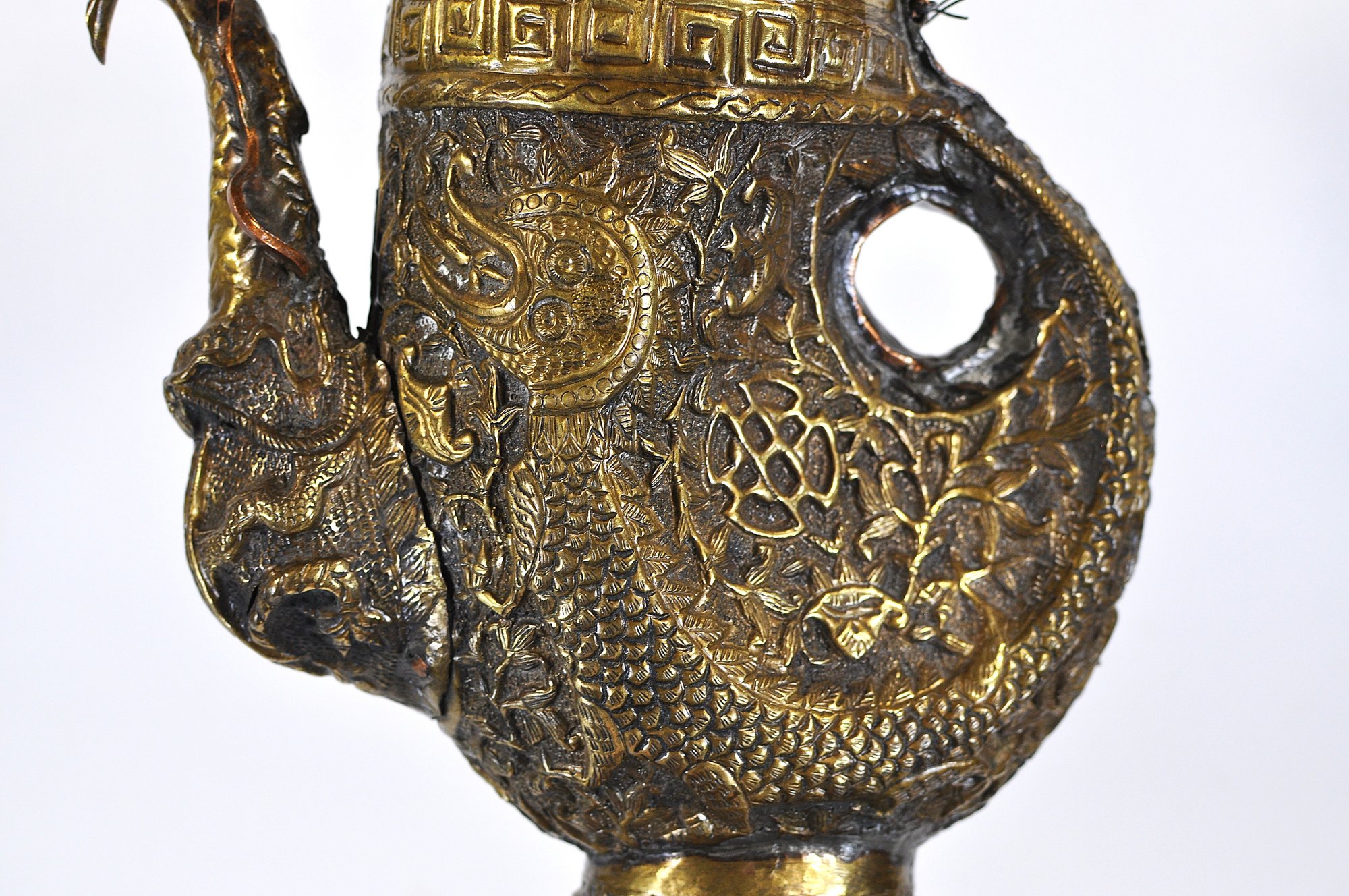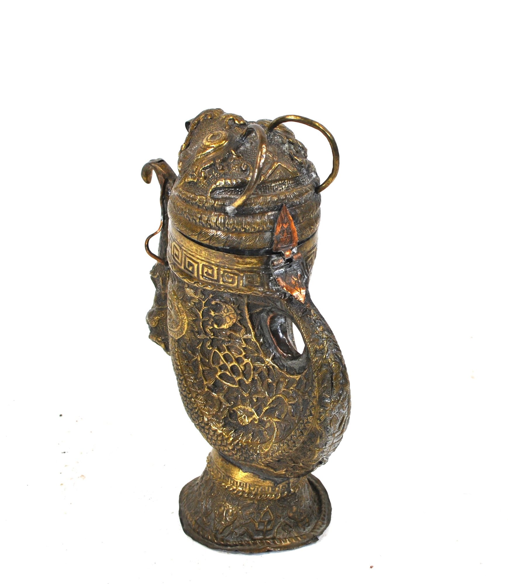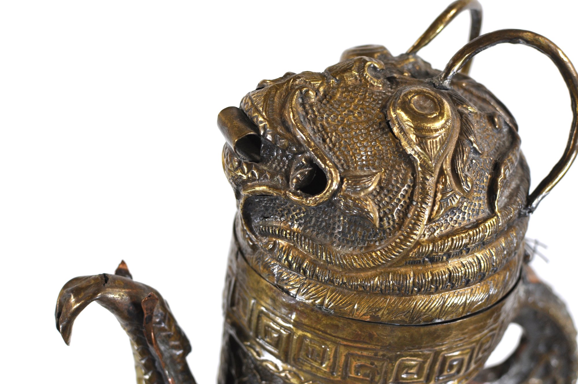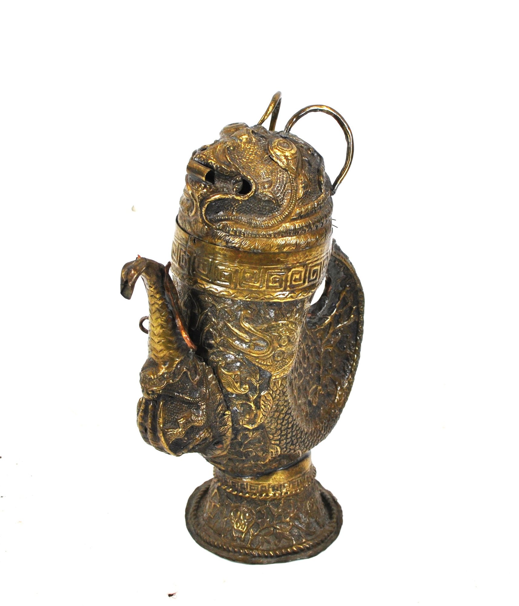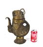 Tibetan copper alloy ewer dating to the 19th century, finely modeled in the form of a stylized bird. The vessel is richly decorated in repoussé with mythical beasts, scrolling foliage, and traditional geometric borders. The curved spout takes the shape of a bird’s head, while the hinged lid is surmounted by a mask-like creature with ring handles rising from the top.