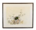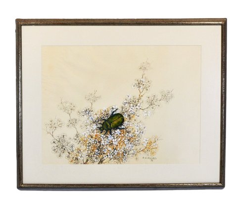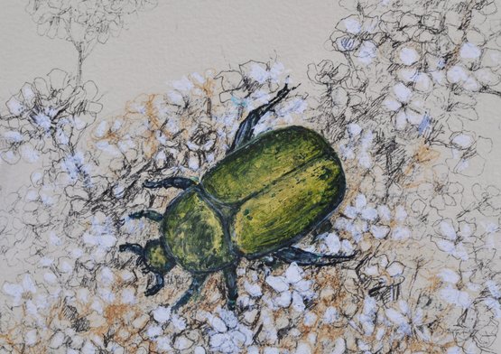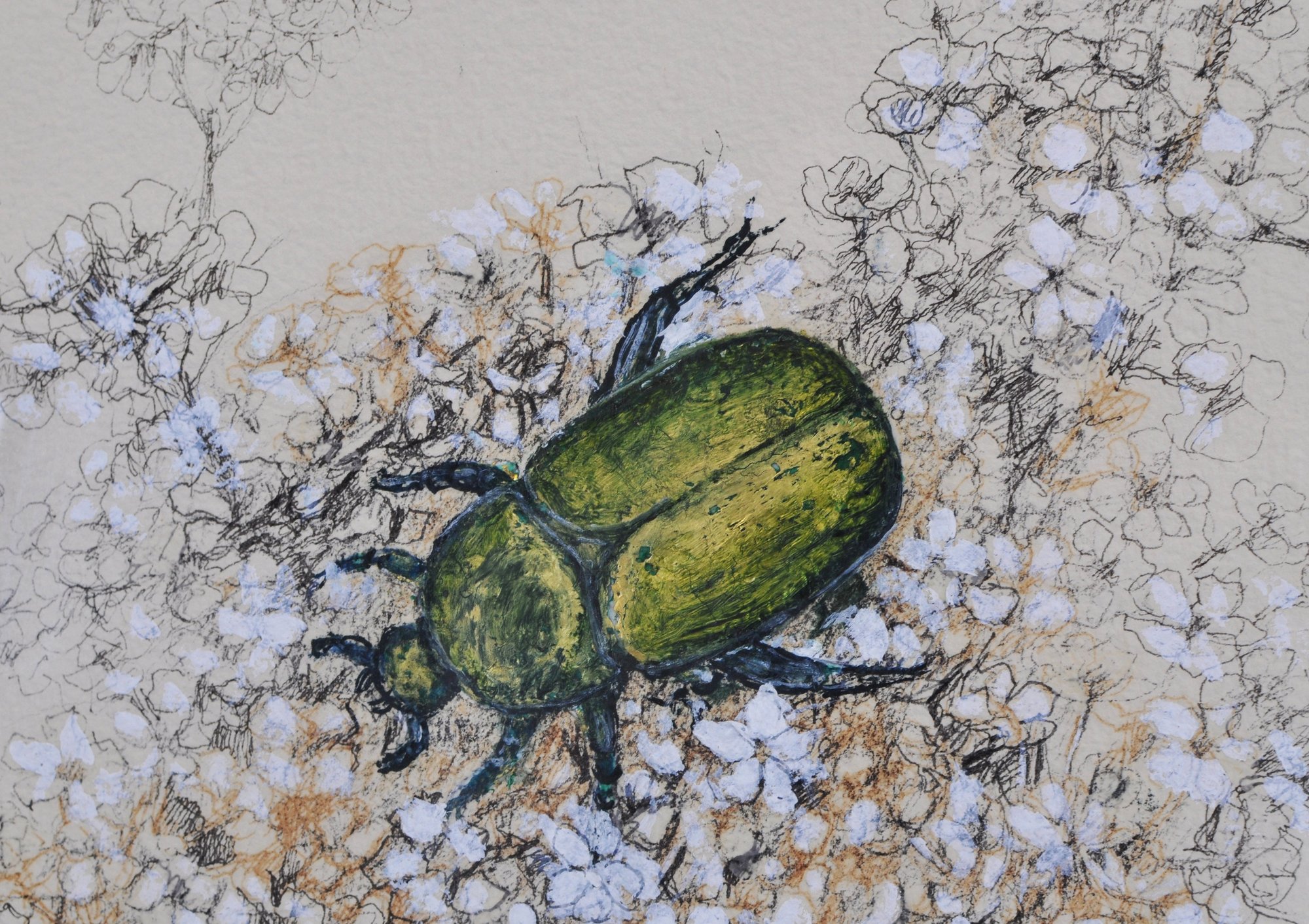 The composition depicts a vivid green beetle resting among finely detailed wildflowers, combining pen-and-ink linework with subtle color accents.
