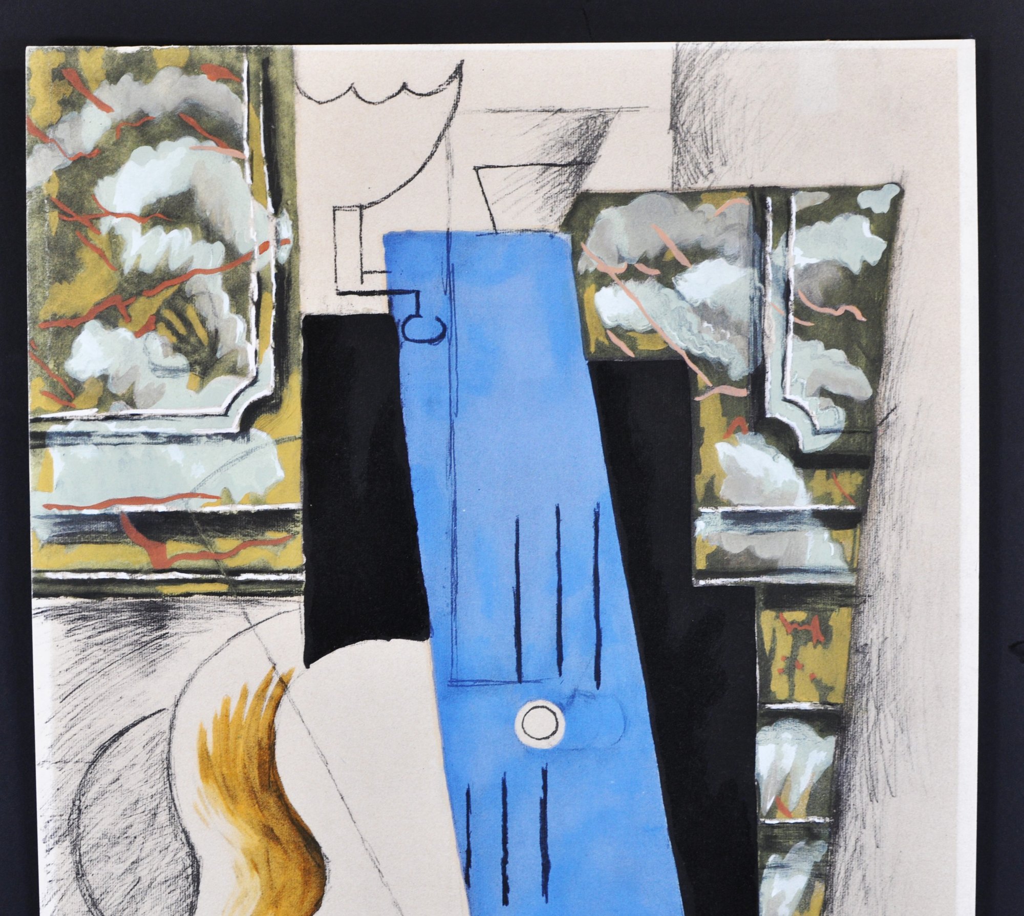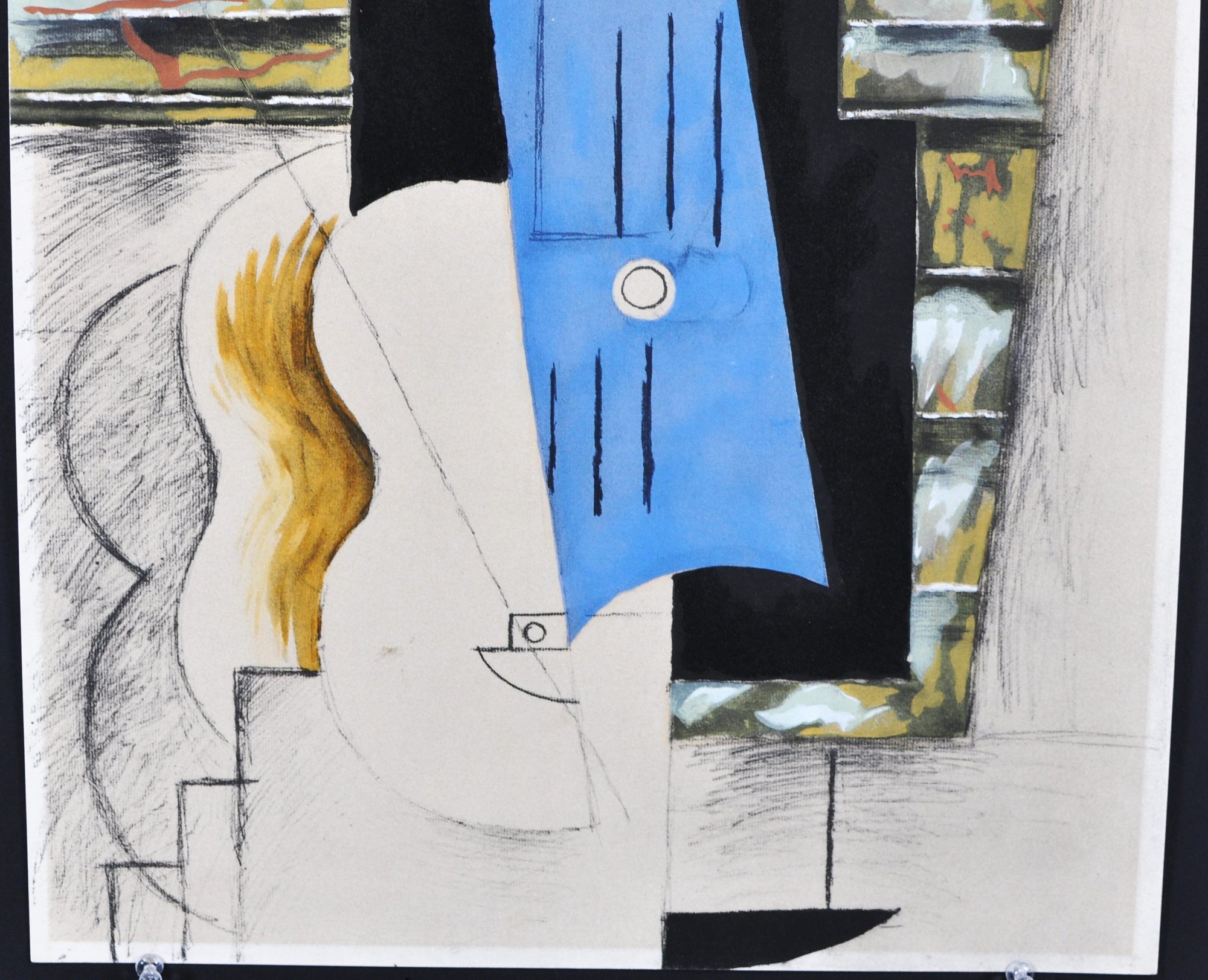 The composition features fragmented geometric planes and architectural motifs, accented with bold color blocks and linear graphite elements in a classic Picasso manner. Pencil annotation on the reverse identifies the work and original reference title. Possibly pPrinted by Mourlot Frères in Daniel Jacomet's workshops. Achieved under Gilberte de Jouvenel's direction the 15th May, 1962. Needs further research.