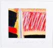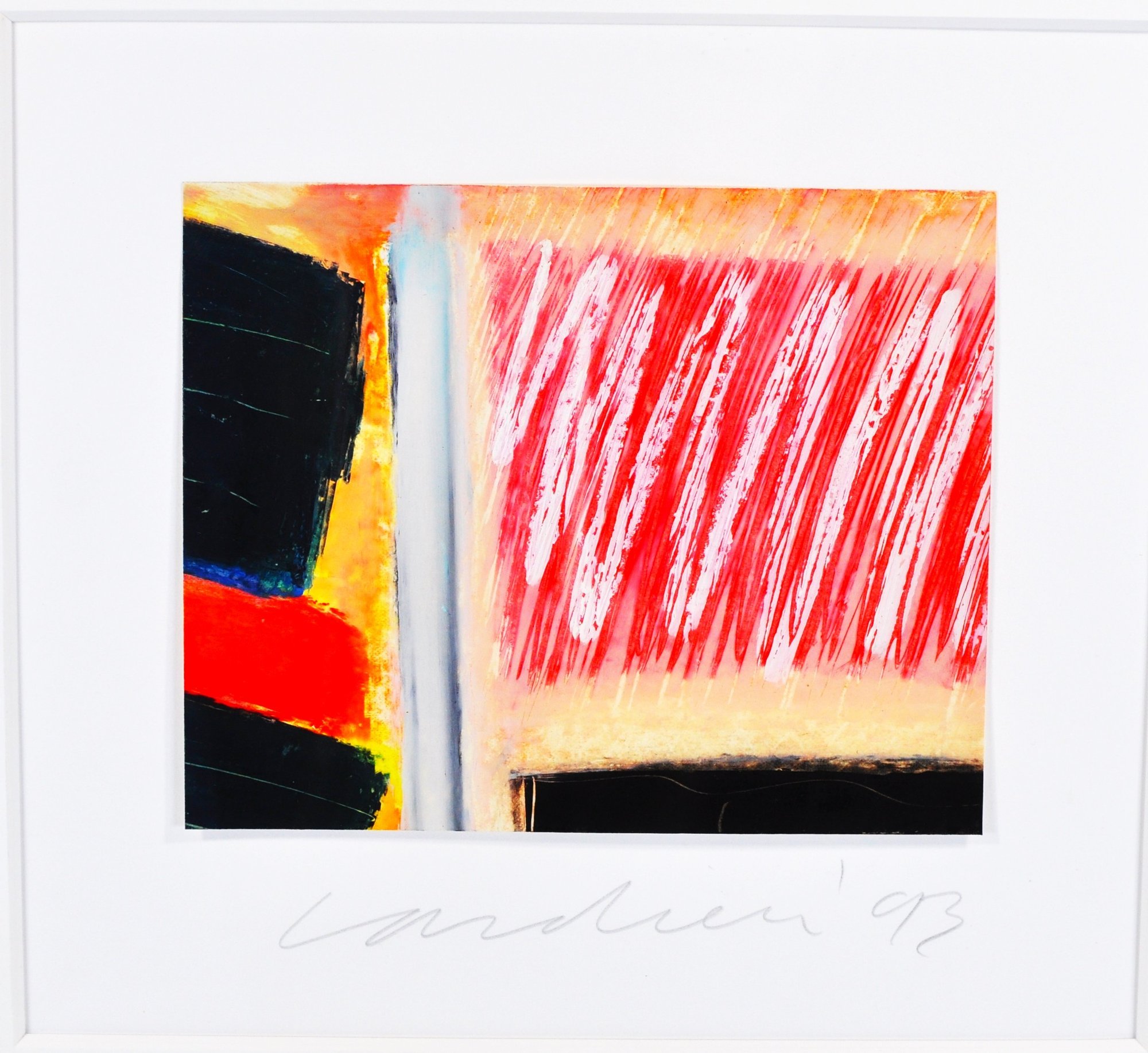 Original abstract artwork featuring bold color blocks in red, black, yellow, and cream with expressive textured strokes. Pencil-signed and dated ’93 below the image (artist’s signature appears as “Larsen” or similar—please see photos).
