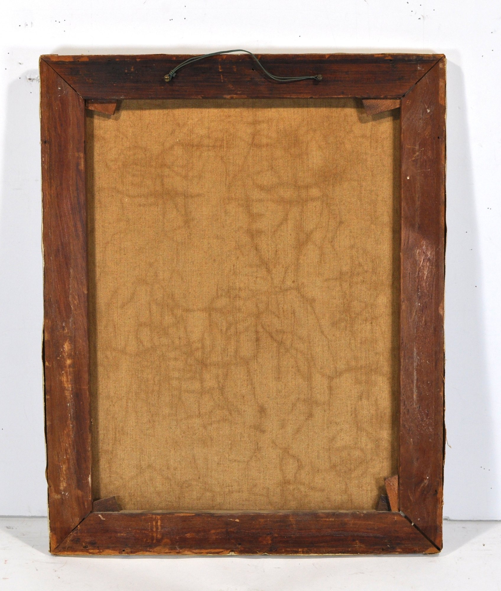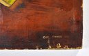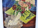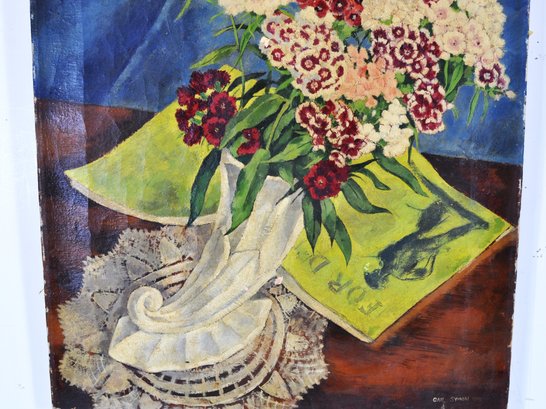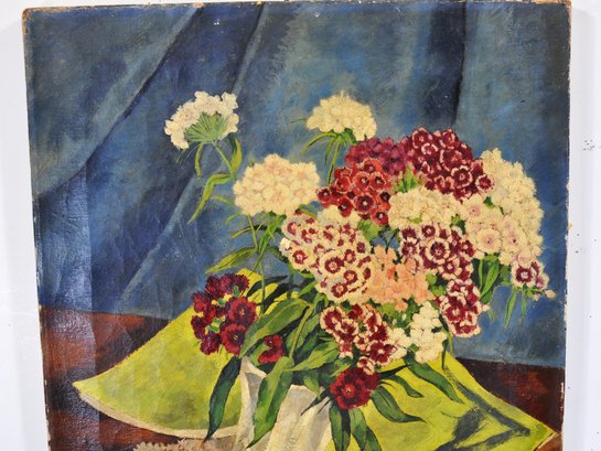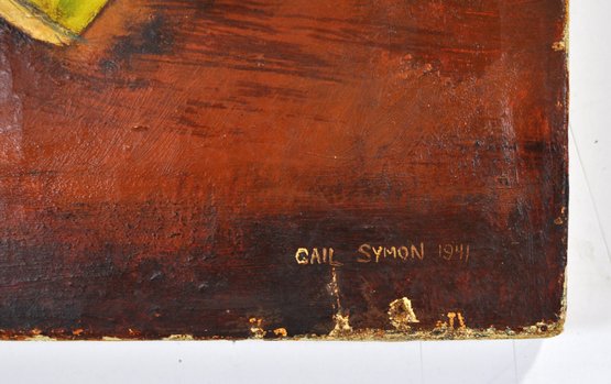 Original oil painting by Gail Symon, dated 1941, depicting a vibrant floral still life with red, cream, and pale yellow blossoms set against a deep blue draped background. The composition includes a classical plaster fragment and green book, lending a refined, mid-20th-century aesthetic.