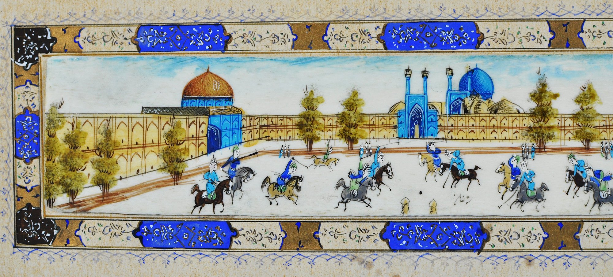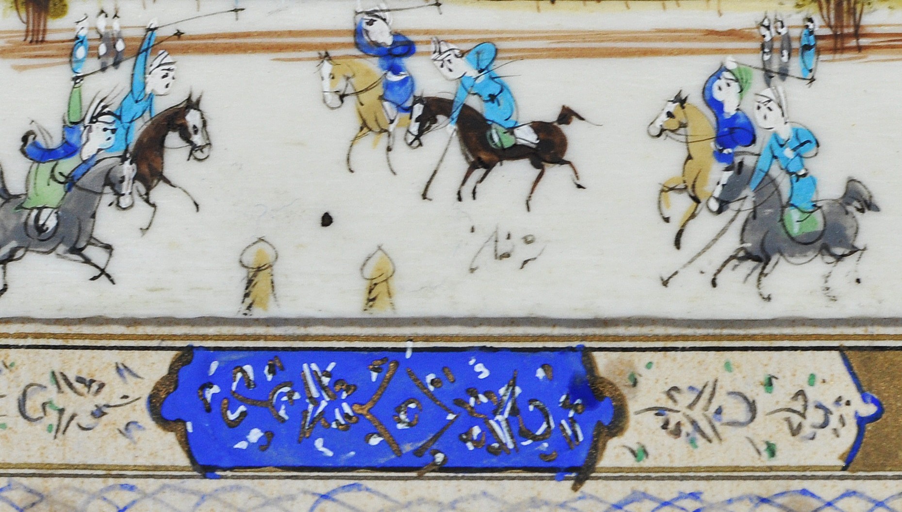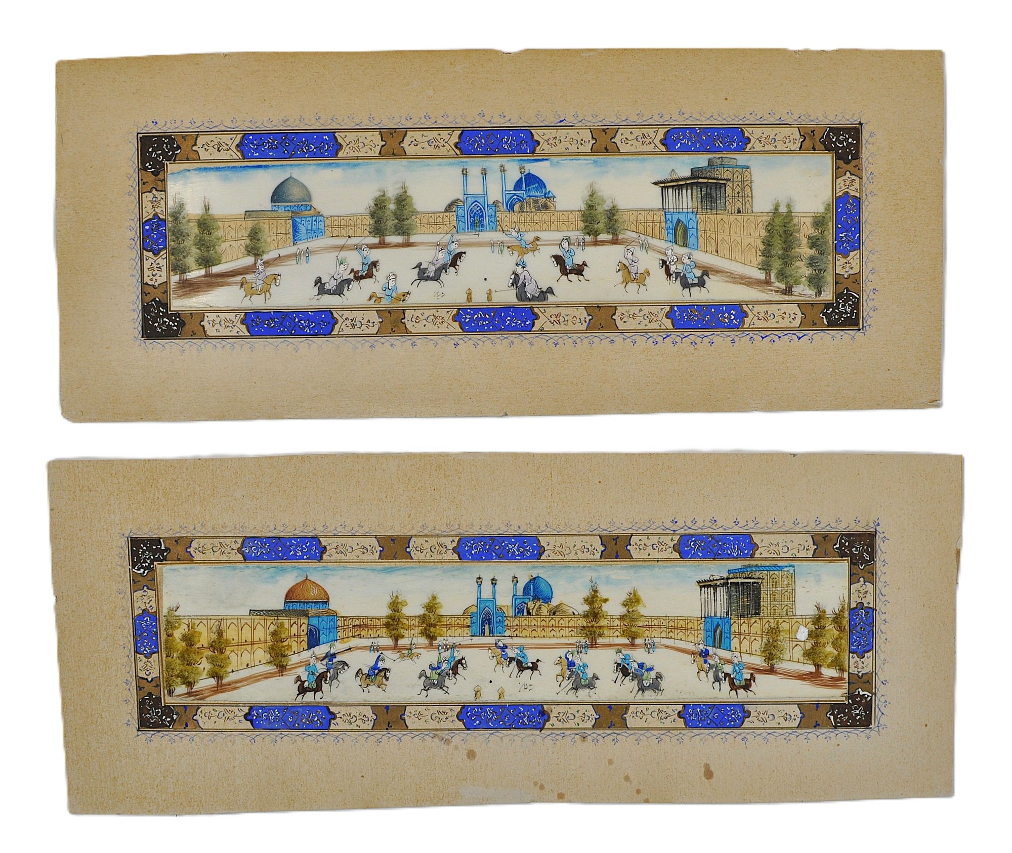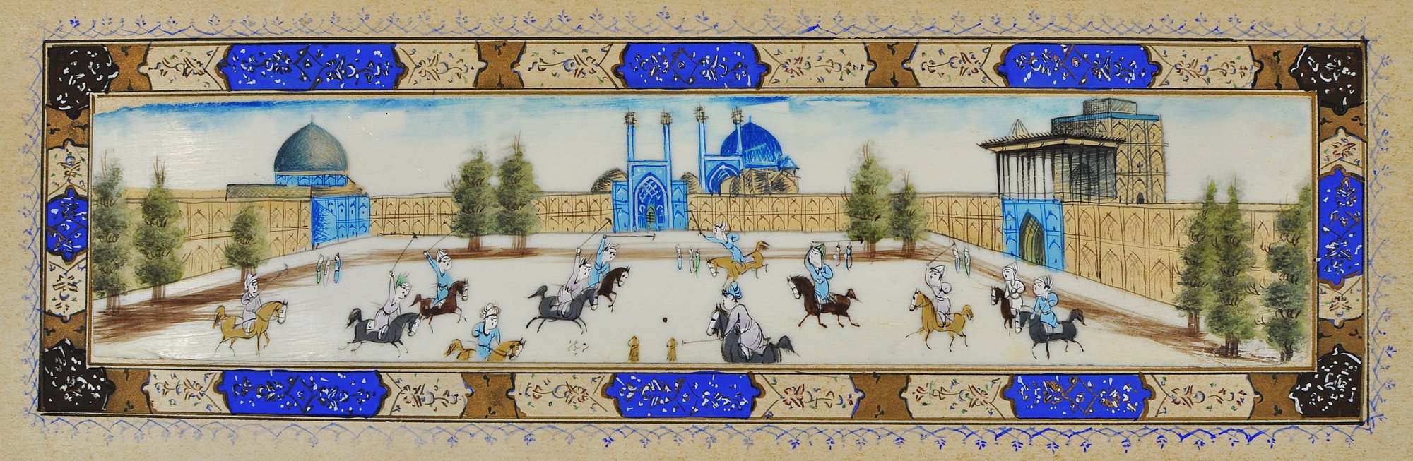 Finely detailed Persian-style miniature paintings on camel bone depicting a lively polo match (Chovgan game) within a walled courtyard in Naqsh-e Jahan Square in Isfahan, Iran. Executed in a traditional miniature manner with delicate figures, soft pastel tones, and an ornate decorative border.