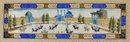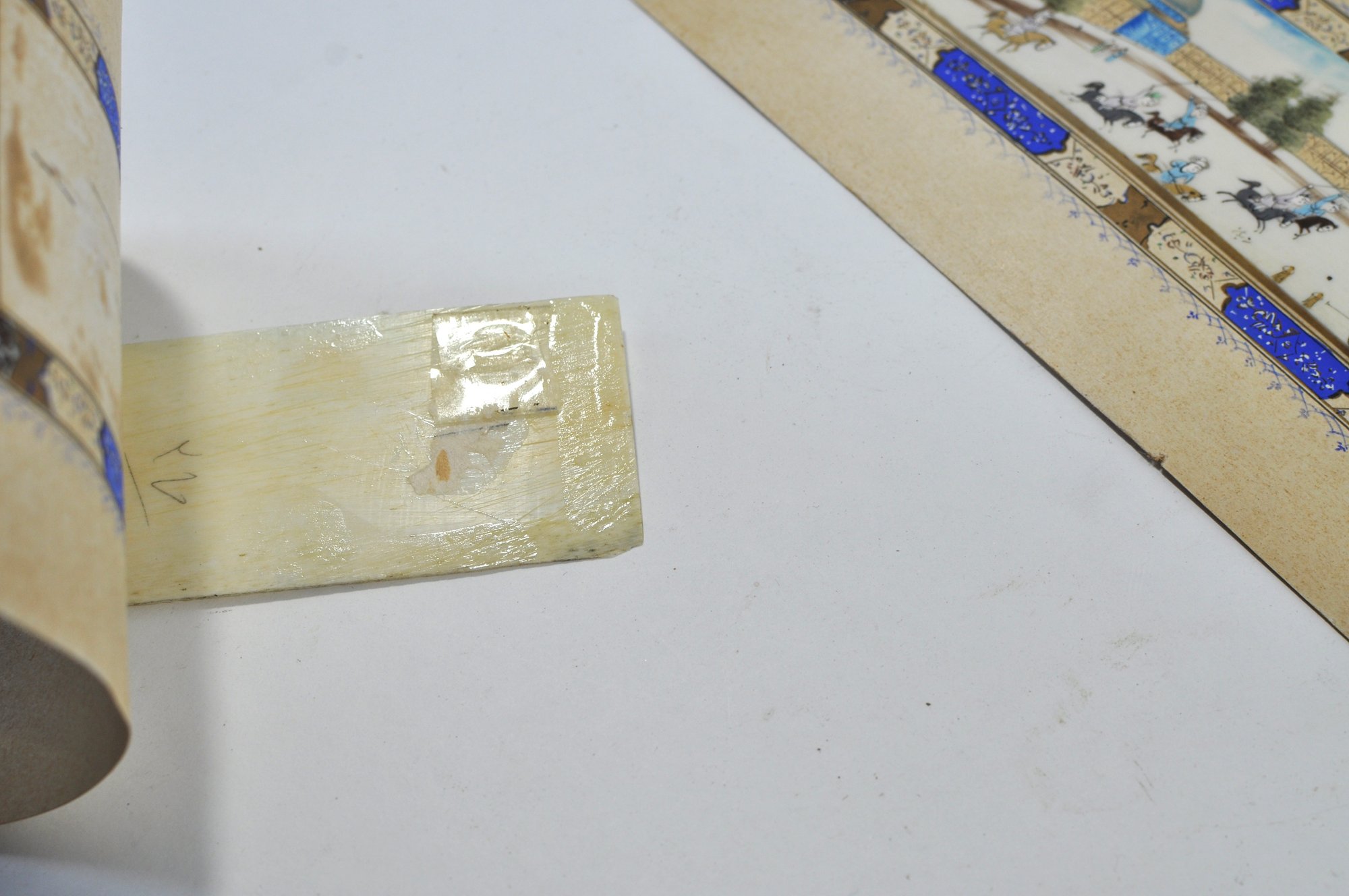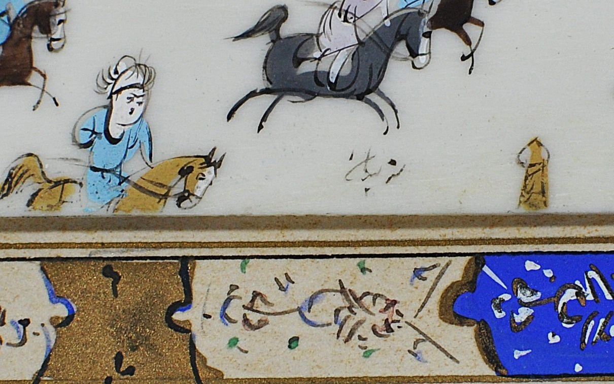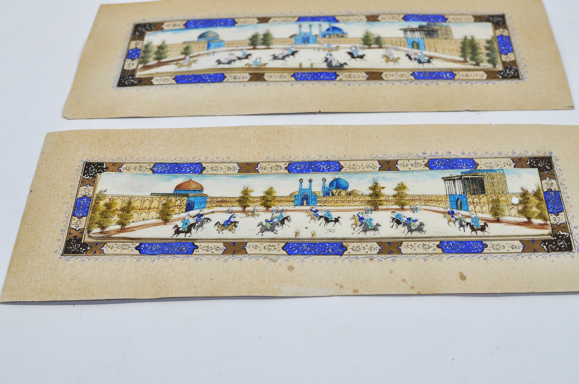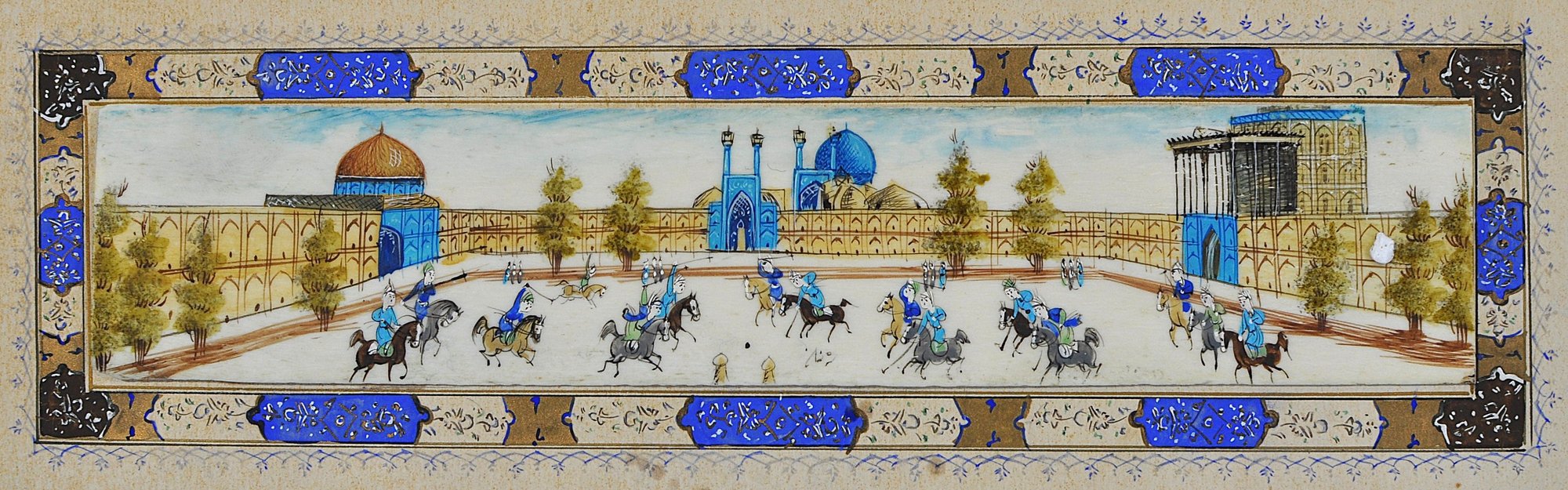 Finely detailed Persian-style miniature paintings on camel bone depicting a lively polo match (Chovgan game) within a walled courtyard in Naqsh-e Jahan Square in Isfahan, Iran. Executed in a traditional miniature manner with delicate figures, soft pastel tones, and an ornate decorative border.