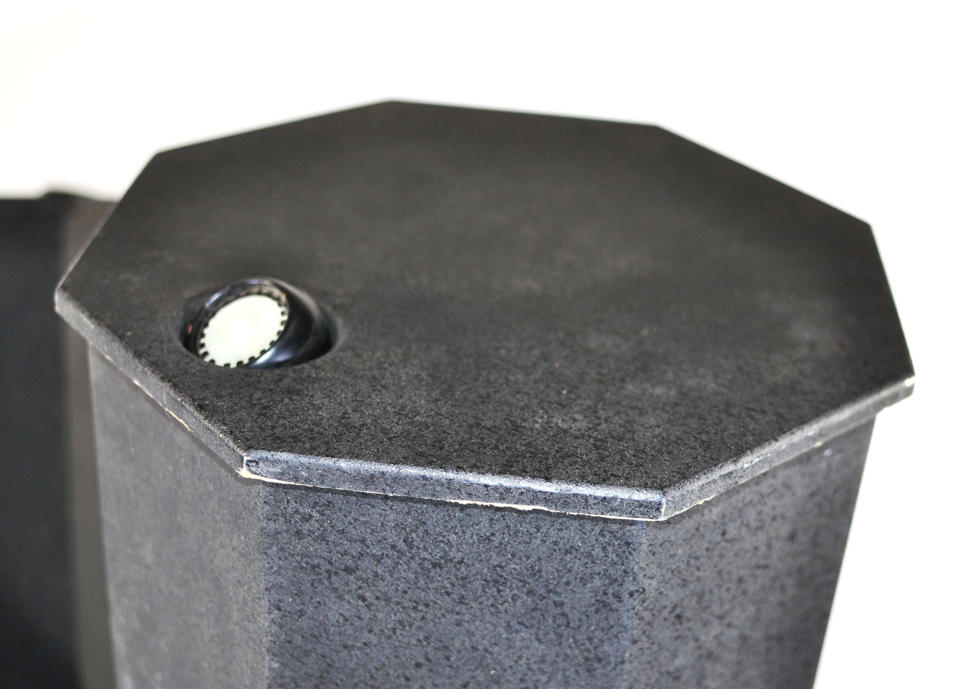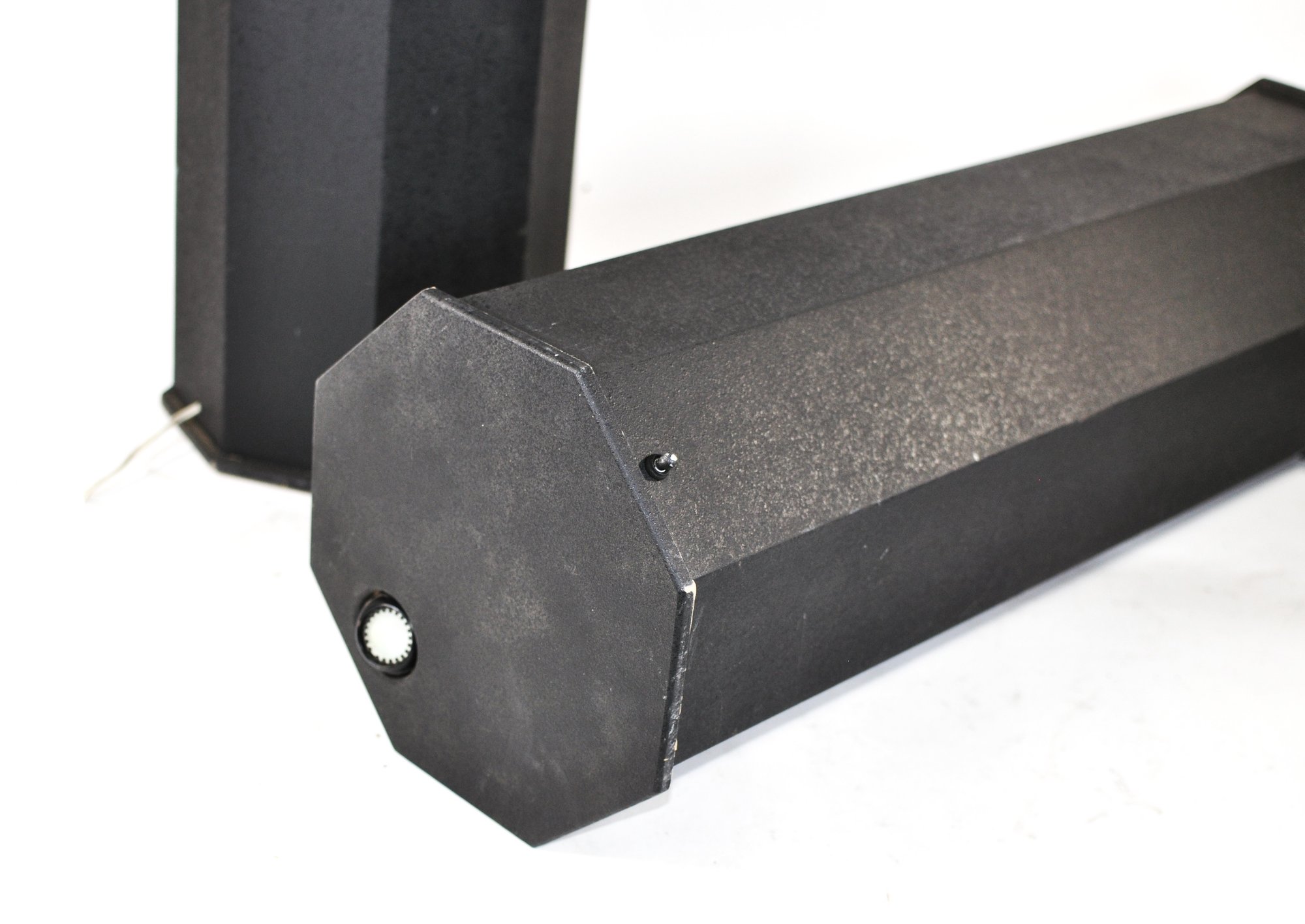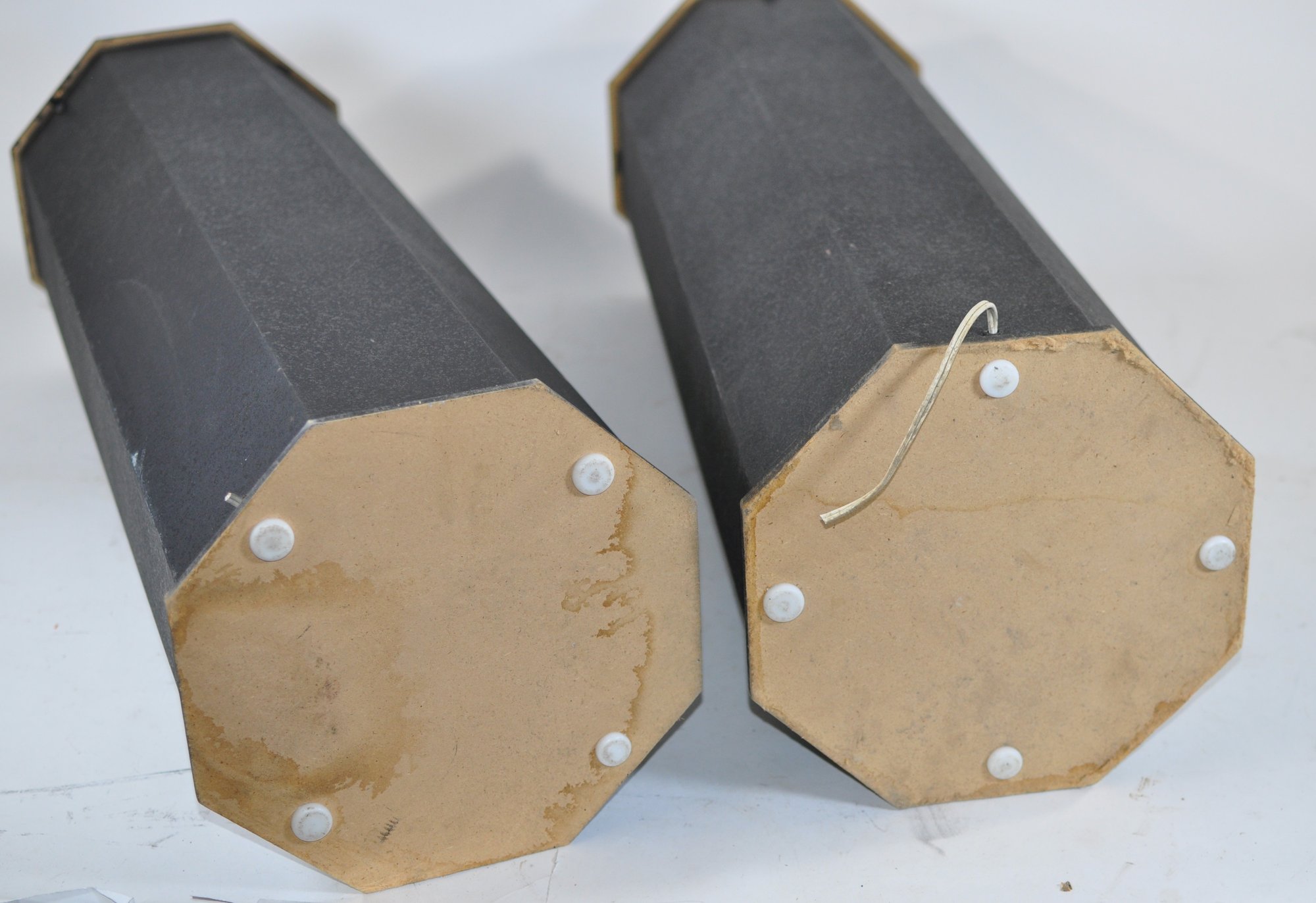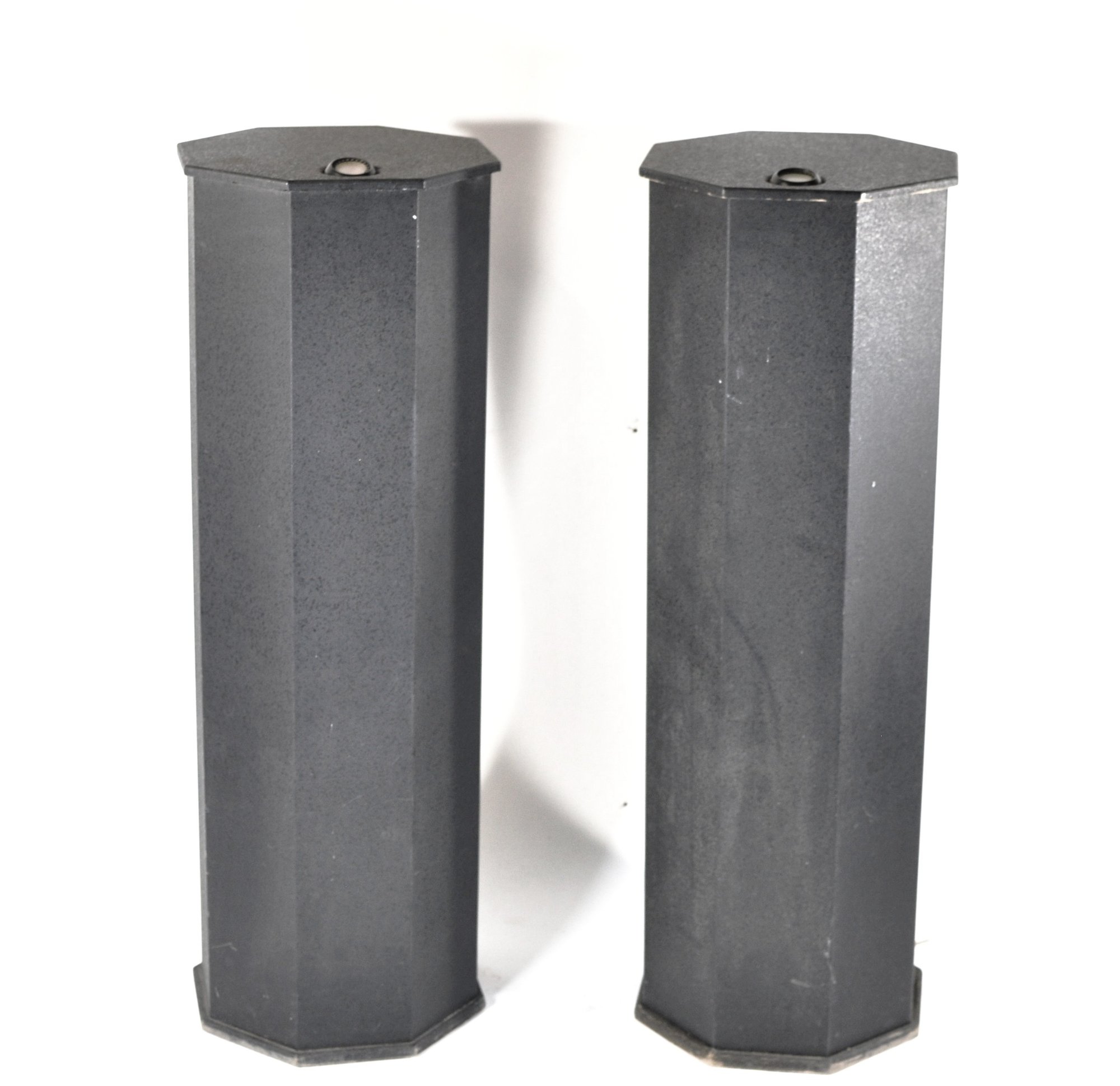Sturdy construction with wide octagonal bases and minimalist industrial look. Light wear consistent with age and use. Pickuponly.