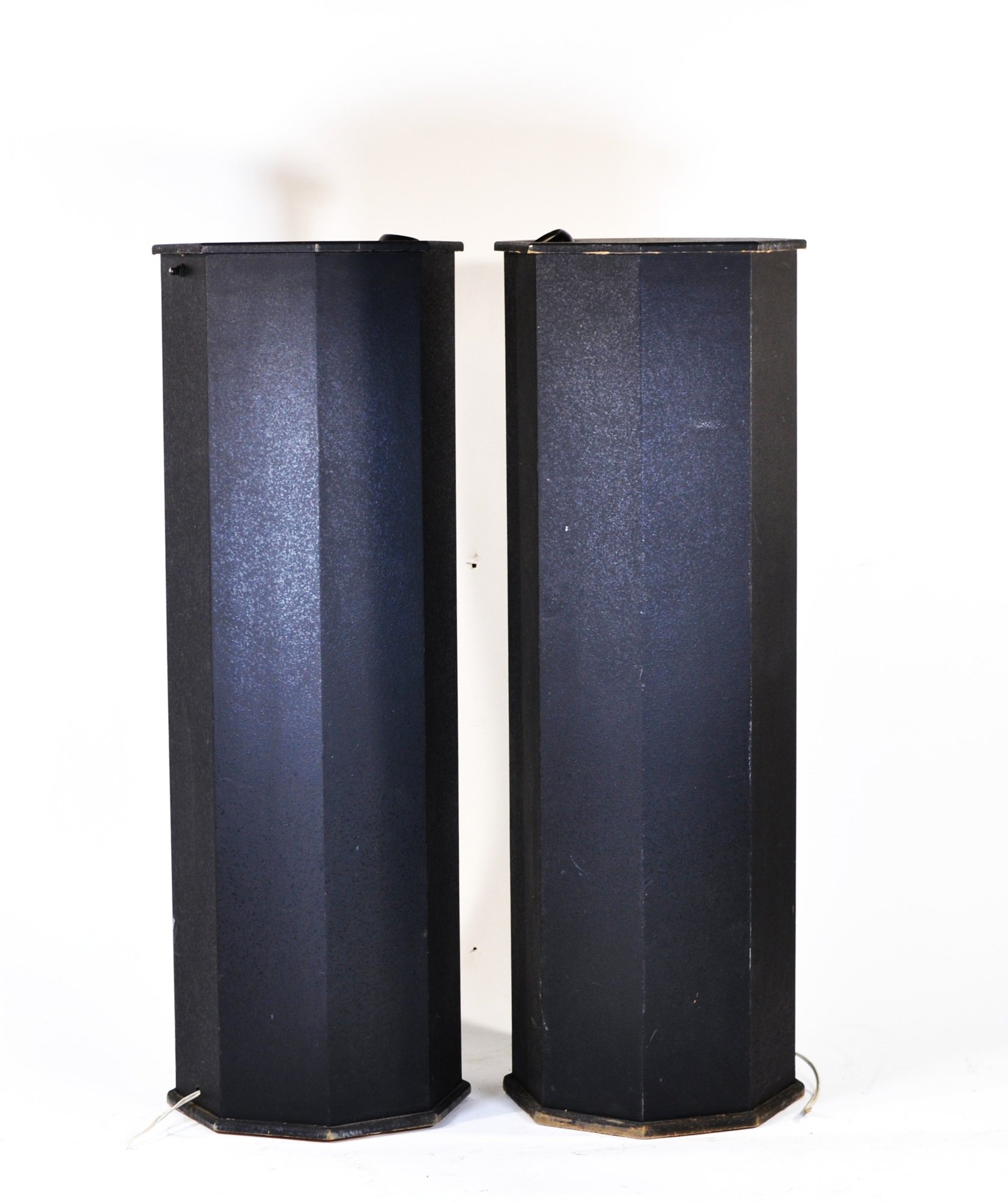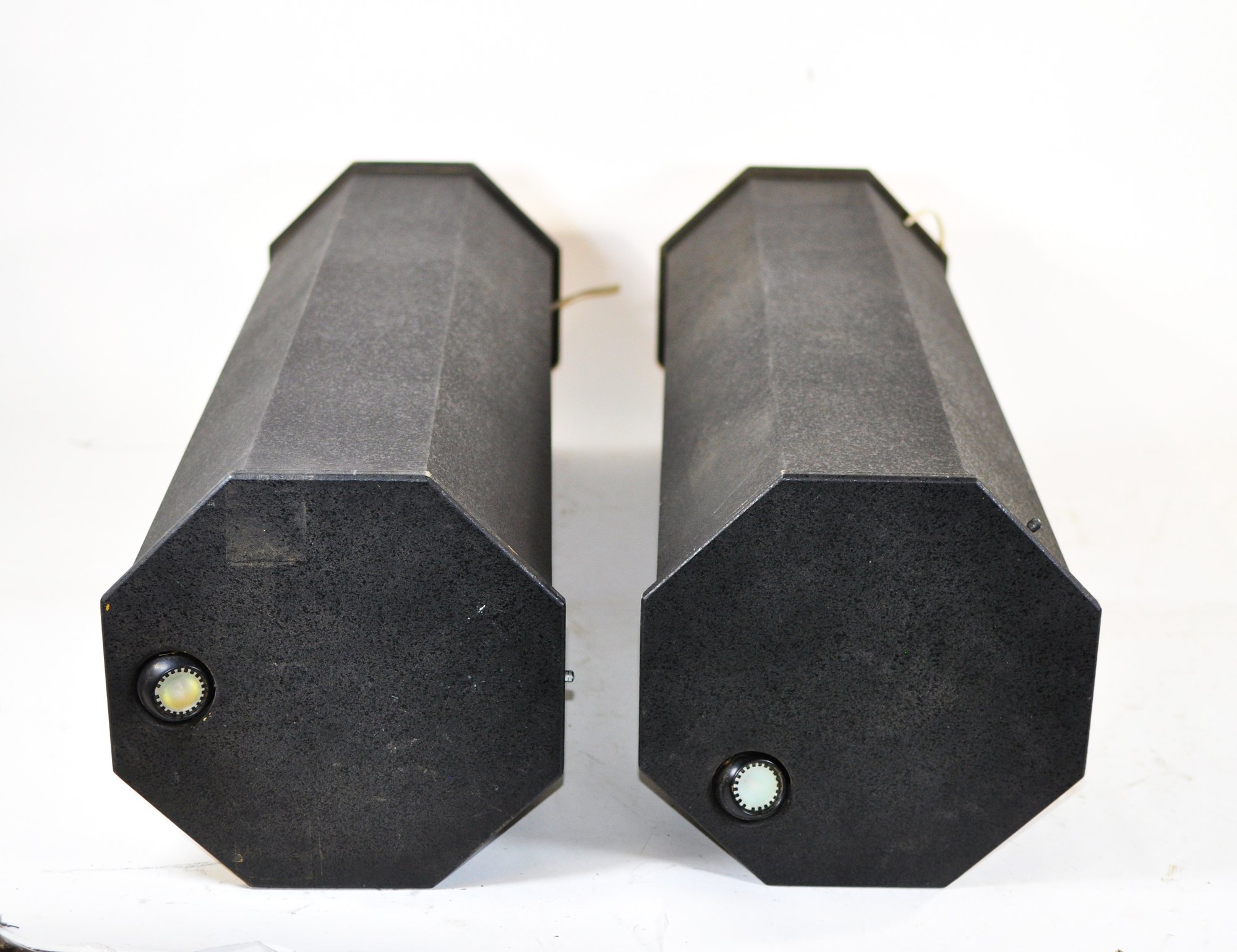 Pair of vintage modern-style pedestal stands in faceted black panels , originally fitted with swiveling eyeball halogen lights (lights removable if not needed). Clean architectural form ideal for displaying sculptures, vases, or decorative objects in a home, gallery, or showroom setting.