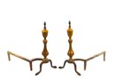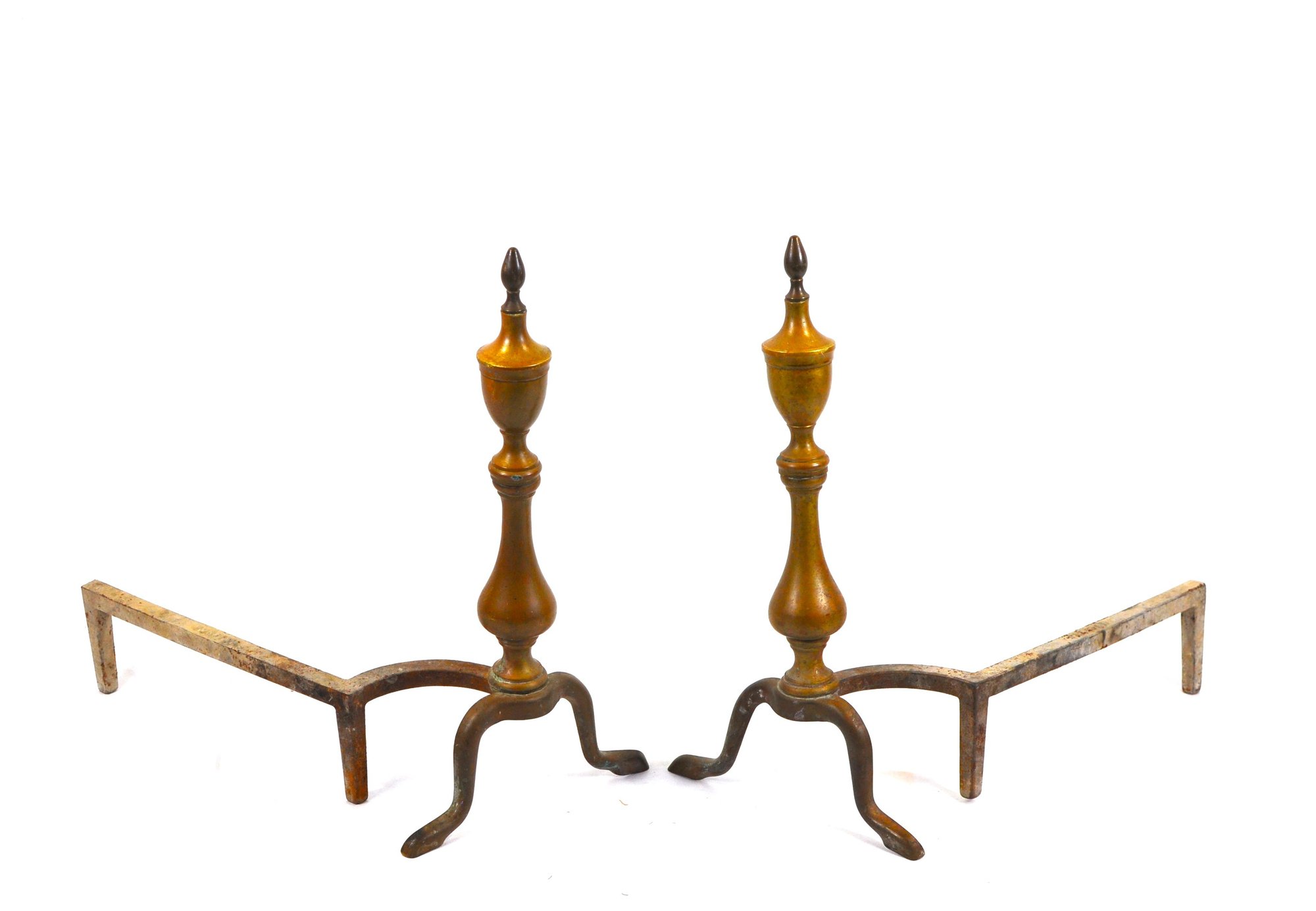 Classic pair of antique brass and iron andirons featuring turned urn finials and graceful curved legs. The brass tops have a warm aged patina, while the iron supports retain natural wear from use.