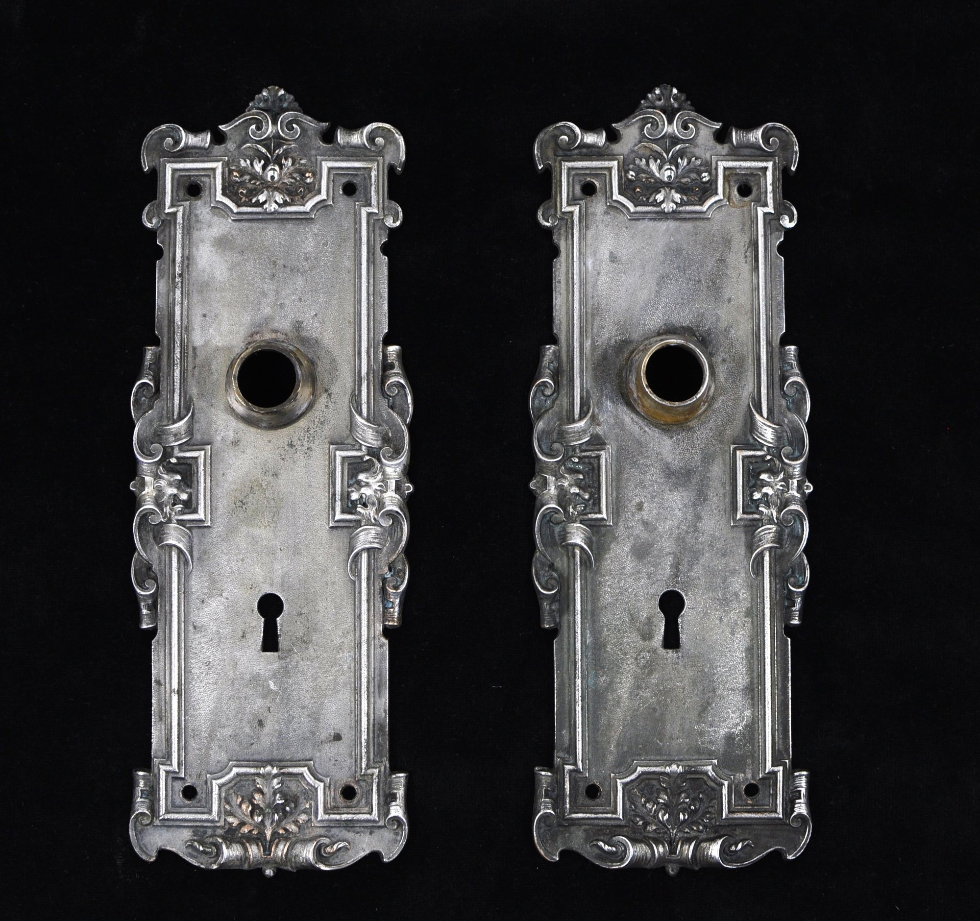 Matching pair of antique brass door backplates with ornate Victorian-style scroll and floral detailing. Each has a knob collar and skeleton keyhole. Original patina and silver plating wear from age; backs show oxidation. Measure approx. 9-5/8" tall.