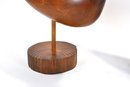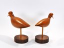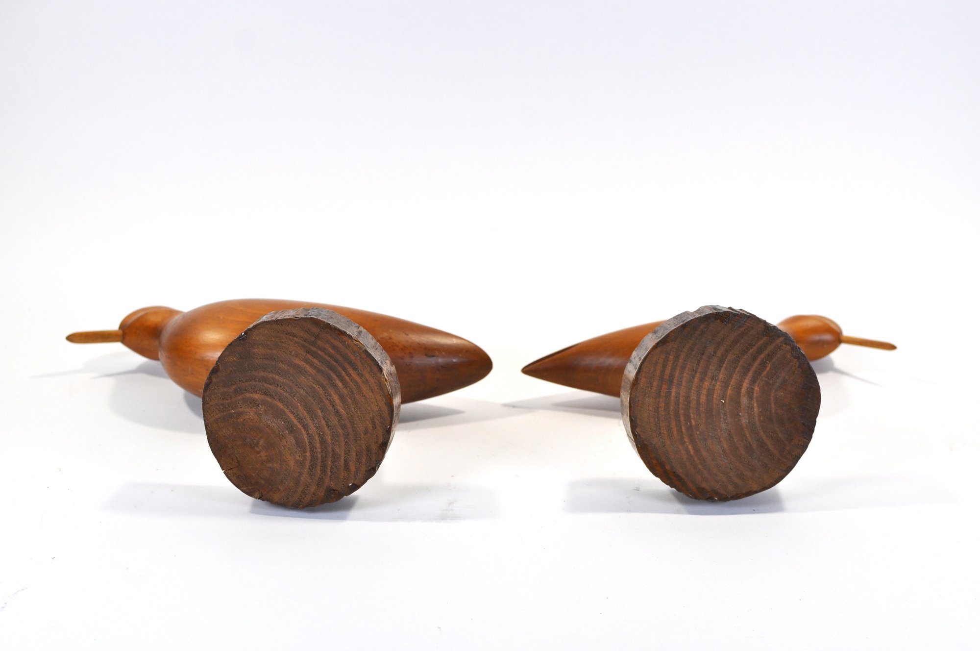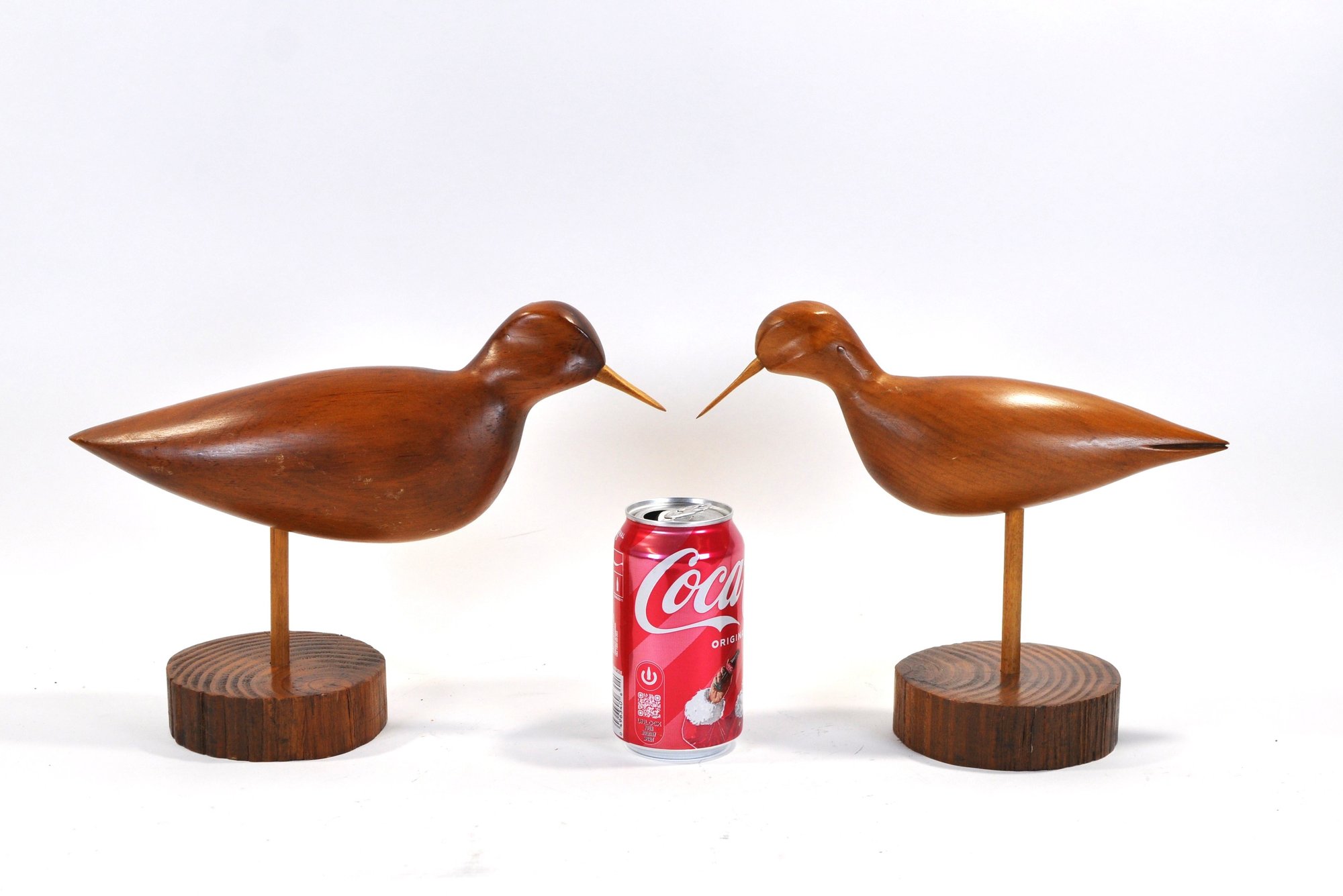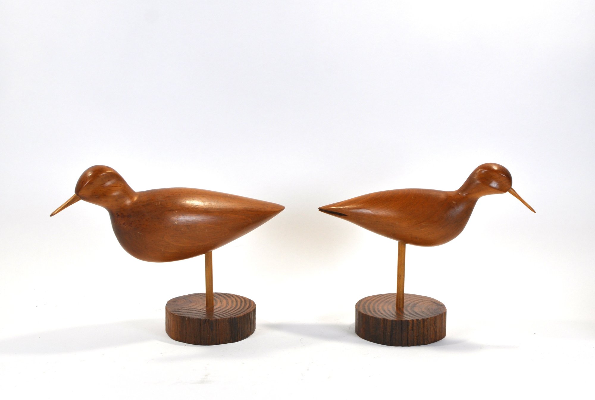 Pair of hand-carved wooden shorebirds mounted on slender posts with round wood bases. Smooth, minimalist carvings with long pointed bills and warm natural wood finish. Likely sandpiper-style birds, displaying well as mid-century coastal décor.