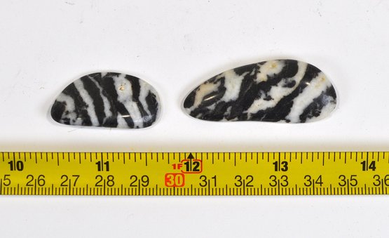 Pair of polished stone cabochons featuring striking black and white banded patterns commonly known as Zebra Jasper. Smooth, glossy finish with bold natural striping. Ideal for jewelry making, lapidary projects, or mineral collections.