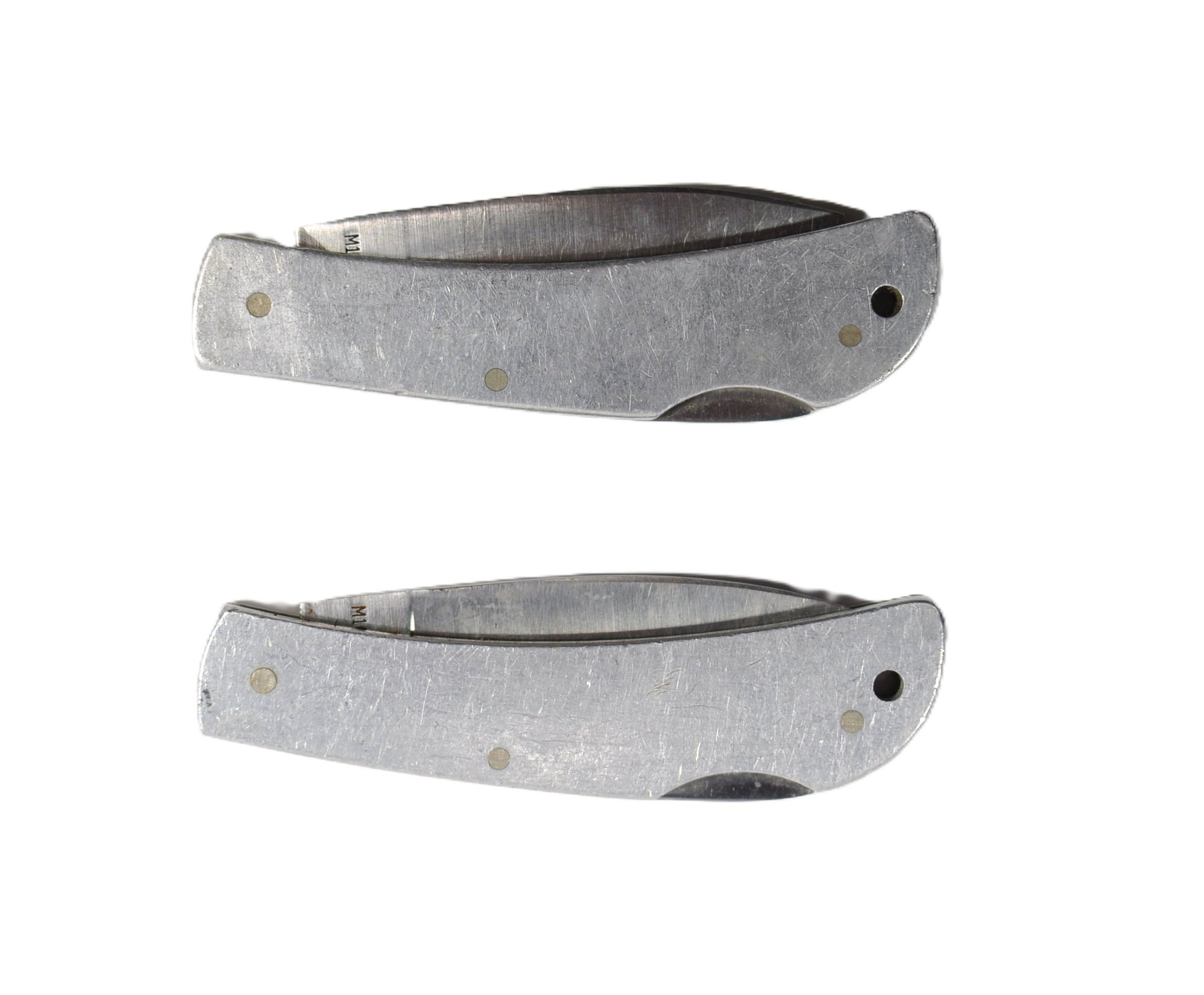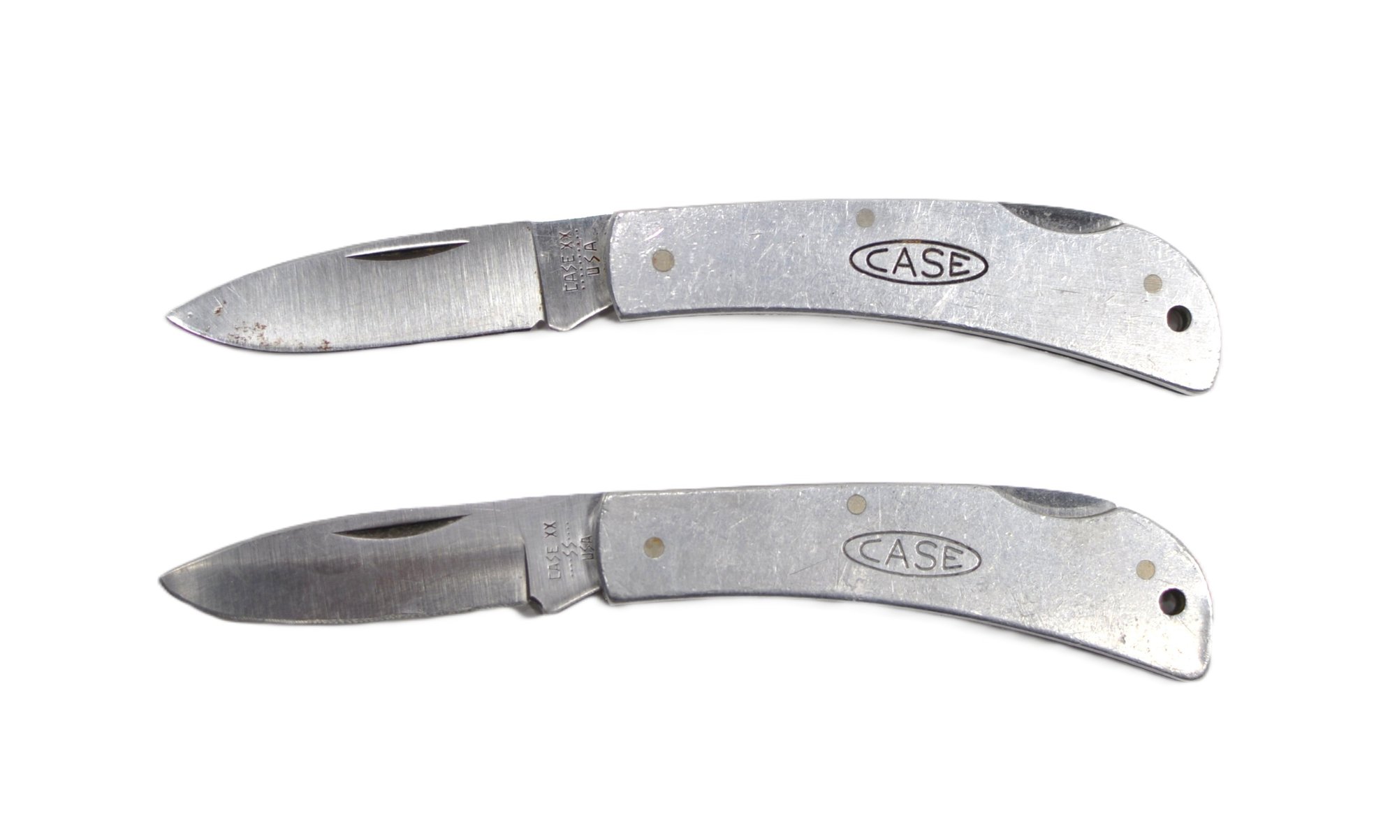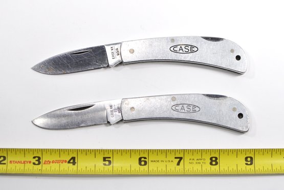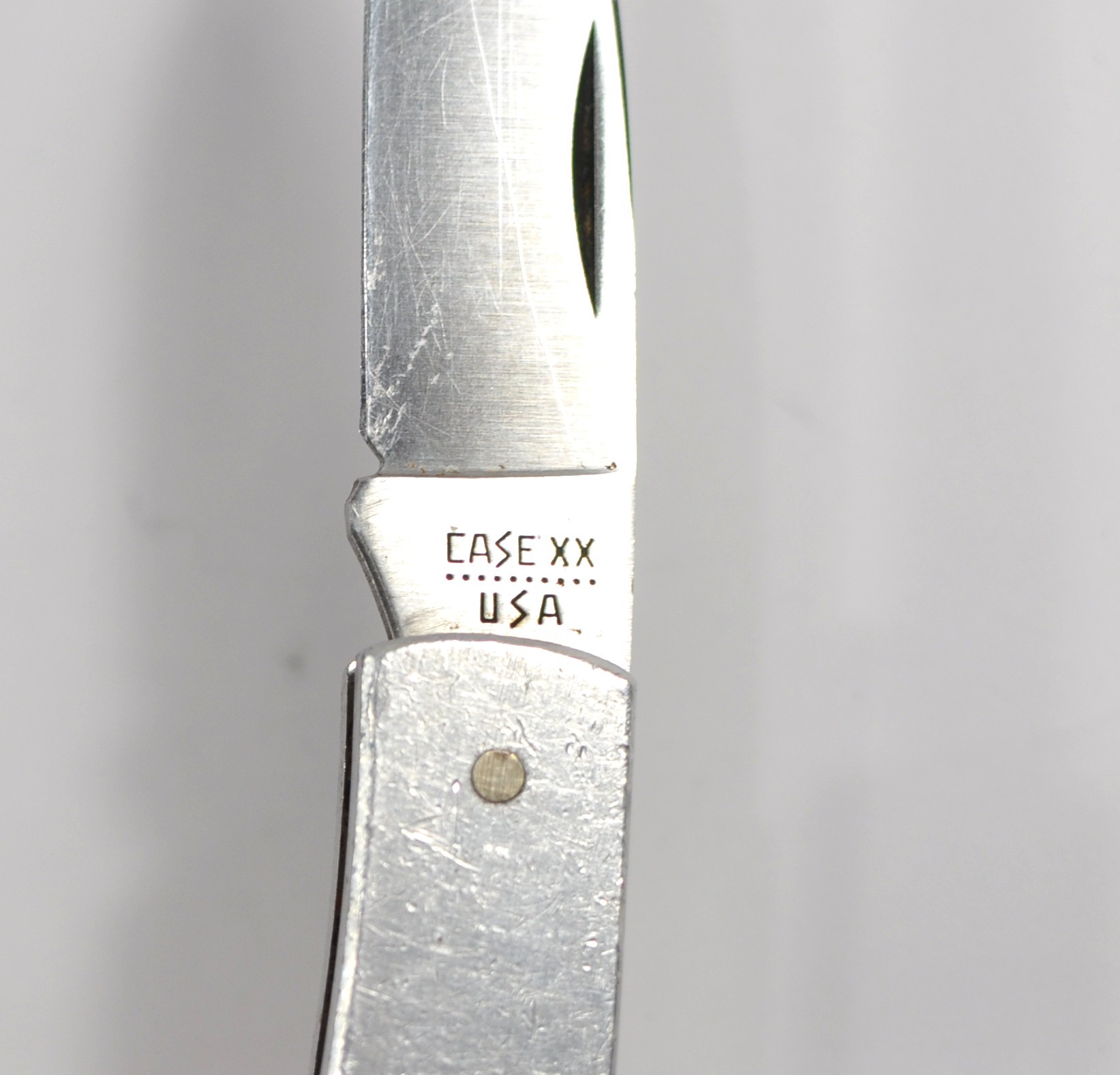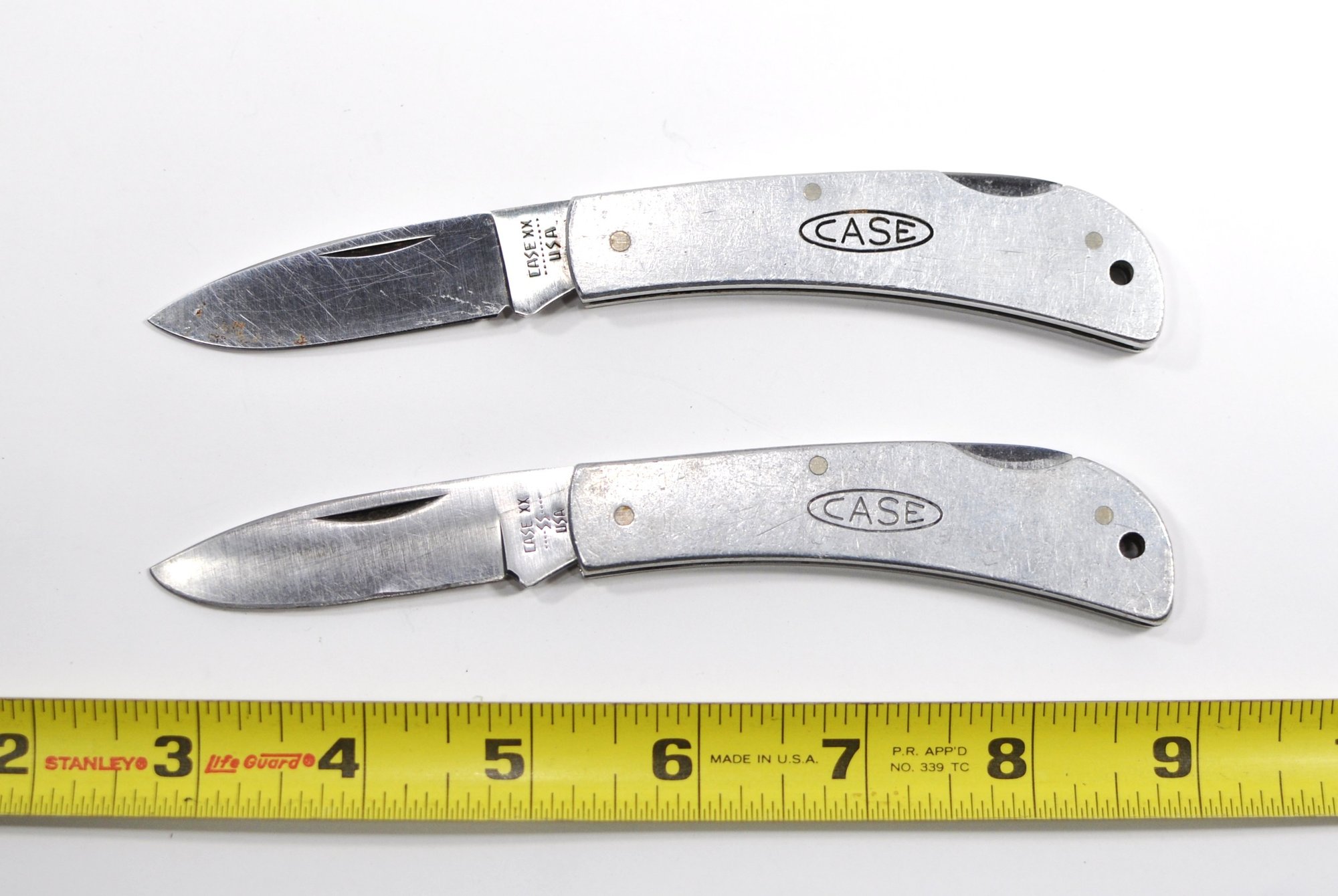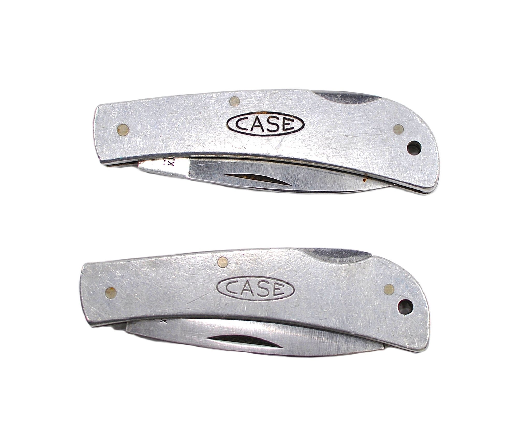 Offered is a matched pair of vintage Case XX folding pocket knives, each featuring a single stainless steel blade with nail nick and aluminum handle scales. Both blades are stamped “CASE XX USA”, with additional tang/model markings visible (see close-up photos). Classic mid-century Case construction with smooth action and traditional pocket-knife profiles.