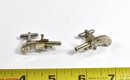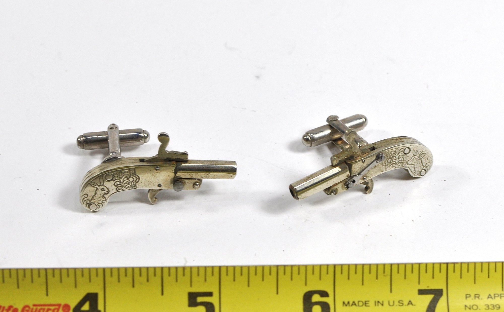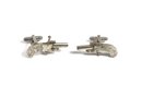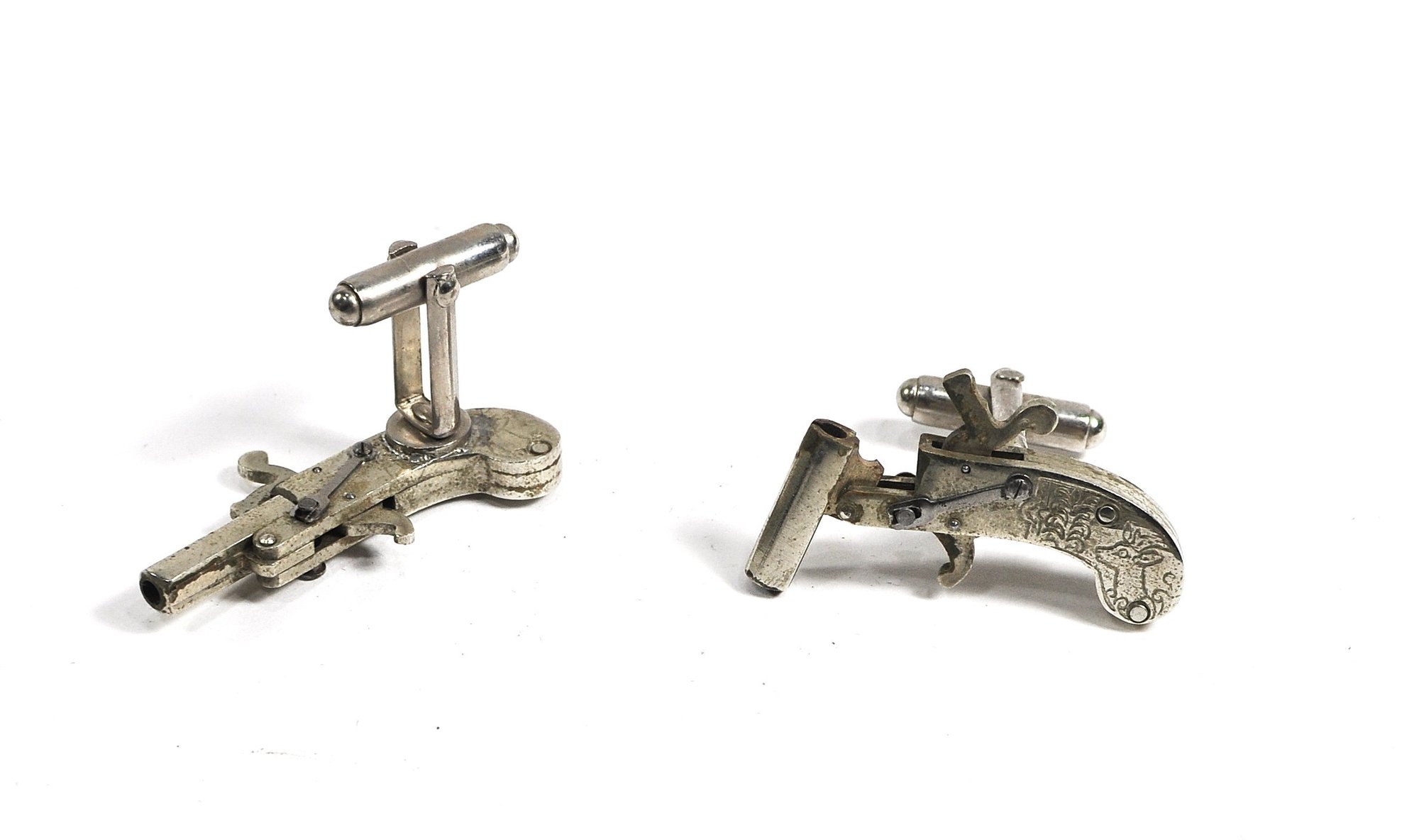 Pair of vintage novelty cufflinks modeled as miniature pistols, featuring articulated derringer-style forms with engraved decorative details. Each cufflink is constructed with hinged elements and a toggle back, giving them a charming mechanical appearance. Beyond their novelty appeal, these cufflinks incorporate functional 2mm pinfire mechanisms. Working fine. Measure only 1.5" long.