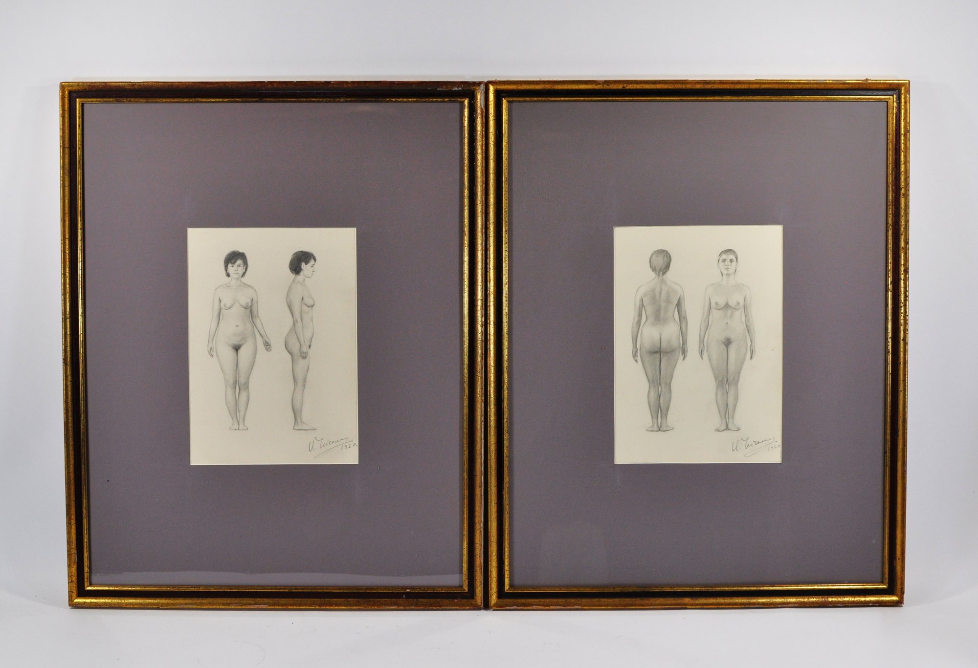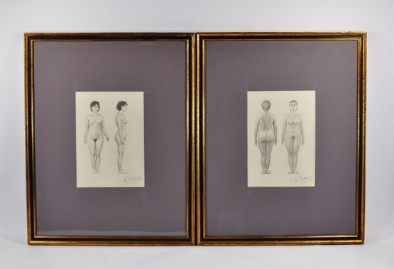 Pair of finely rendered graphite figure studies depicting a standing female nude in multiple anatomical views — front, side, and back. Each drawing is signed and dated 1960, demonstrating classical academic technique and anatomical precision. Presented in matching gilt-edged frames with gray mats.