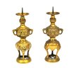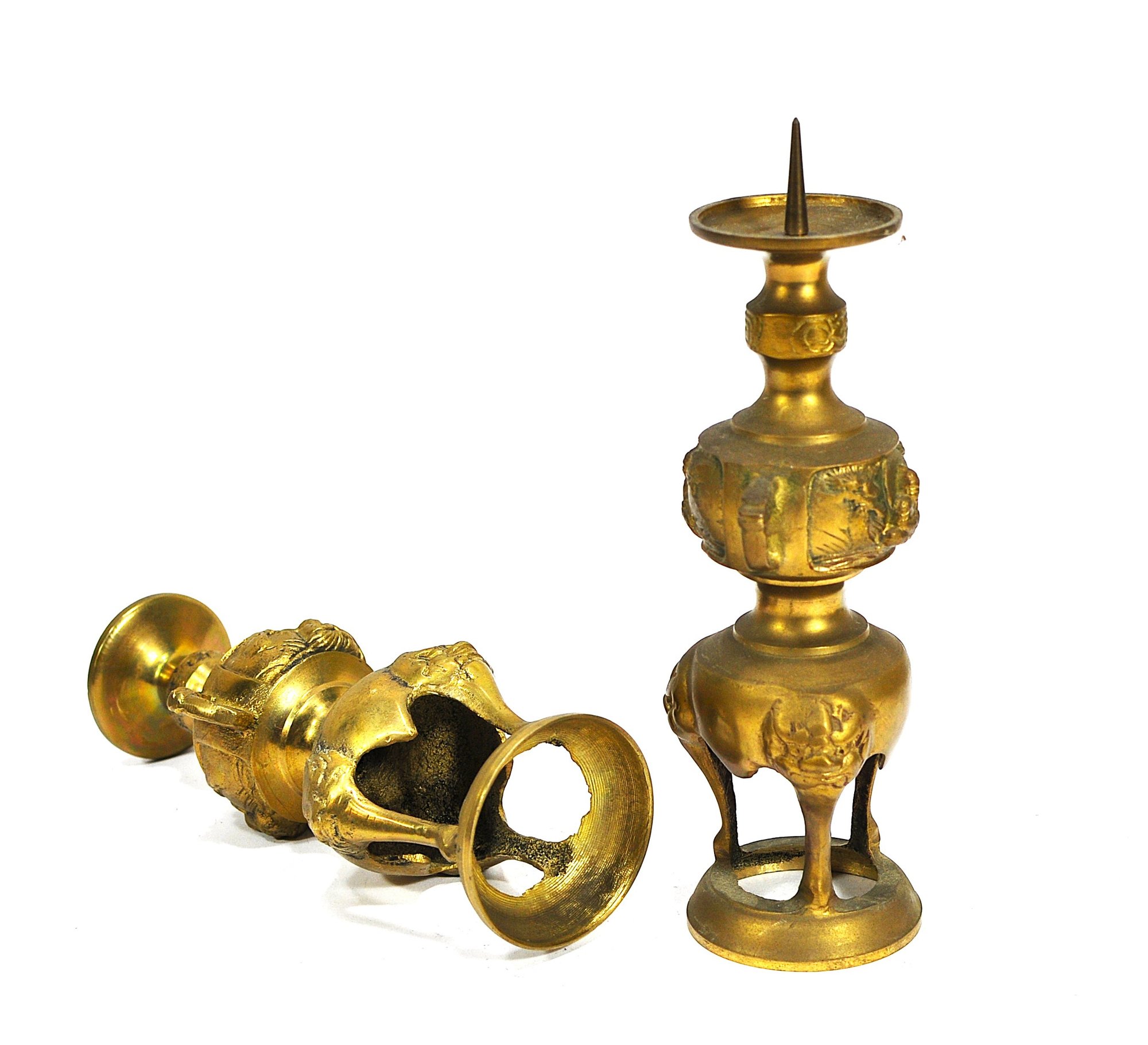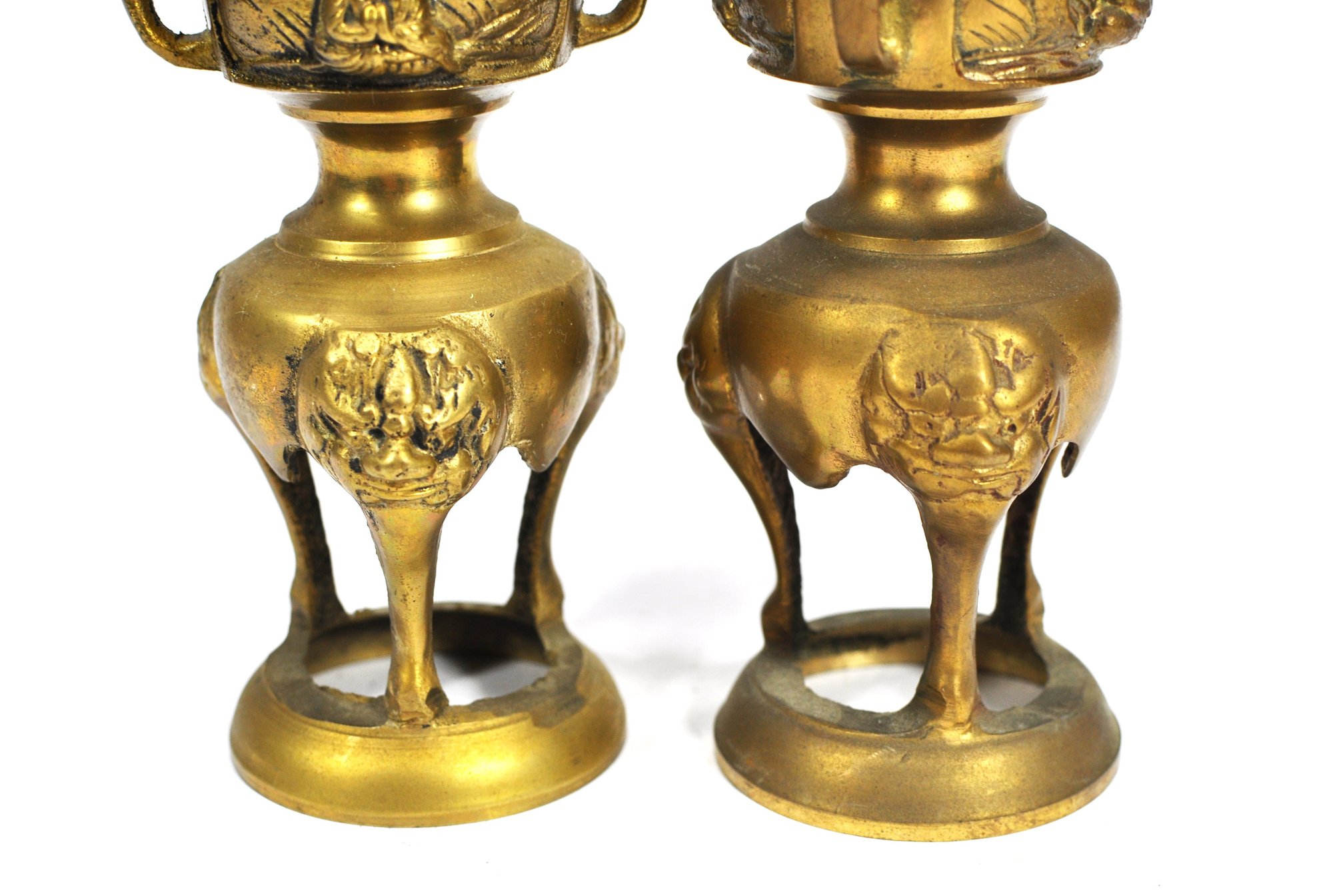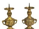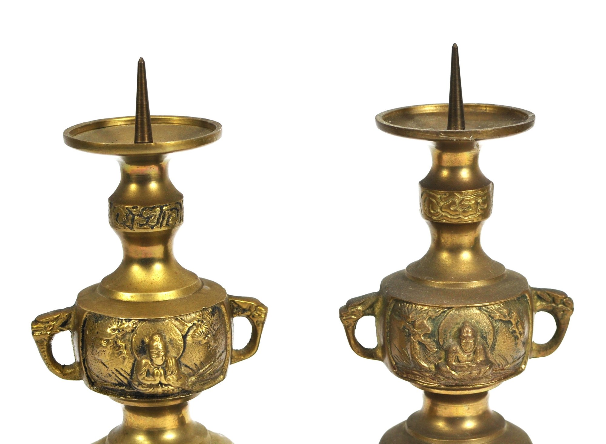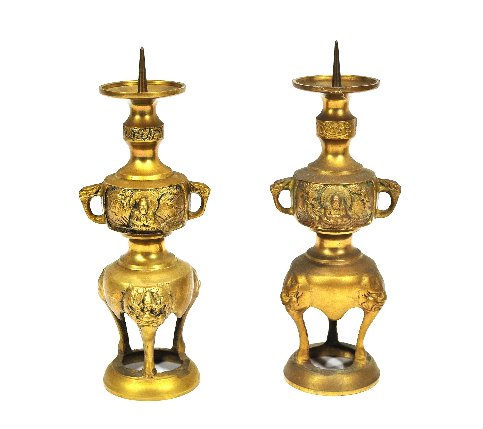 Matched pair of cast brass altar candlesticks in traditional Chinese form, each featuring a pricket spike for securing candles. The bodies are decorated with relief panels depicting seated Buddha figures, flanked by stylized dragon motifs around the neck. The lower section is supported by three legs with mask-like ornamentation, raised on a circular base.